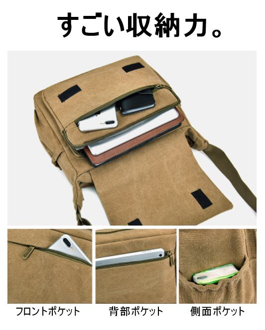 スマホやタブレットを収納できる複数のポケットが付いた便利なショルダーバッグです。