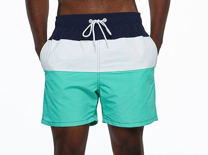 オーソドックスな形ながらトレンドのワイドシルエットの男性用ハーフパンツ水着です。