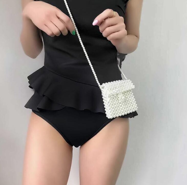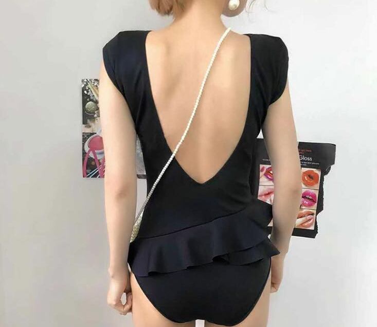 前から見るとシンプルなフリルの水着で露出も控えめですが、後ろから見ると大胆に背中が開いているセクシーな水着です。