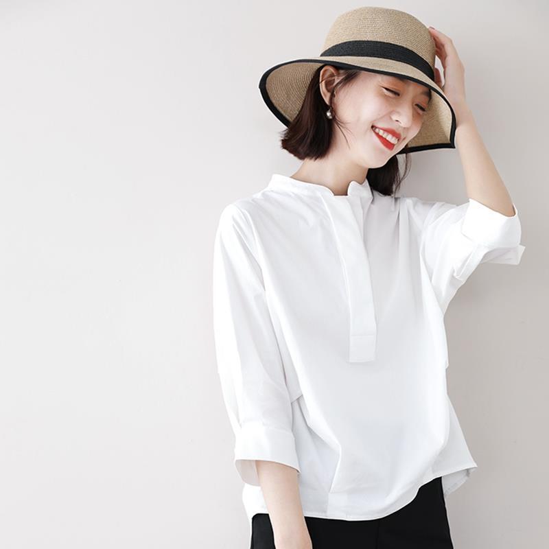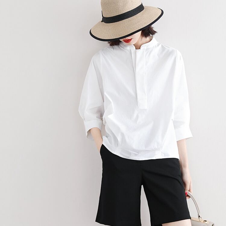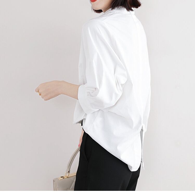 トップス シャツ カットソー 袖あり 七分袖 ハイネック 綿 きれいめ シンプル カジュアル 大人 上品 おしゃれ かっこいい 大人女子 こなれ感 ラフ フォーマル 無地 春 夏 秋 20代 30代 40代 レディース ビジネス OL 通勤 着回し 普段使い S M L ゆったり ゆる 白 ホワイト