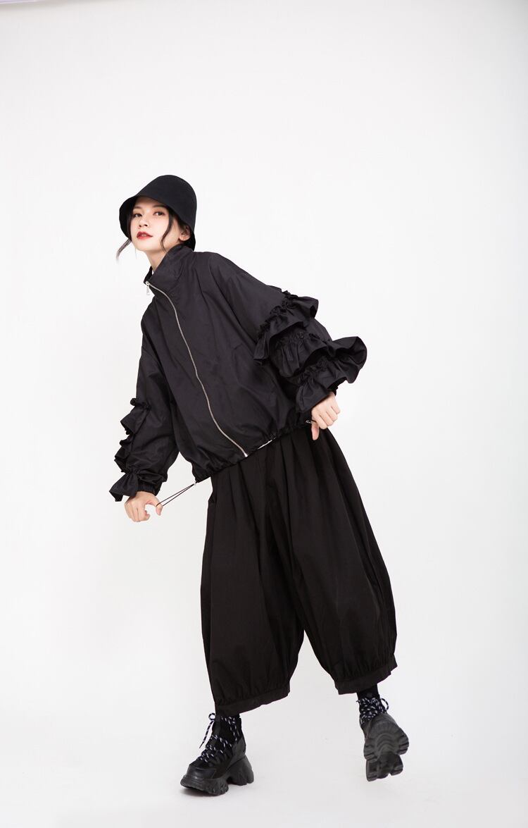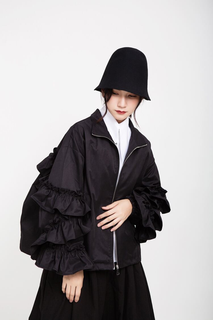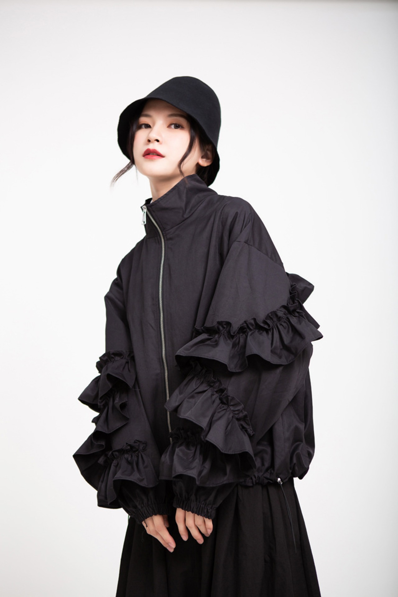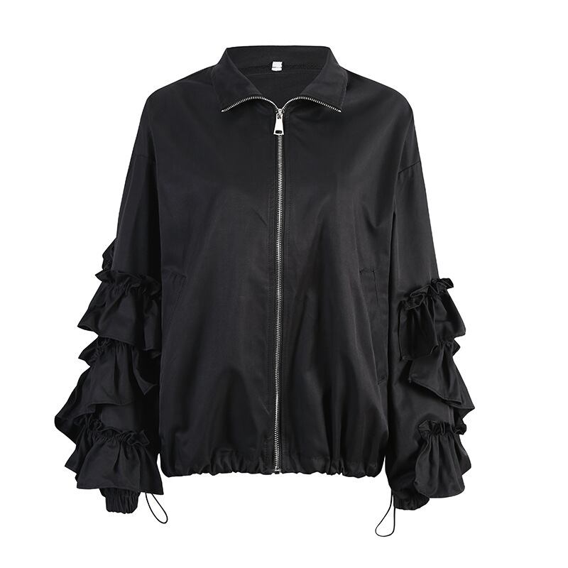 アウター ジャケット 袖あり 長袖 ボリューム袖 シフォン フリル ファスナー 前開き ポリエステル かわいい カジュアル おしゃれ お洒落 かっこいい ラフ メンズライク ラブリー キュート ガーリー ルーズ 個性的 モード系 ヴィンテージ風 無地 10代 20代 デート お出かけ 女子会 韓国系 オルチャン ファッション M L 黒 ブラック