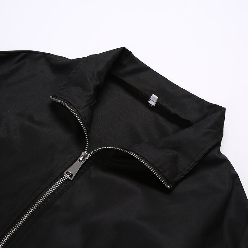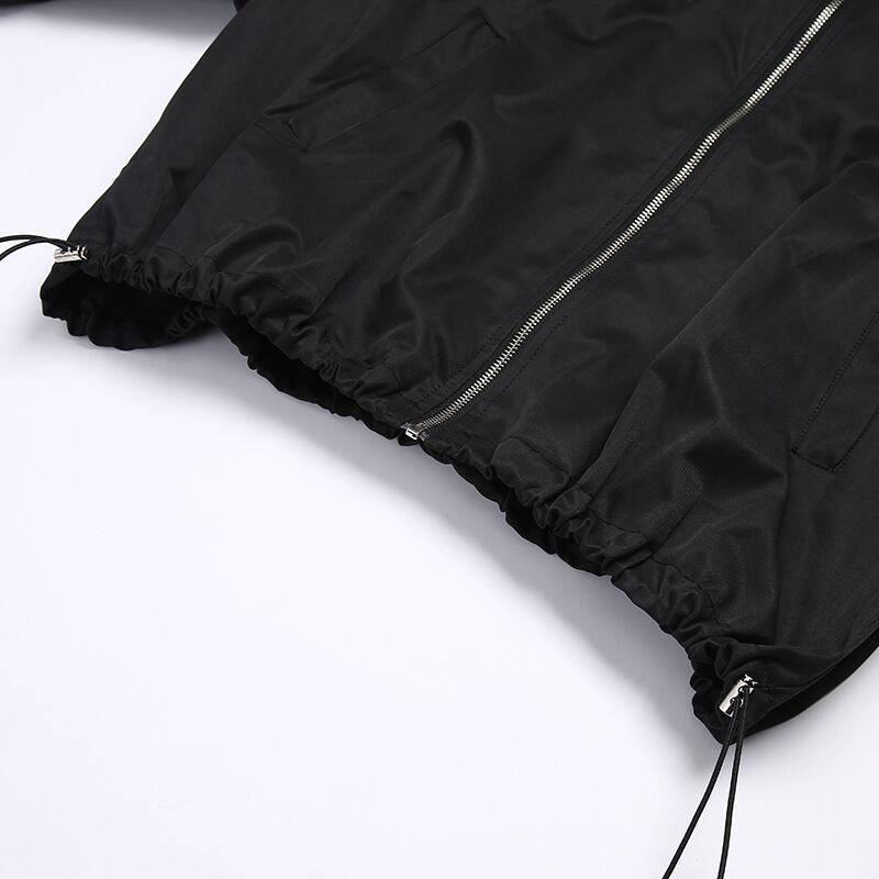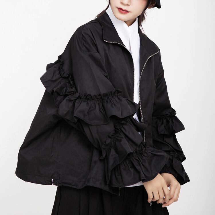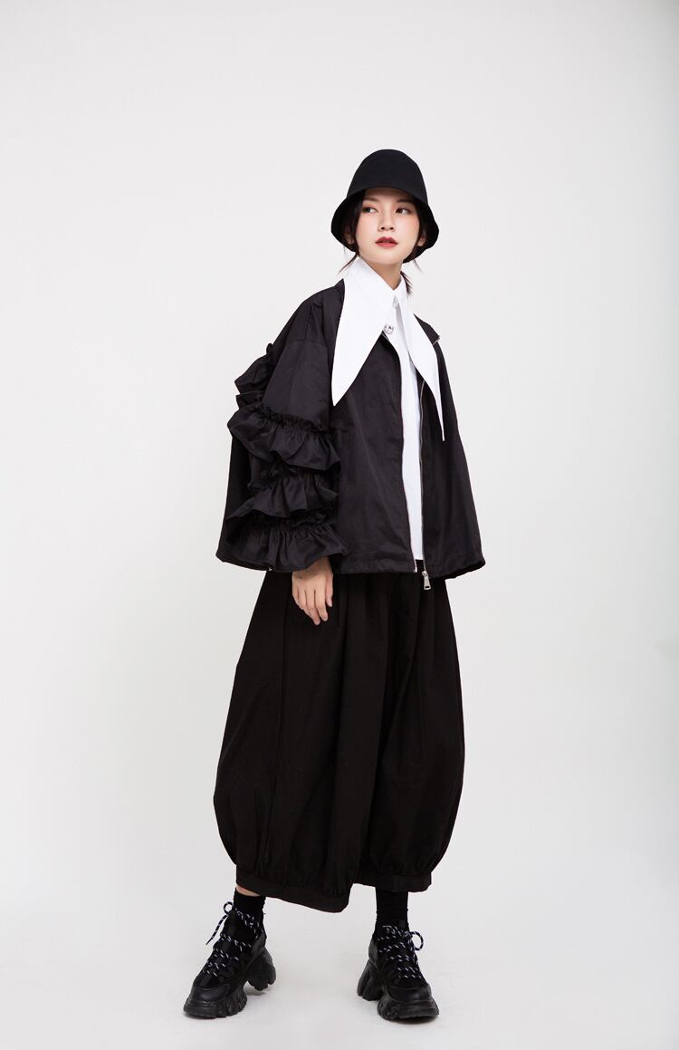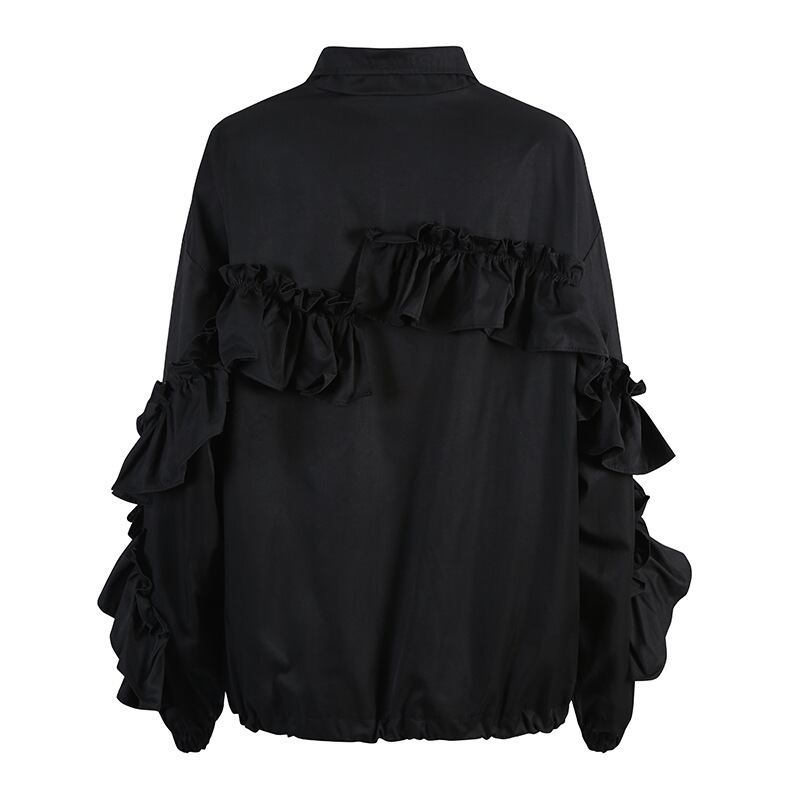 アウター ジャケット 袖あり 長袖 ボリューム袖 シフォン フリル ファスナー 前開き ポリエステル かわいい カジュアル おしゃれ お洒落 かっこいい ラフ メンズライク ラブリー キュート ガーリー ルーズ 個性的 モード系 ヴィンテージ風 無地 10代 20代 デート お出かけ 女子会 韓国系 オルチャン ファッション M L 黒 ブラック