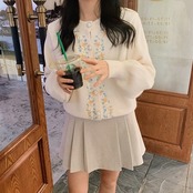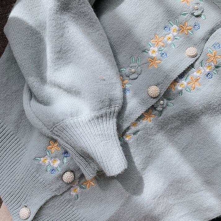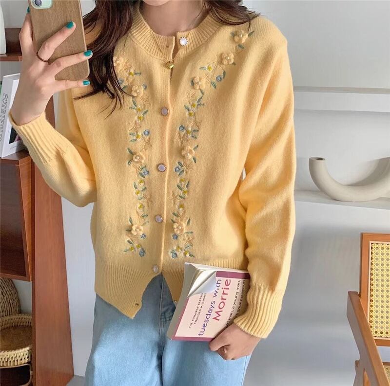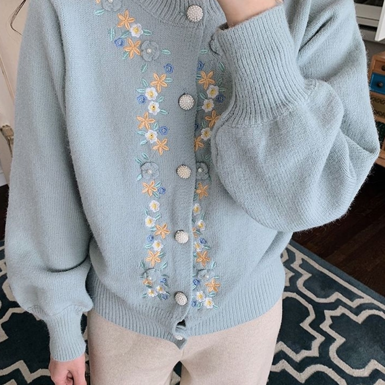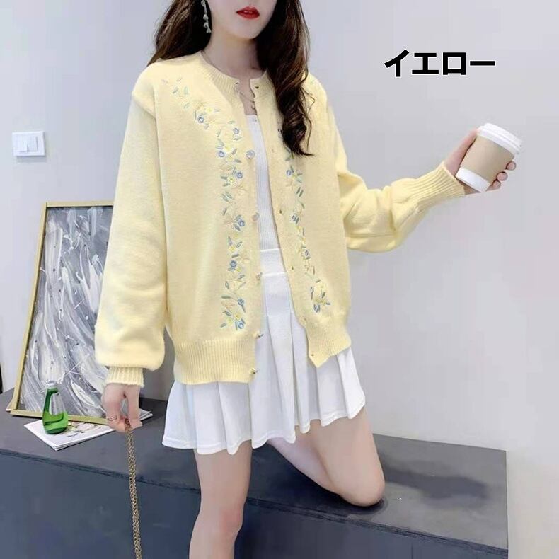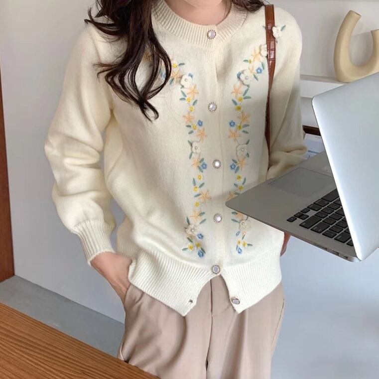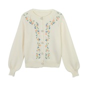 立体感のある花柄刺繍とビジューボタンがレトロで上品なカーディガンです。