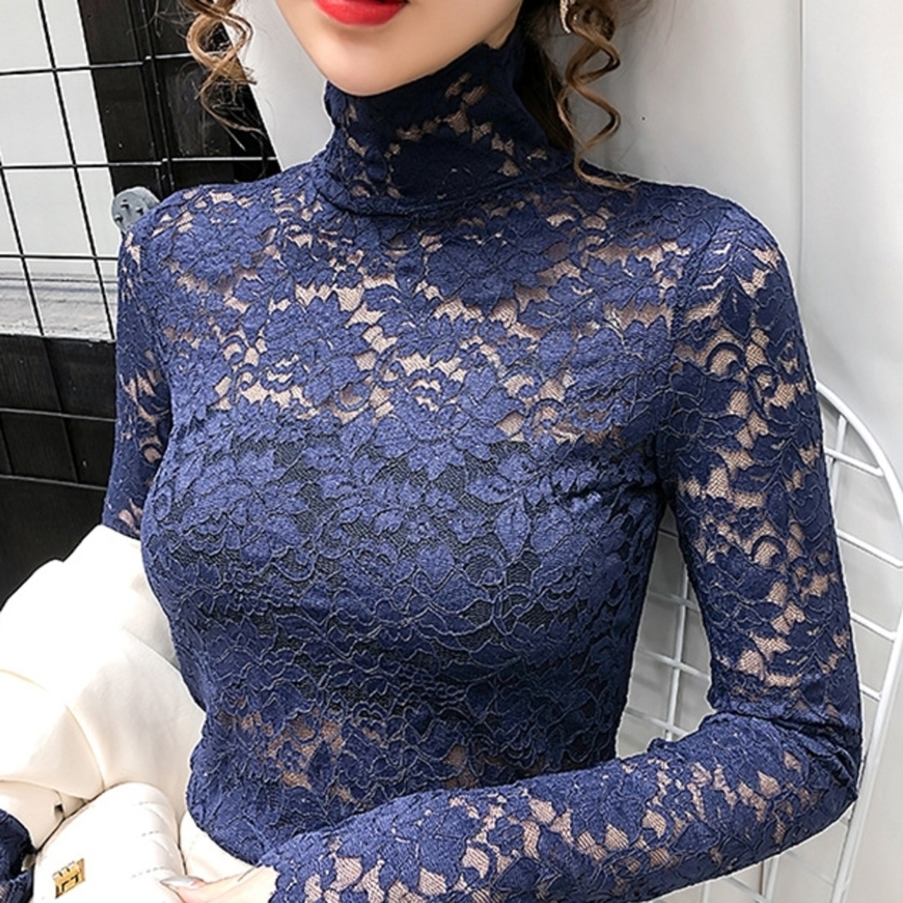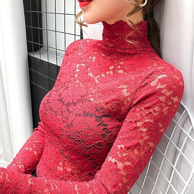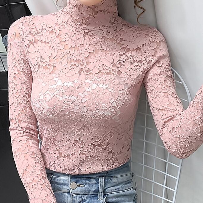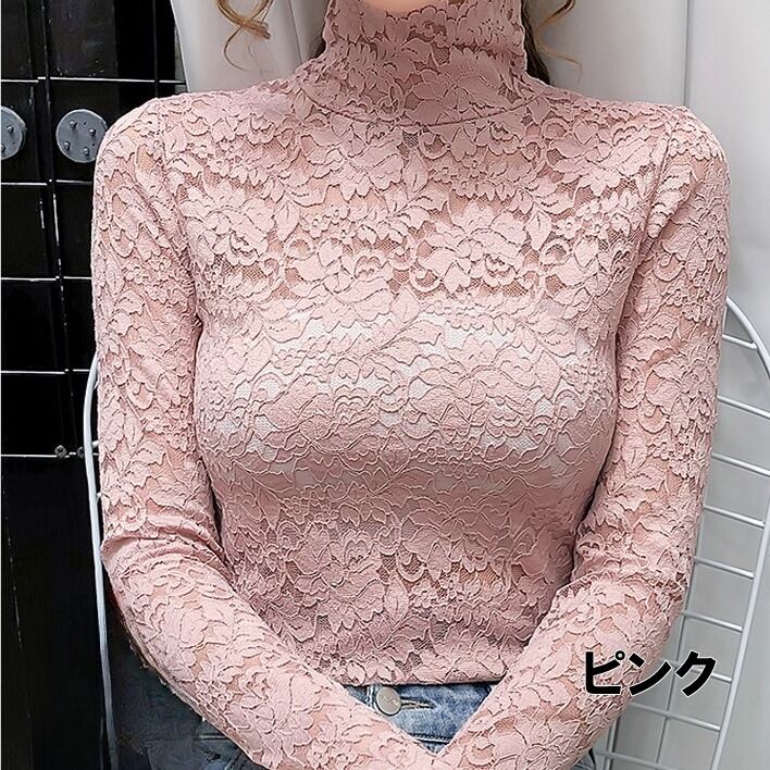 花柄総レースの透け感を活かしたタイトなハイネックブラウスです。