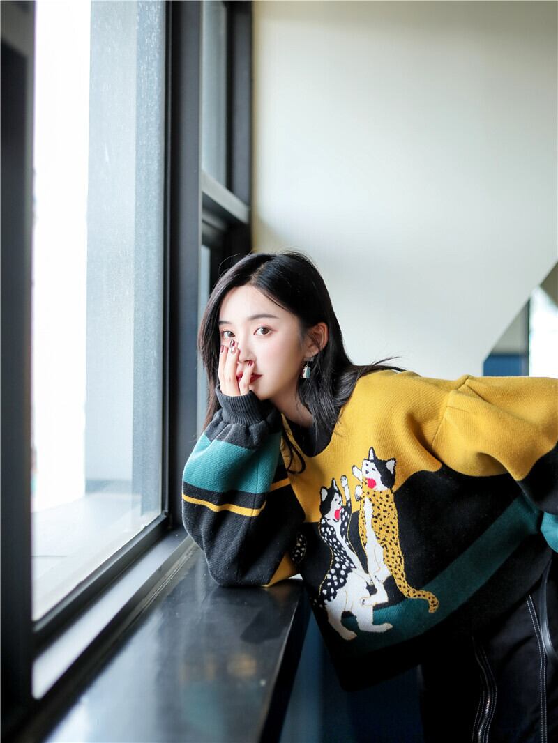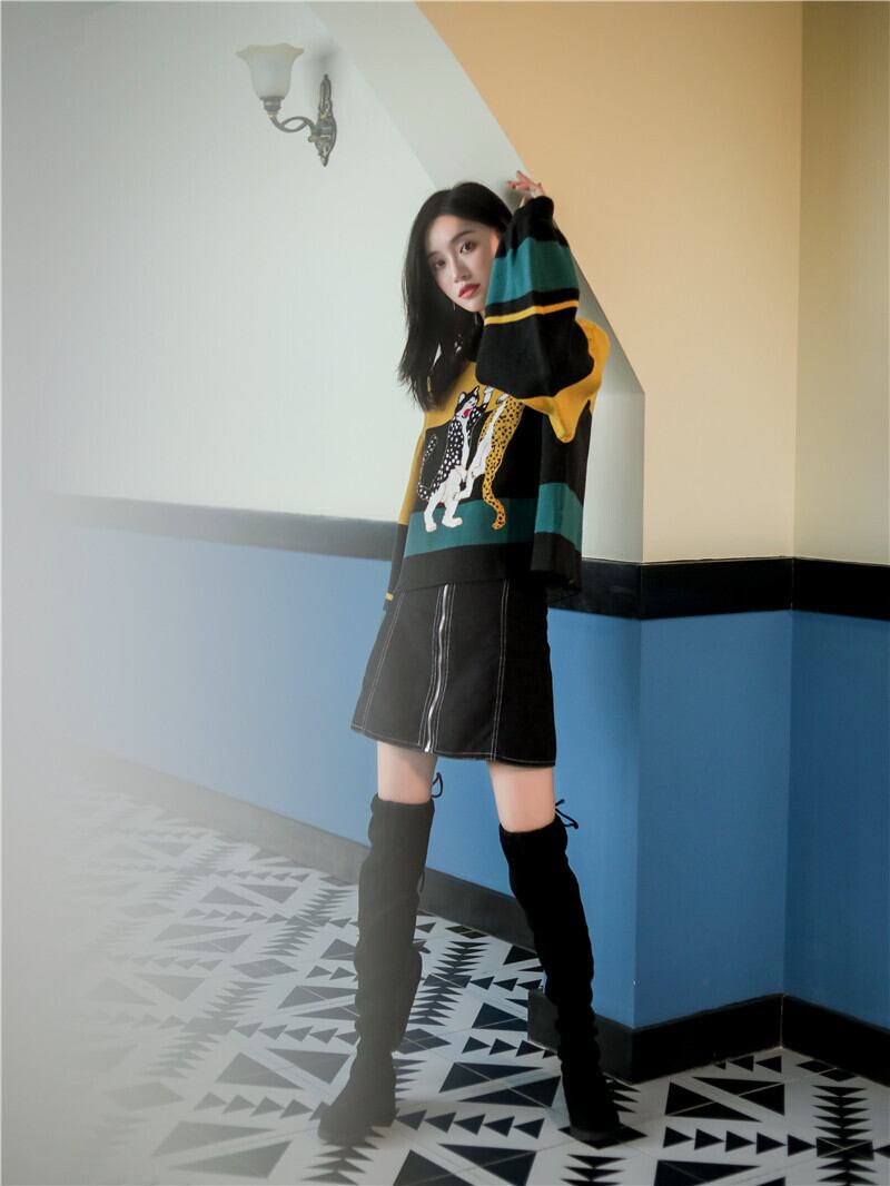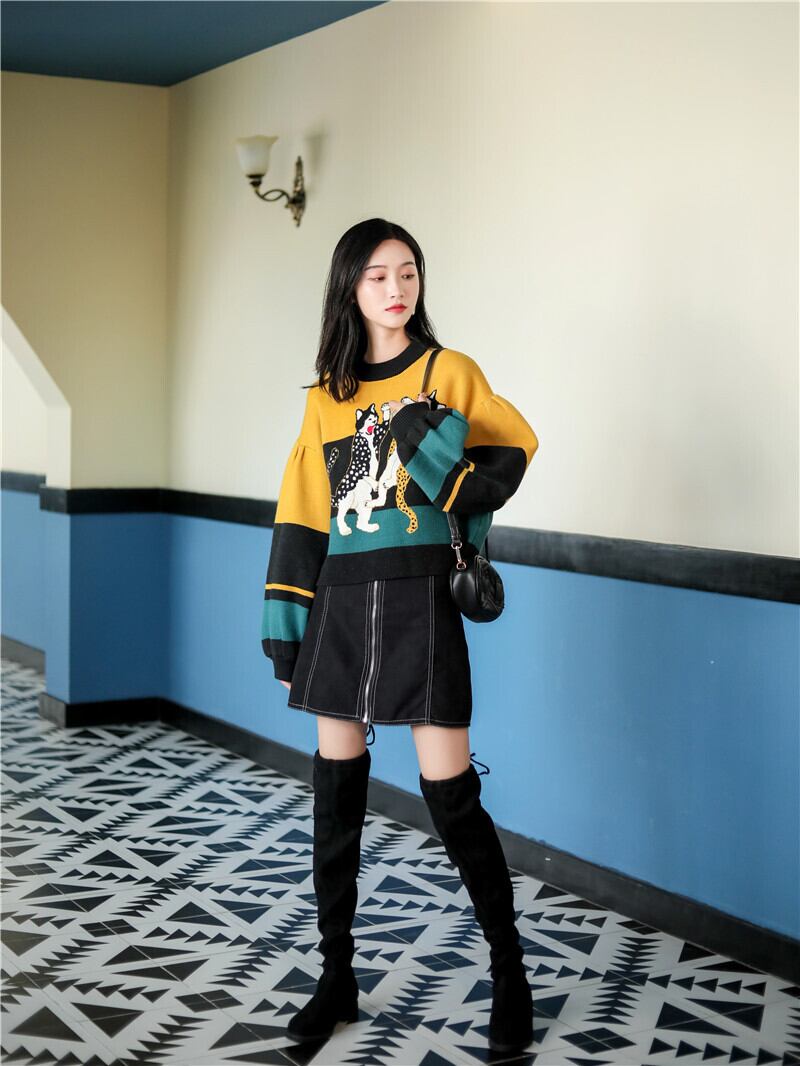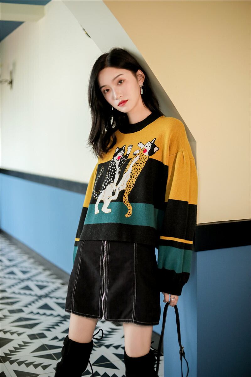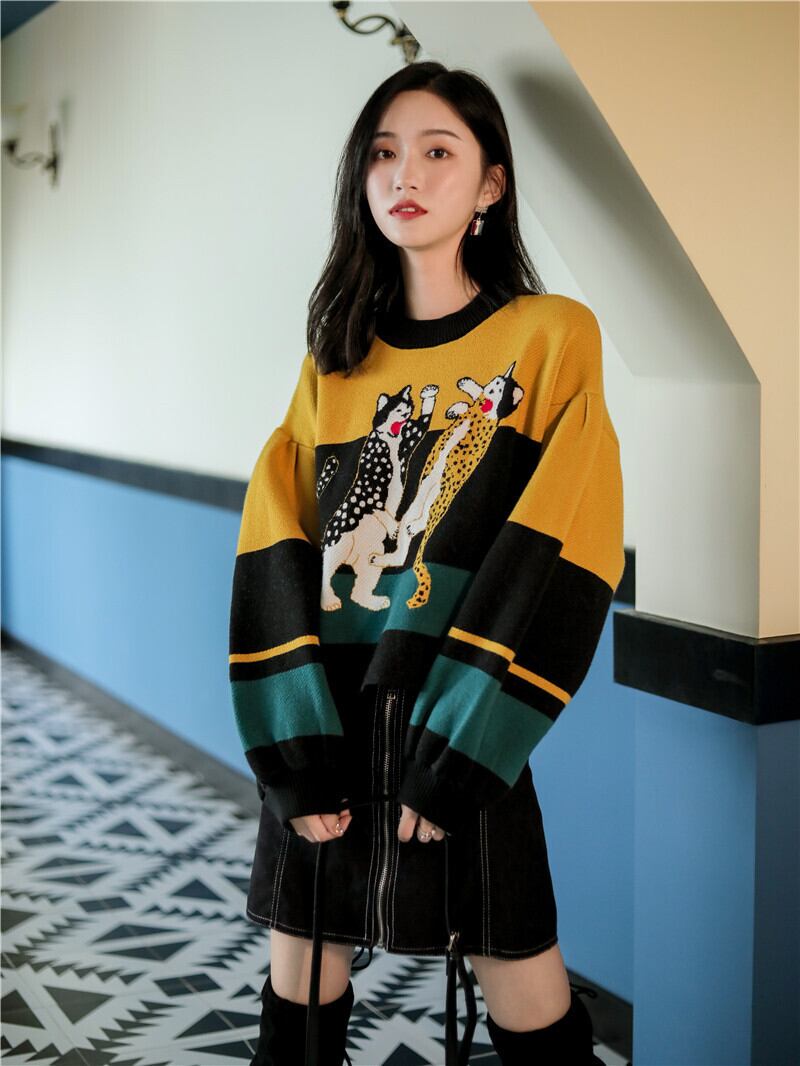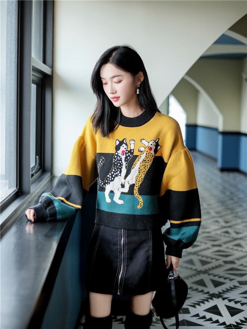 トップス セーター トレーナー ショート丈 袖あり 長袖 ボリューム袖 ラウンドネック ニット かわいい カジュアル おしゃれ かっこいい レトロ エキゾチック メンズライク 個性的 アニマル柄 秋 冬 10代 20代 学生 デート お出かけ 女子会 韓国 オルチャン ファッション 暖かい XS S M L 小さいサイズ 大きいサイズ