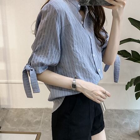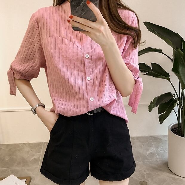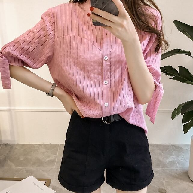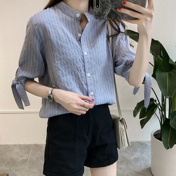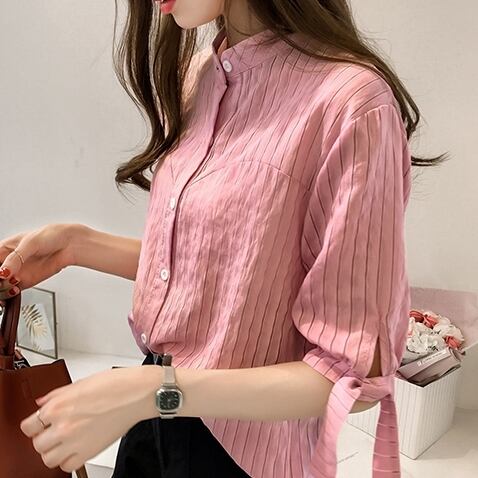 トップス ブラウス 袖あり 五分袖 ストライプ 切り替え バンドカラー スタンドカラー リボン ショート丈 バブルスリーブ かわいい 大人可愛い シンプル カジュアル 大人 おしゃれ アジアン 大人女子 こなれ感 キュート デート クラシカル 柄 春 夏 10代 20代 30代 オフィス ビジネス OL 通勤 デート お出かけ 普段使い M L XL 2XL 3XL 4XL 大きいサイズ ホワイト ピンク ブルー