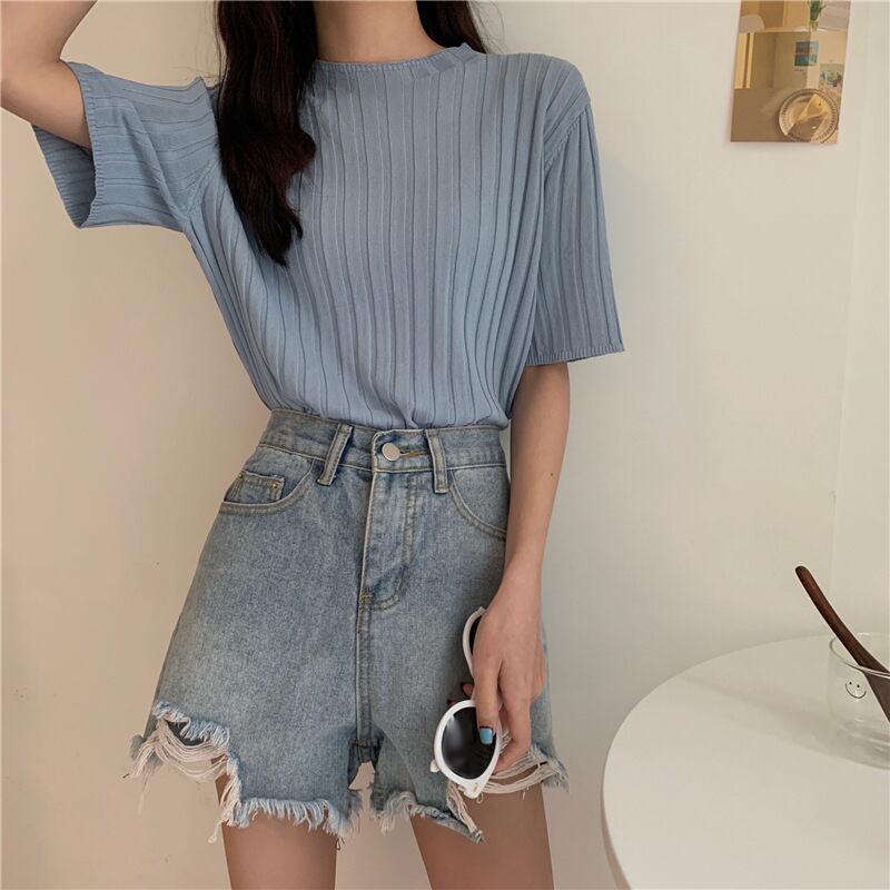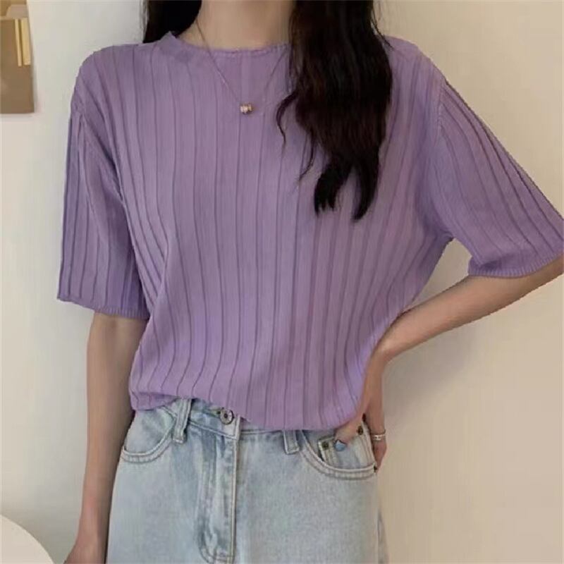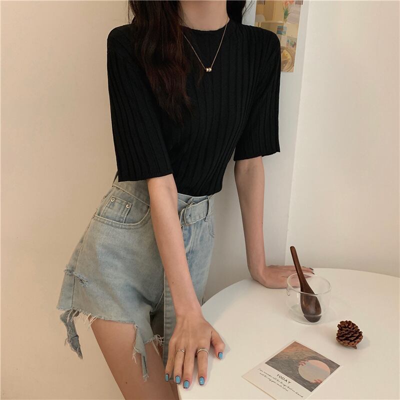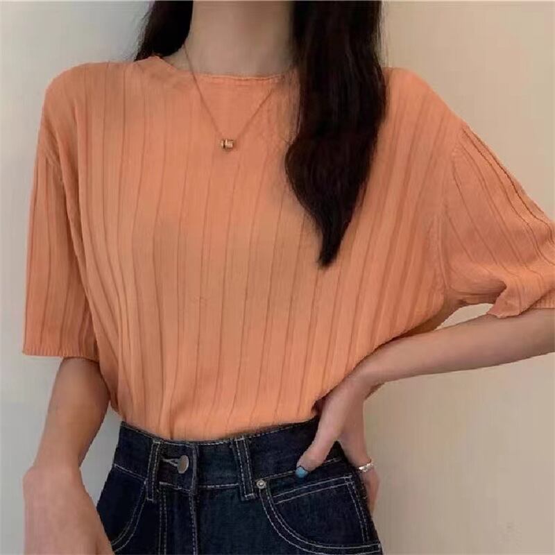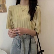 ゆったりフォルムの五分袖リブサマーニットトップスです。