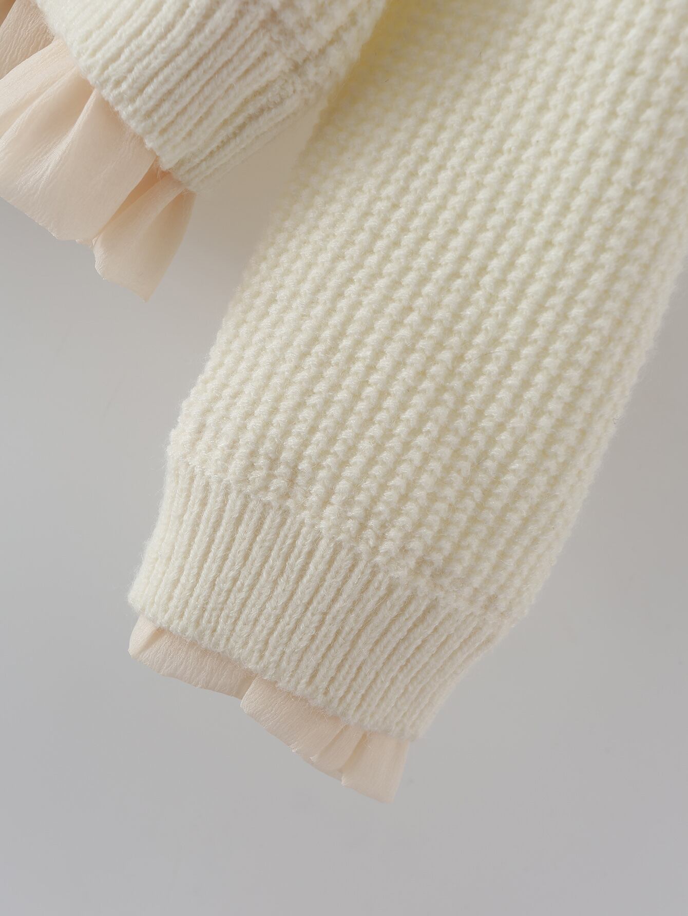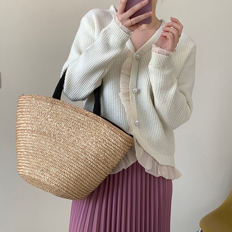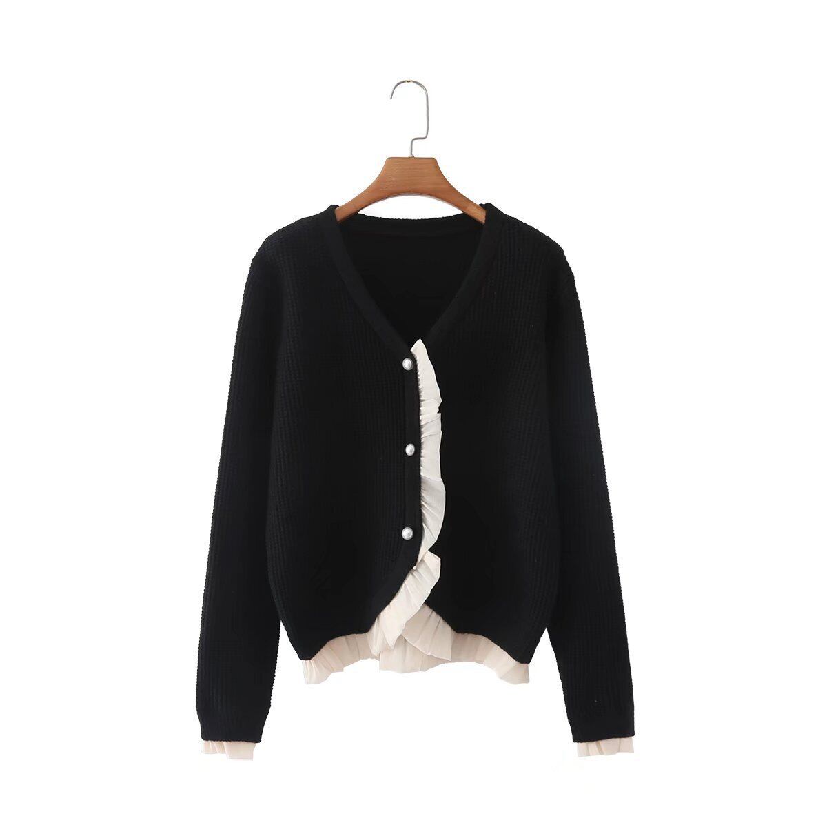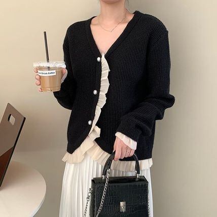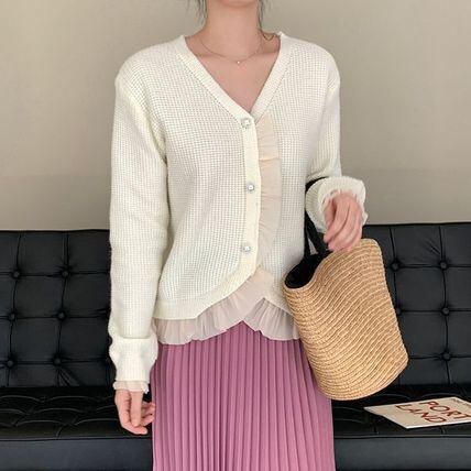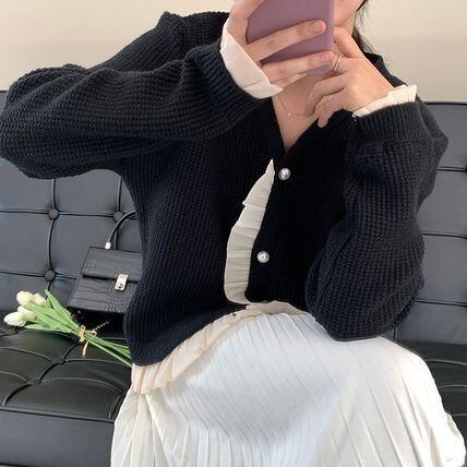 カーディガン レディース トップス 袖あり 長袖 Vネック 無地 ワッフル フリル リブ パールボタン ワントーン レトロ ショート丈 バブルスリーブ かわいい 大人可愛い シンプル カジュアル 大人 おしゃれ アジアン 大人女子 こなれ感 キュート 柄 春 秋 10代 20代 30代 オフィス ビジネス OL 通勤 デート お出かけ 普段使い ワンサイズ ホワイト ブラック
