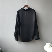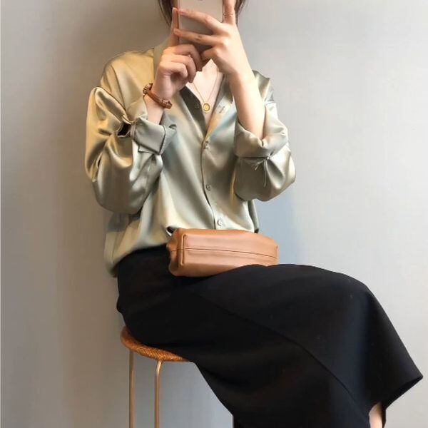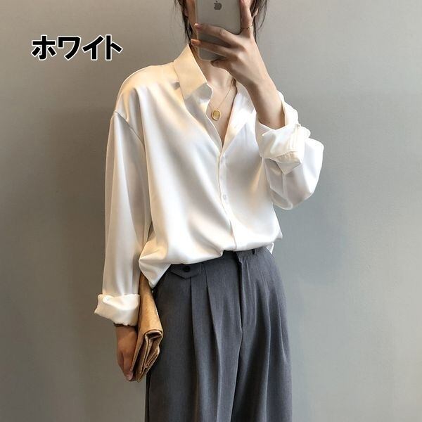 トップス ブラウス カットソー 白シャツ 袖あり 長袖 ワイド シルクタッチ サテン きれいめ シンプル カジュアル 大人 上品 おしゃれ かっこいい 無地 春 夏 秋 20代 30代 40代 50代 レディース OL 通勤 お出かけ 休日 着回し 普段使い 楽ちん S M L XL ホワイト ブラック シャンパン グリーン