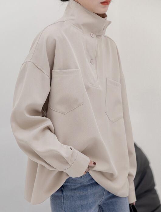 首元のボタンをしめればハイネック風の着こなし、ボタンを開けてシャツっぽい雰囲気でもコーデが楽しめます。