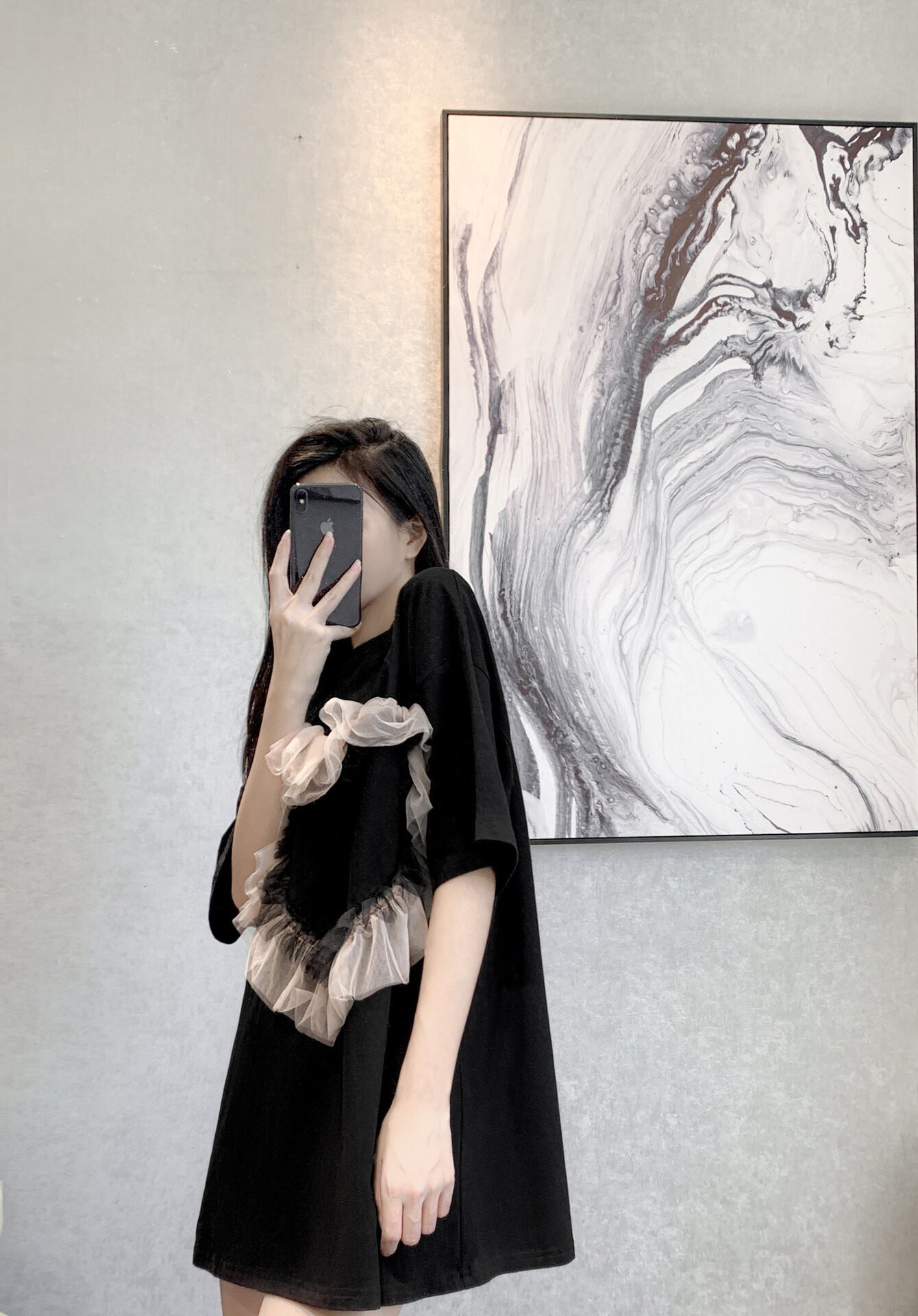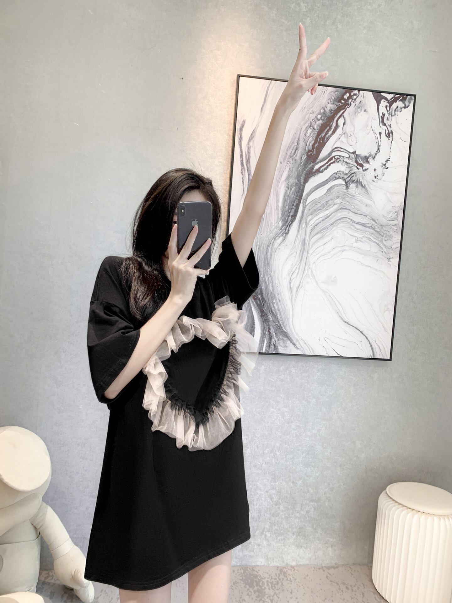 トップス Tシャツ カットソー 袖あり 半袖 クルーネック チュール ハートフリル ビッグシルエット オーバーサイズ かわいい 大人可愛い きれいめ シンプル カジュアル おしゃれ 無地 春 夏 10代 20代 30代 40代 OL 通勤 学生 通学 女子会 着回し 普段使い ブラック グリーン アプリコット