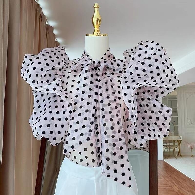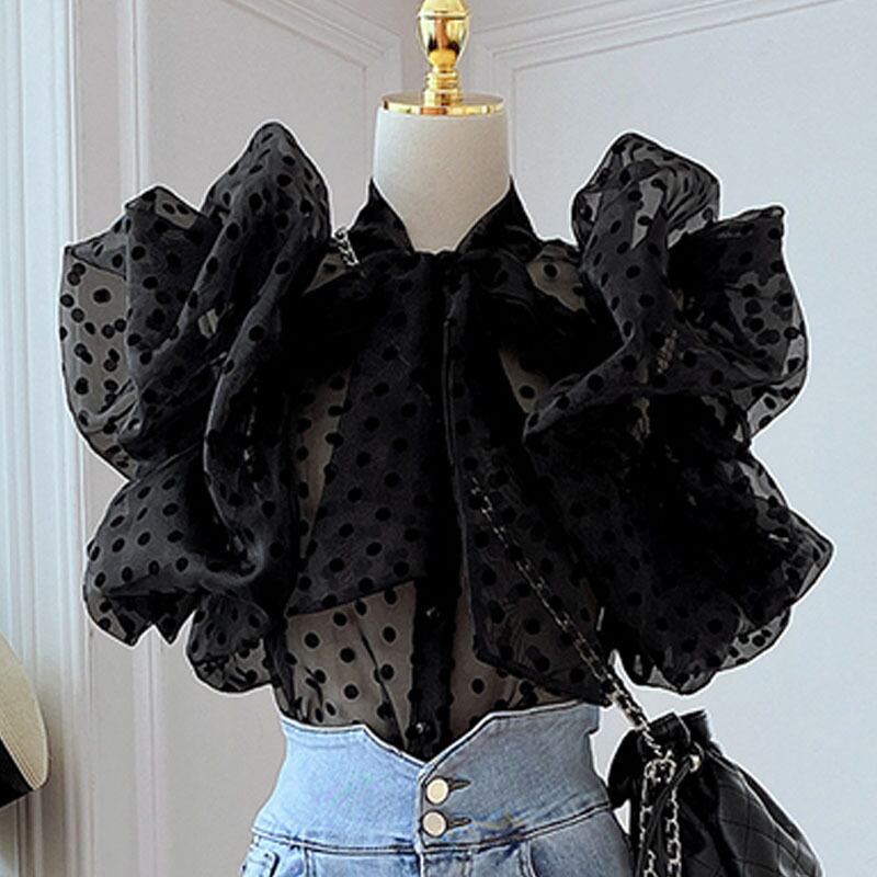 ボリューム袖が可愛いチュール仕立てのボウタイブラウスです。