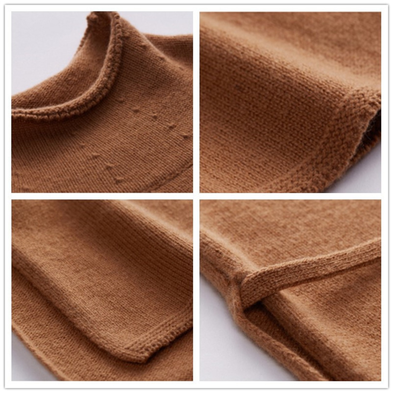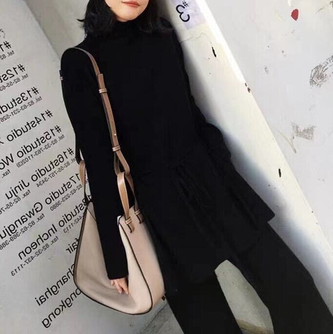 ハイネックのトップスはゆったり着られ、高めのウエストマークでスタイルアップできる優秀アイテム。