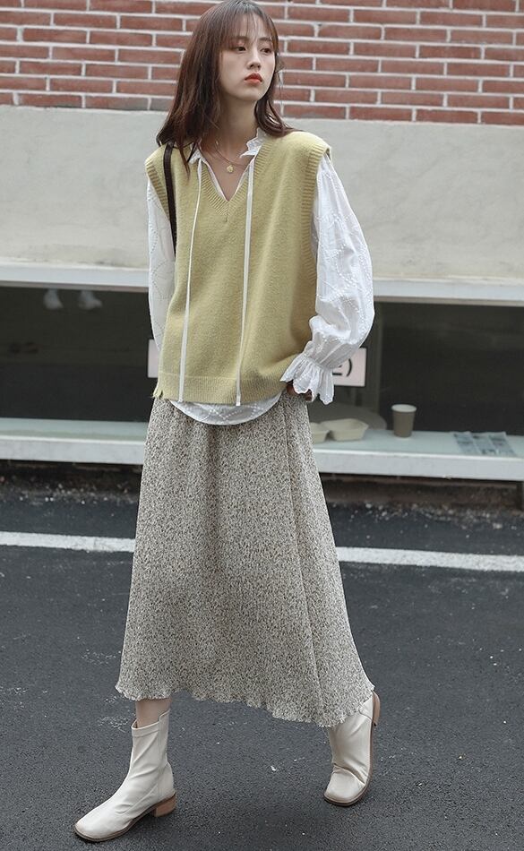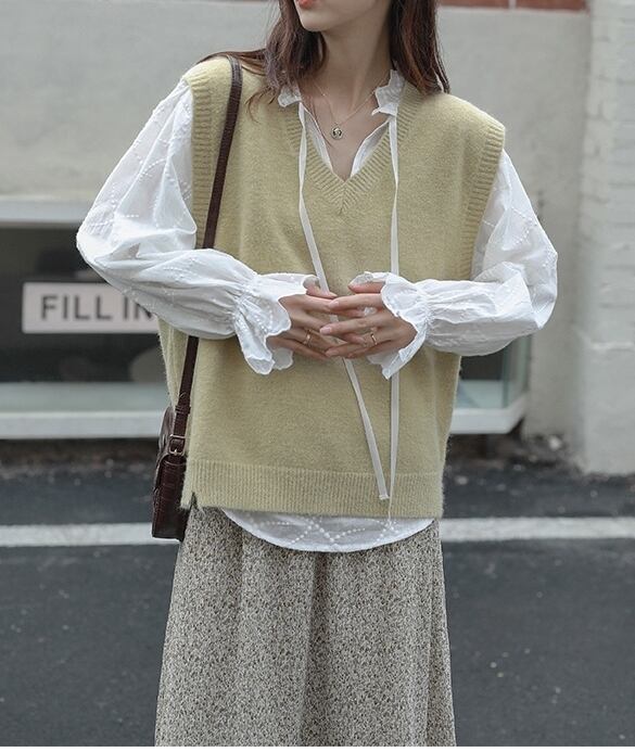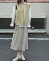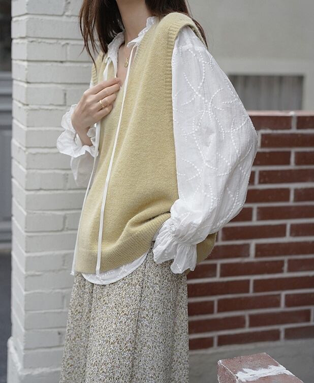 キーネックとドローストリング付き襟が個性的でリボンにしても楽しめます。
