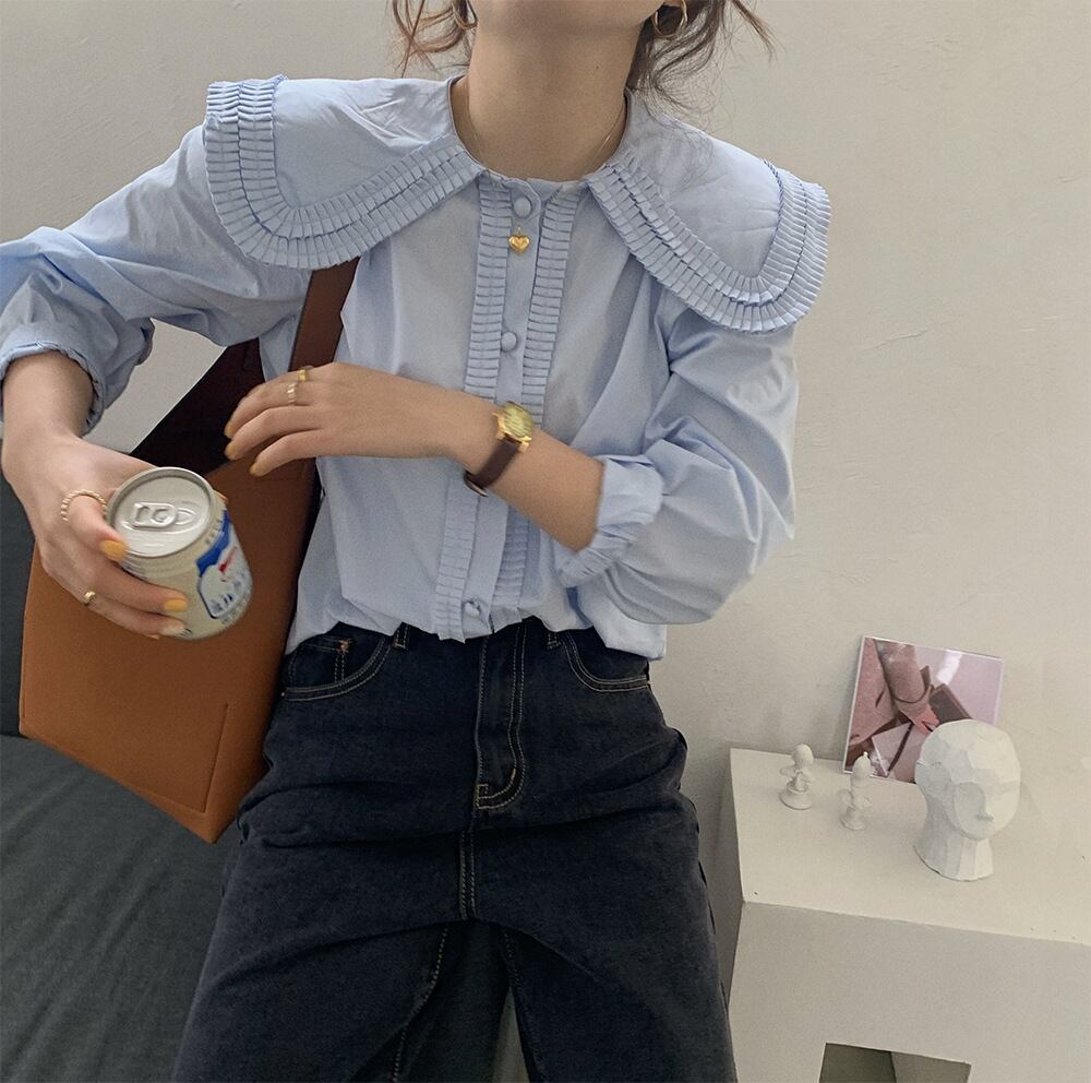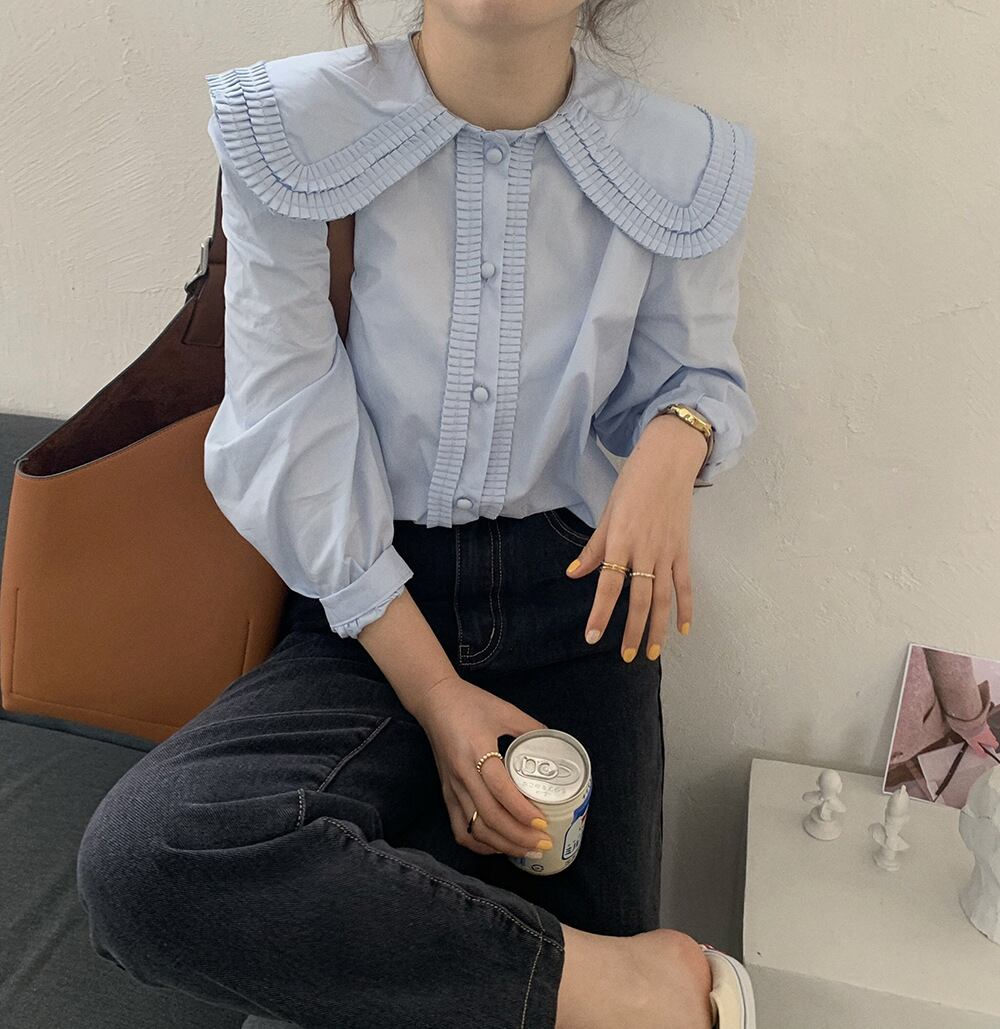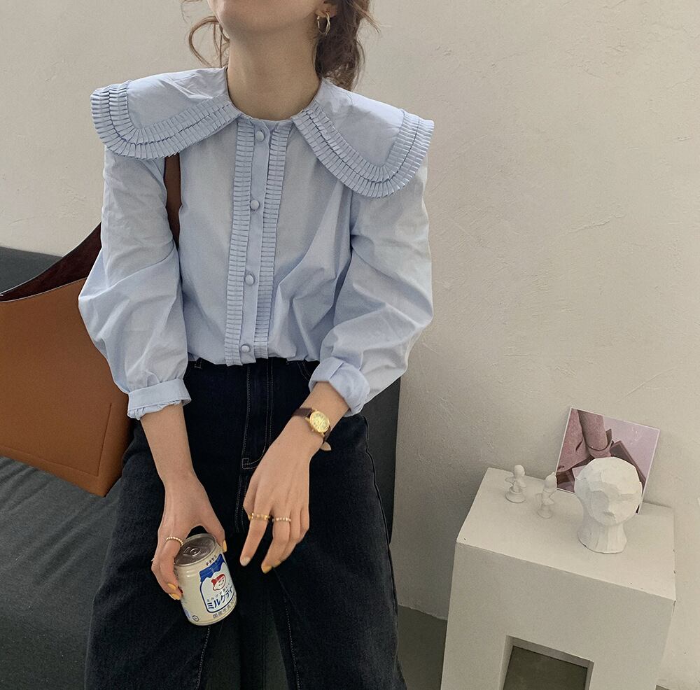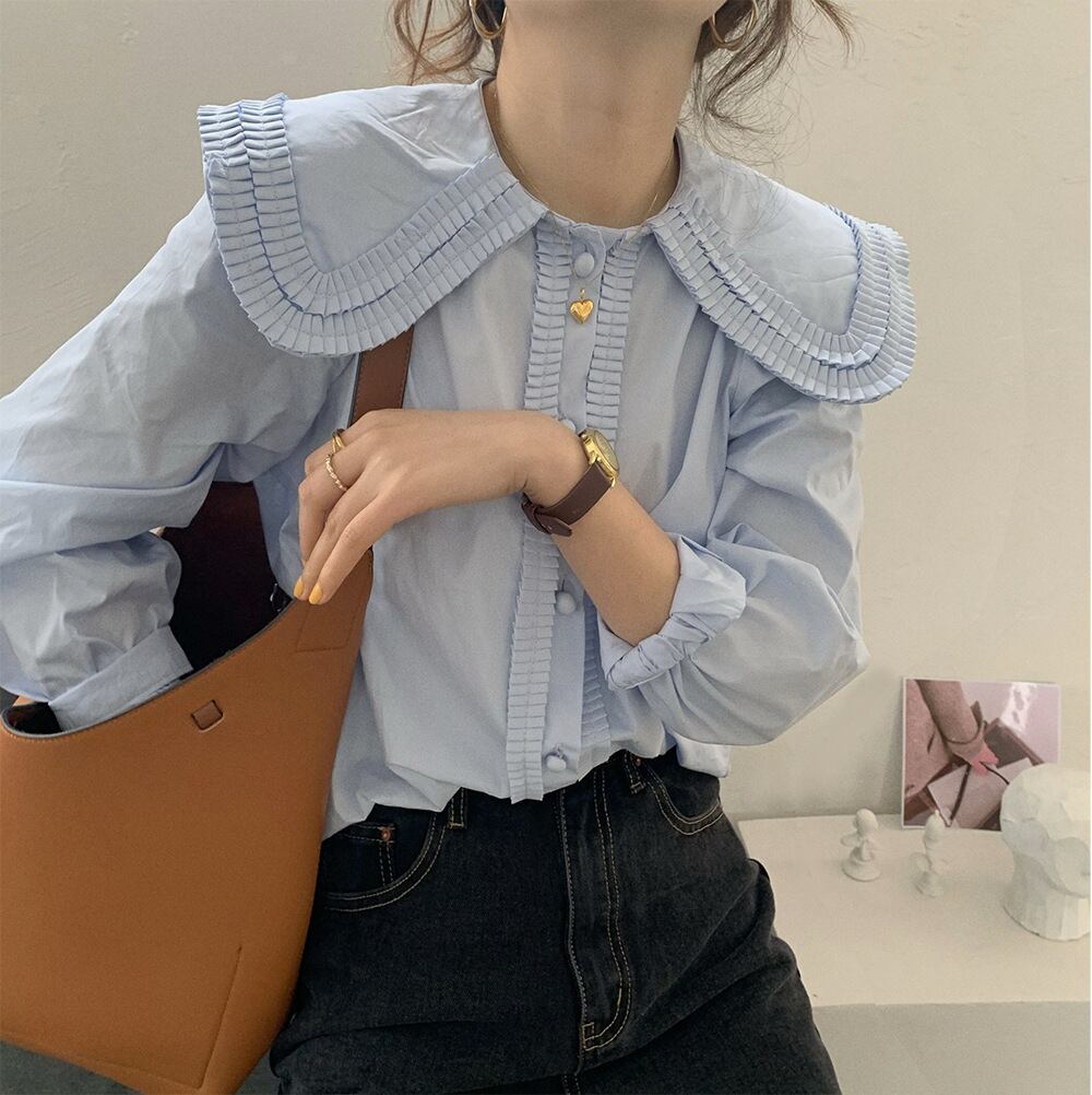 トップス レディース ブラウス 袖あり 長袖 クルーネック 襟付き フリル ラージカラー フリル タック パフスリーブ かわいい 大人可愛い きれいめ シンプル カジュアル 大人 上品 おしゃれ お洒落 かっこいい レトロ アジアン 大人可愛い 大人女子 こなれ感 ラフ 無地 レディース ビジネス OL 通勤 学生 通学 デート お出かけ 公園デビュー 女子会 お泊まり 休日 アウトドア パーティー イベント リゾート お揃い 双子 ファッション コーデ スタイル 楽ちん ブルー ホワイト