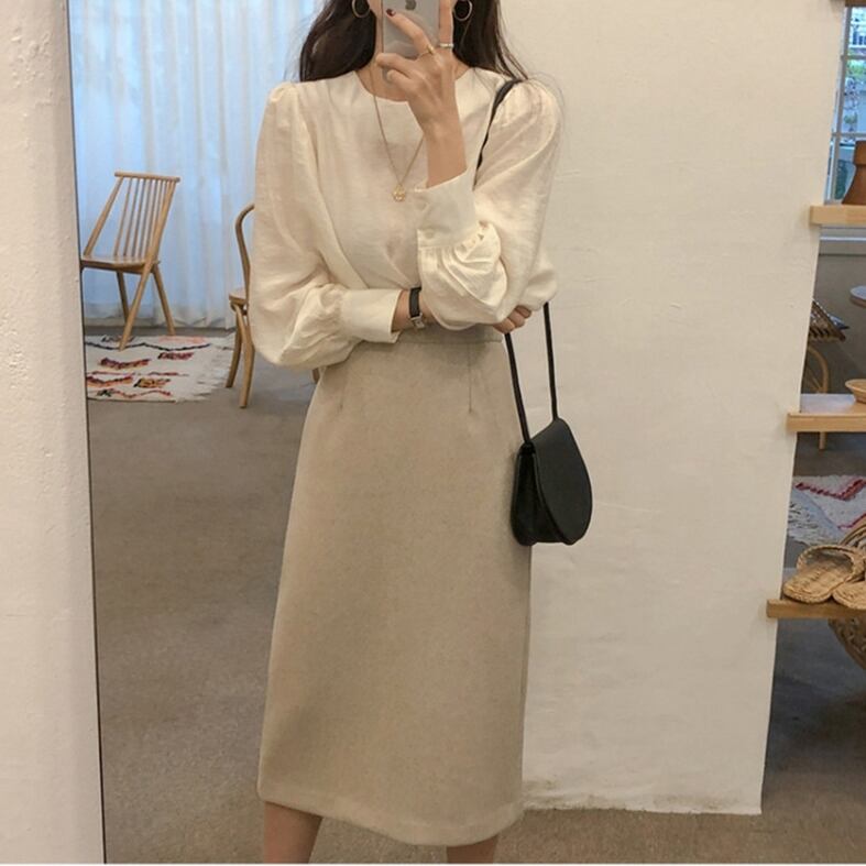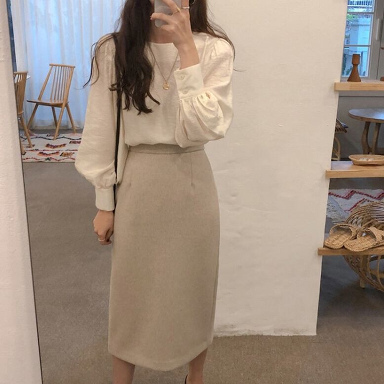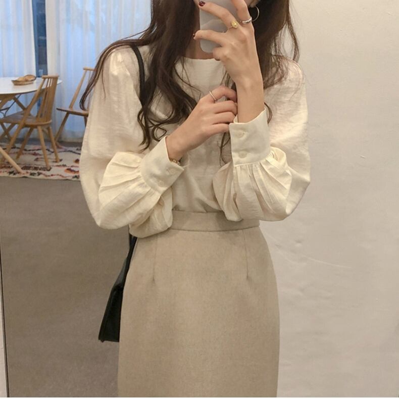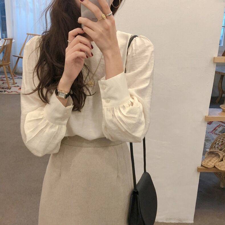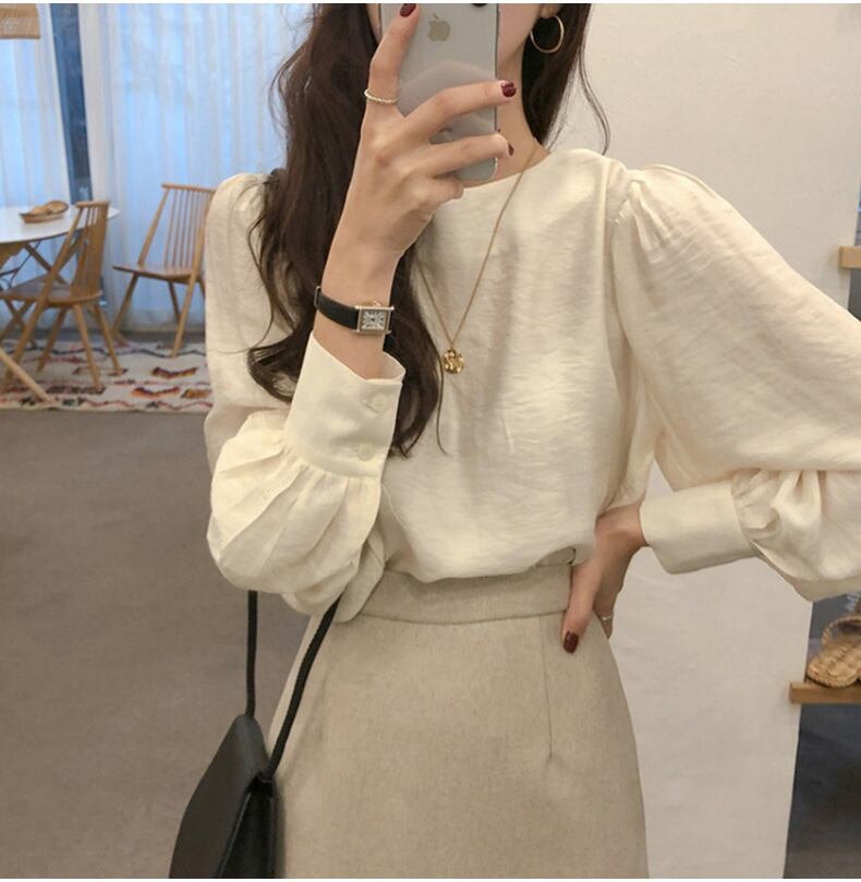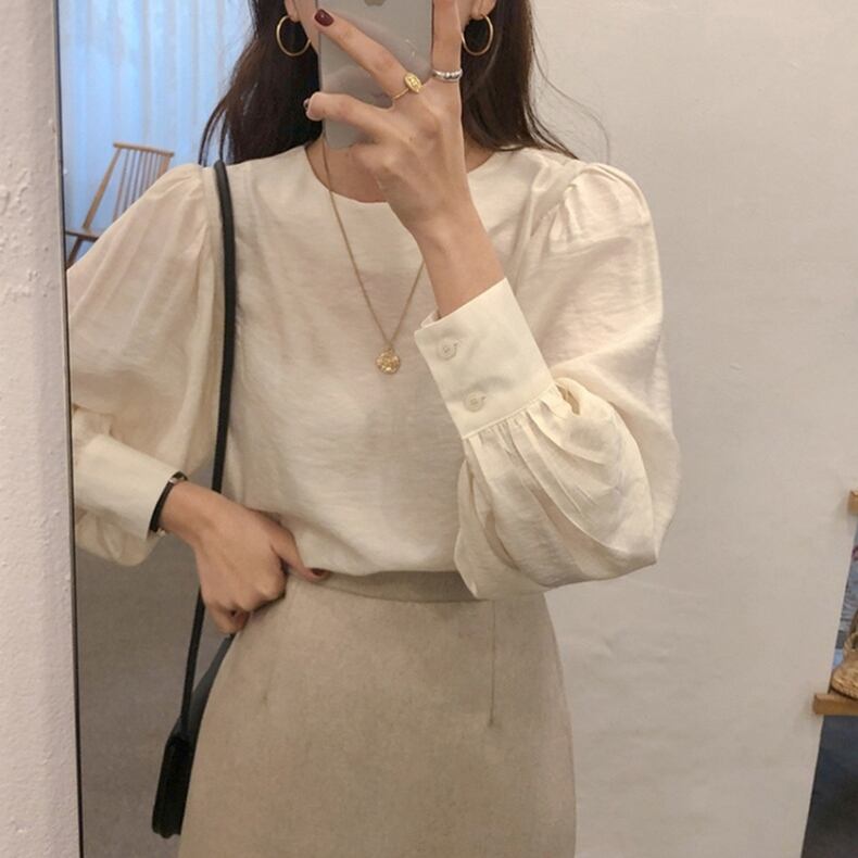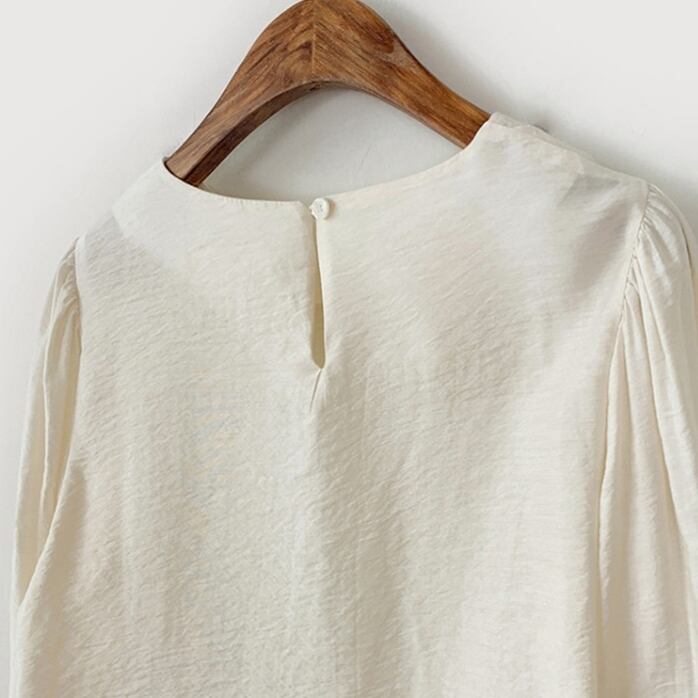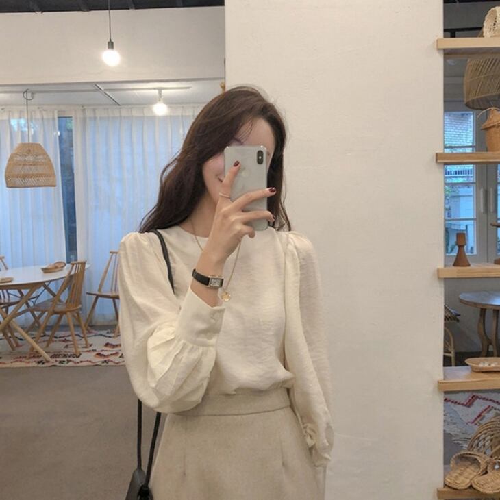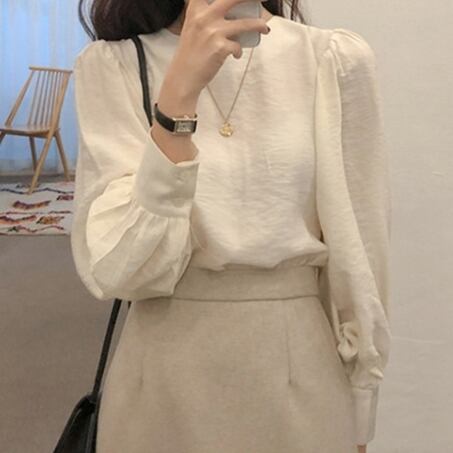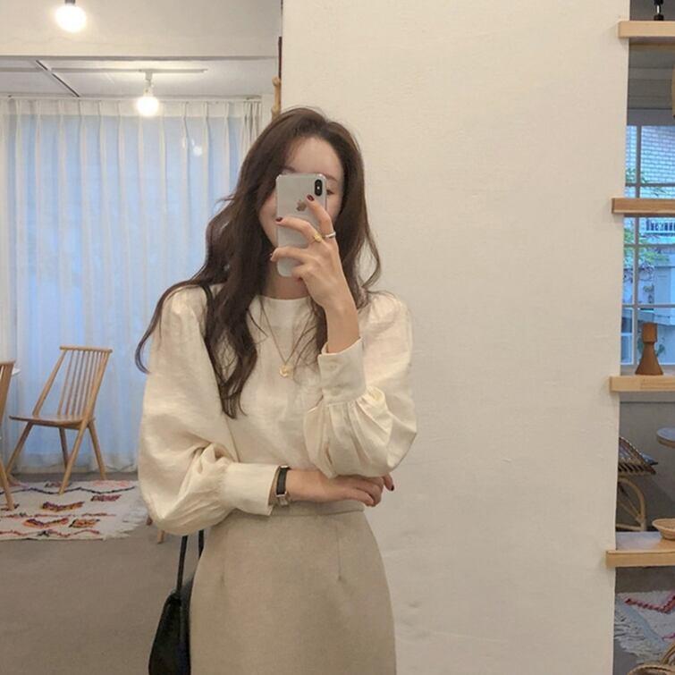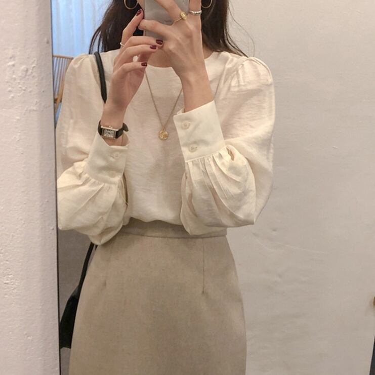 トップス ブラウス 袖あり 長袖 クルーネック シルクタッチ ブラウス ショート丈 シンプル シック 透け感 リネンライク バブルスリーブ かわいい 大人可愛い シンプル カジュアル 大人 おしゃれ アジアン 大人女子 こなれ感 キュート デート クラシカル 柄 春 夏 10代 20代 30代 オフィス ビジネス OL 通勤 デート お出かけ 普段使い S M L XL アプリコット