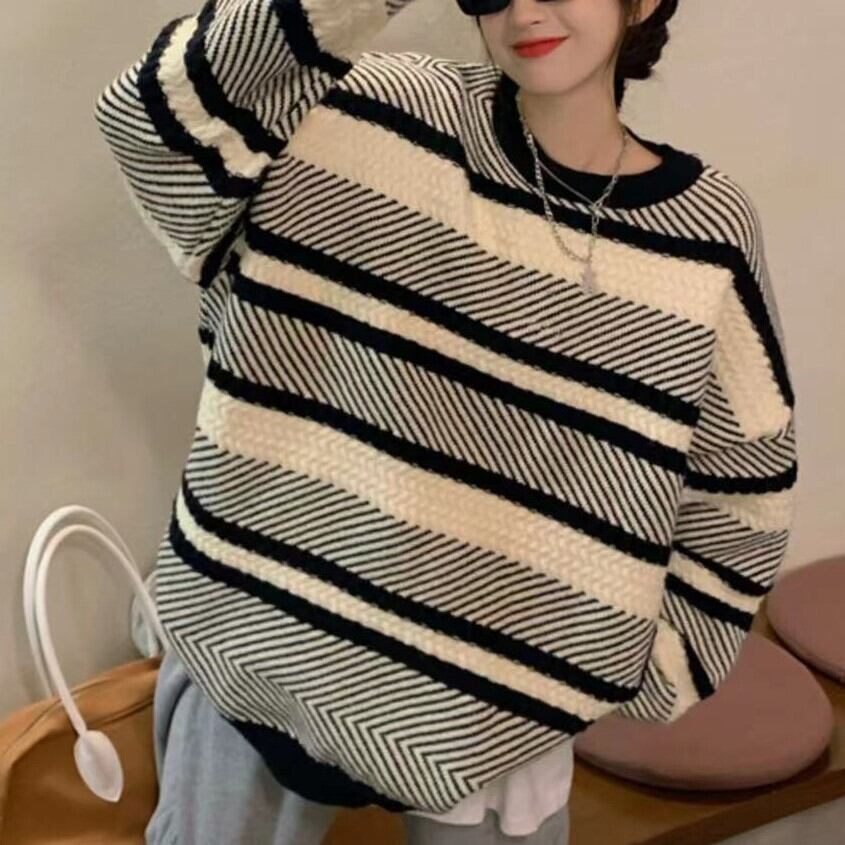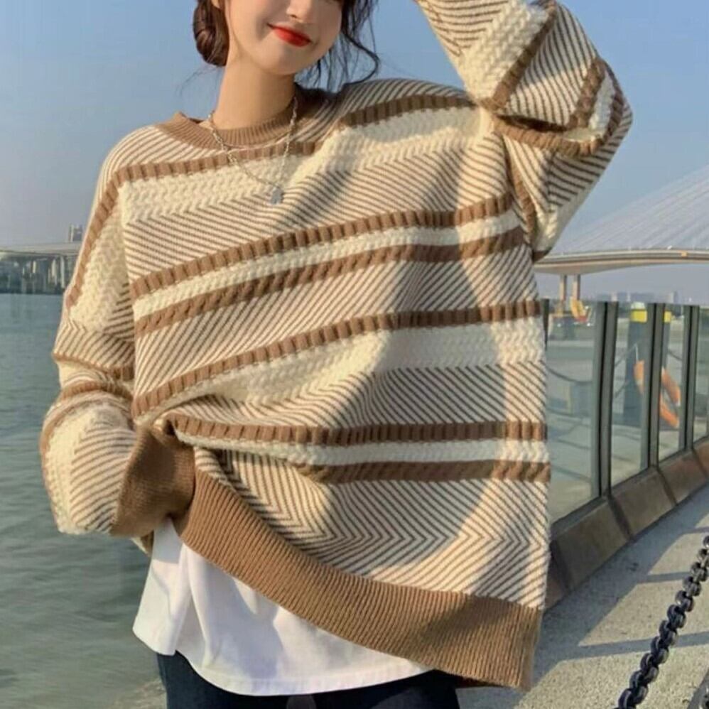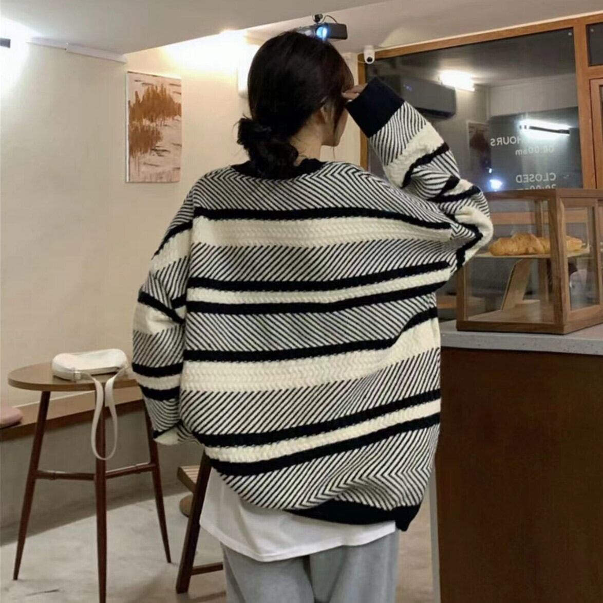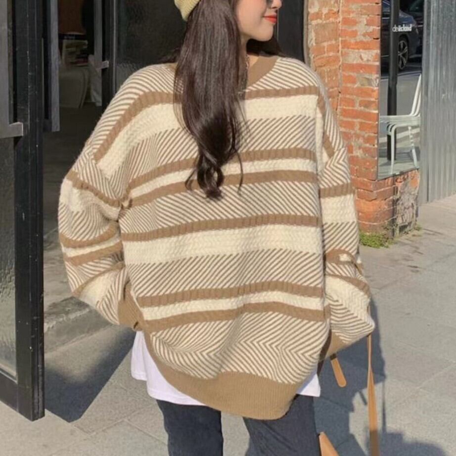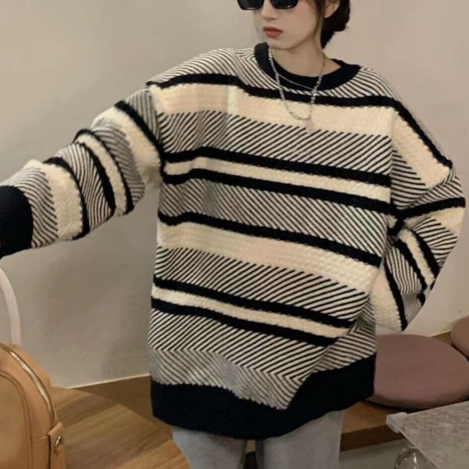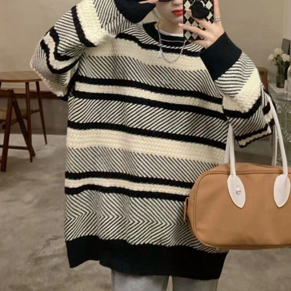 トップス ニットセーター長袖 萌え袖 クルーネック ルーズ ゆったり ビッグシルエット メンズライク ボーダー ジャガード ストライプ モノトーン あたたか 人気 おすすめ おしゃれ お洒落 激安 安い 送料無料 プチプラ 可愛い かわいい 韓国 かっこいい カジュアル 大人 おしゃれ 大人可愛い 大人女子 モード系 デート お出かけ 女子会 レディース 女性用 10代 20代 30代 40代 ママ 着回し 普段使い 重ね着 オルチャン ファッション 楽ちん モテ ブラック 黒 ブラウン 茶