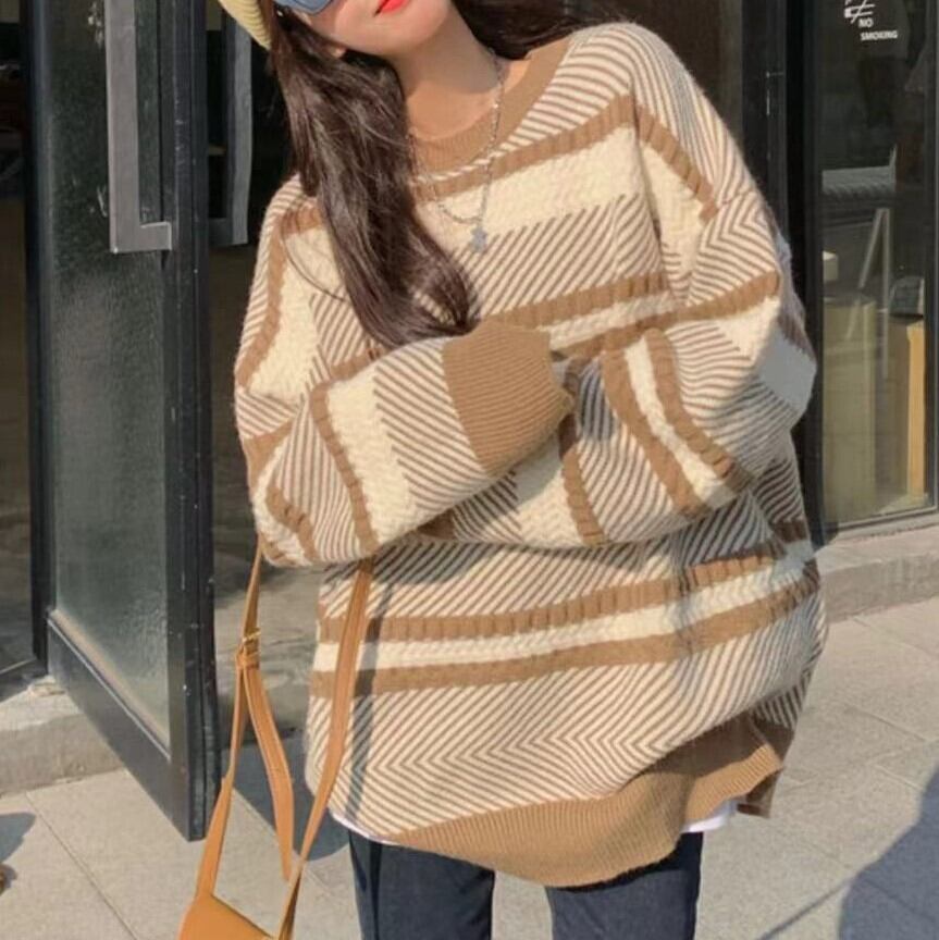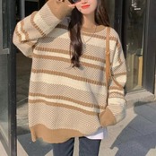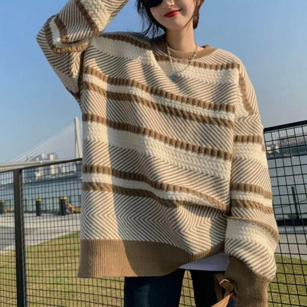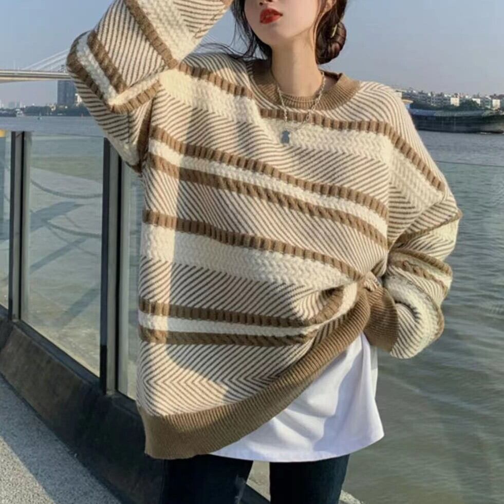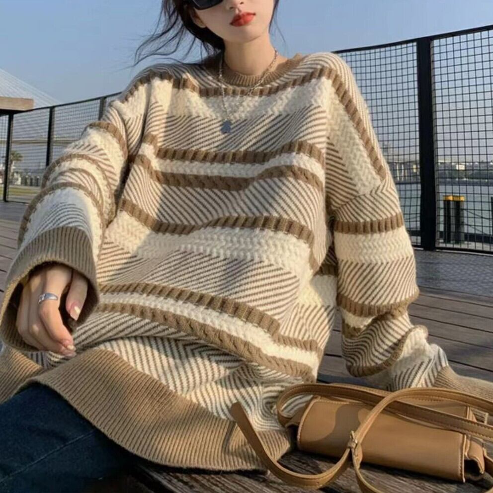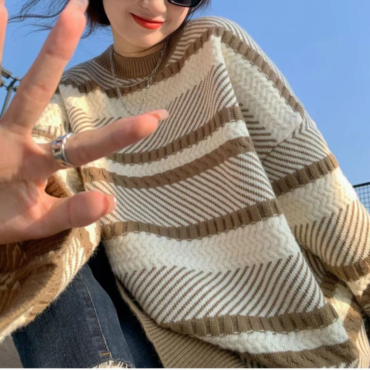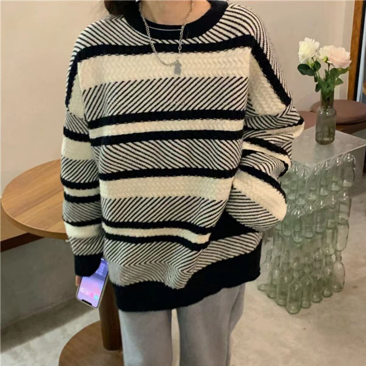 トップス ニットセーター長袖 萌え袖 クルーネック ルーズ ゆったり ビッグシルエット メンズライク ボーダー ジャガード ストライプ モノトーン あたたか 人気 おすすめ おしゃれ お洒落 激安 安い 送料無料 プチプラ 可愛い かわいい 韓国 かっこいい カジュアル 大人 おしゃれ 大人可愛い 大人女子 モード系 デート お出かけ 女子会 レディース 女性用 10代 20代 30代 40代 ママ 着回し 普段使い 重ね着 オルチャン ファッション 楽ちん モテ ブラック 黒 ブラウン 茶