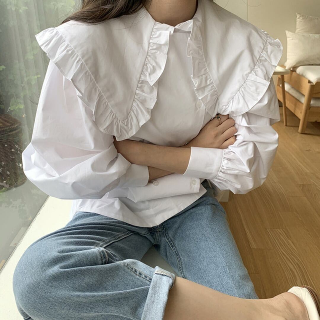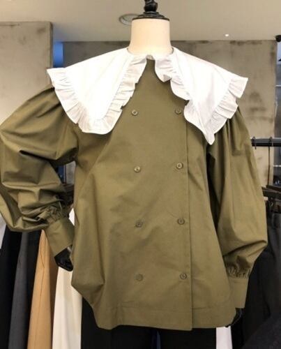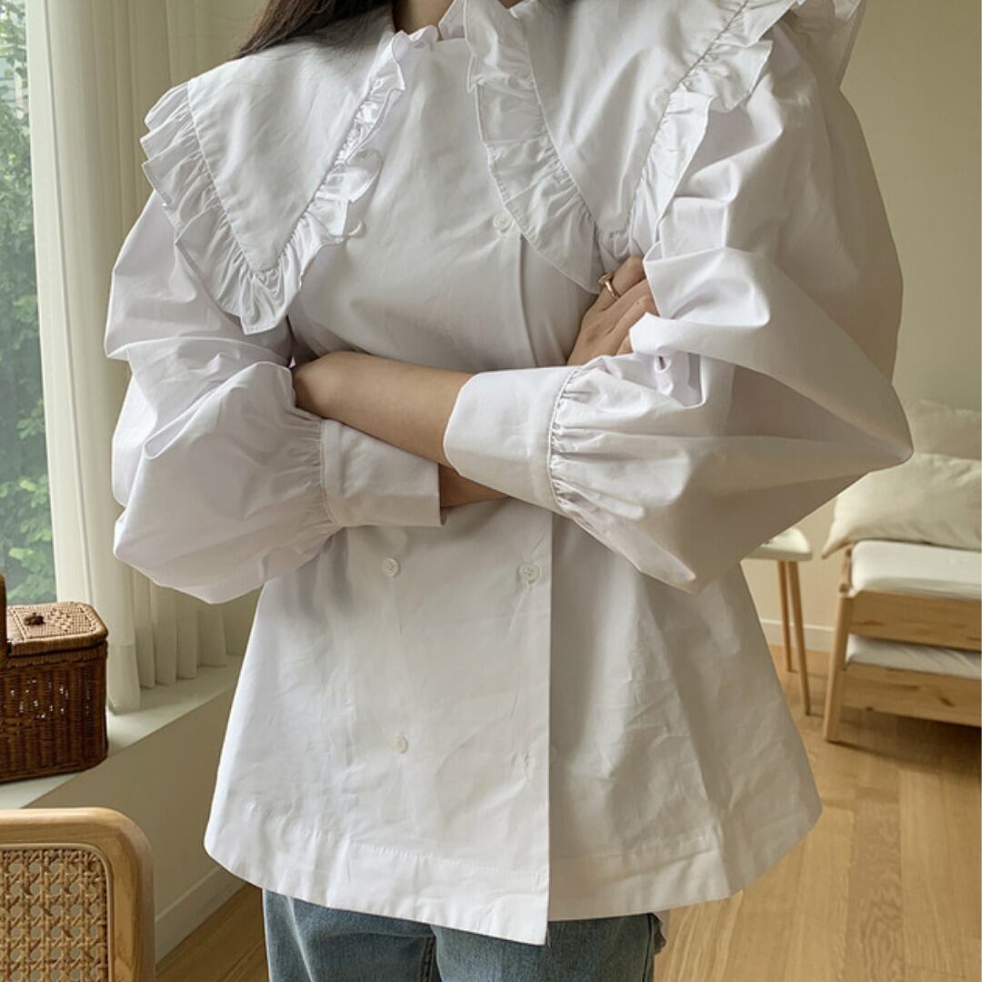 フリルあしらった大きなスクエア襟が可愛いフェミニンブラウスです。