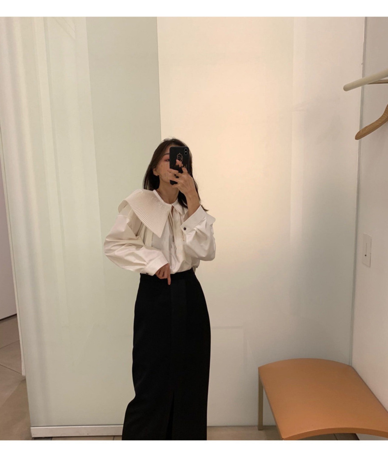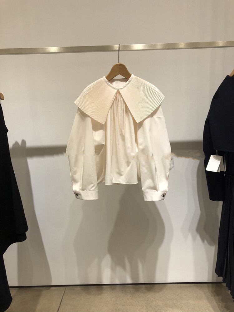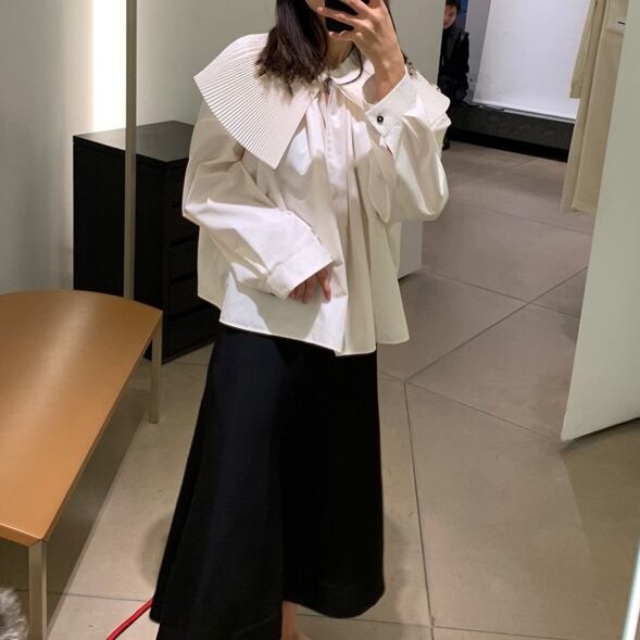 プリーツをあしらった大きな襟が可愛いフェミニンブラウスです。