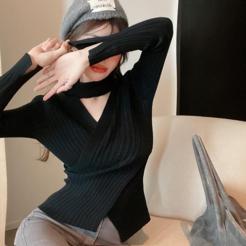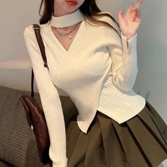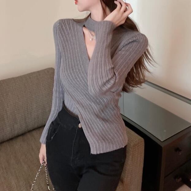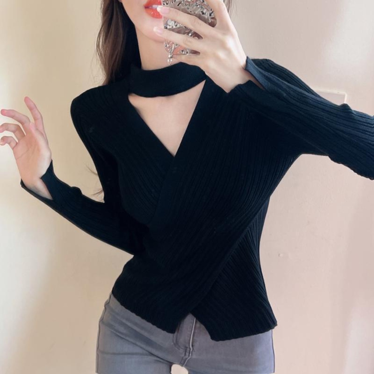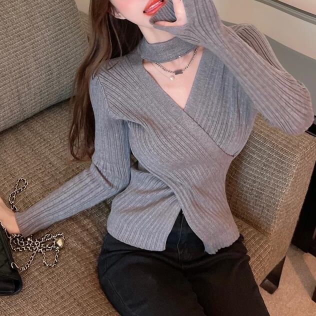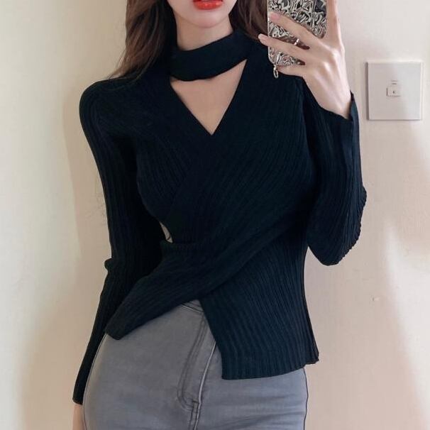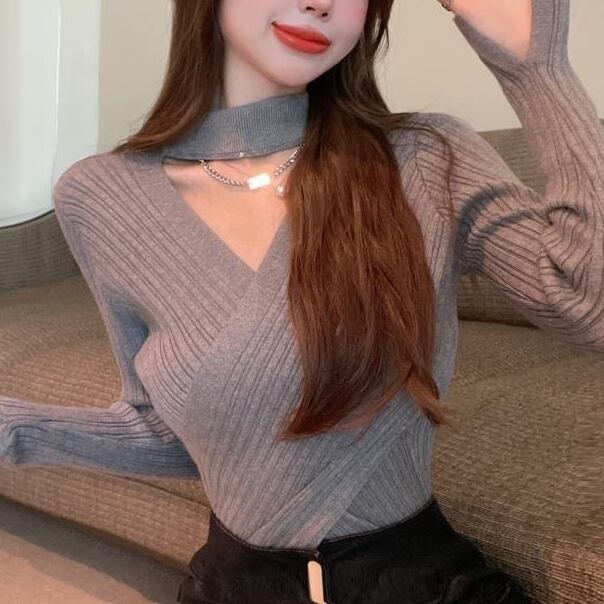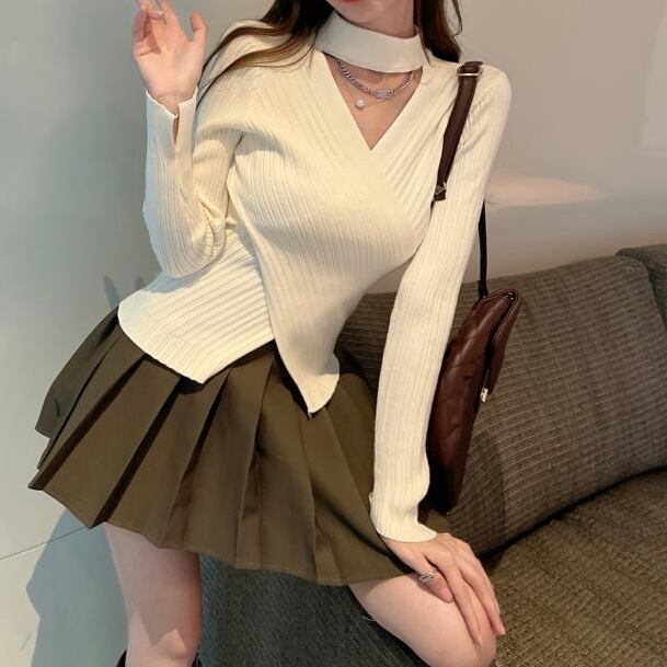 胸元にカットアウトを入れてチョーカー風に仕立てたニットソーです。