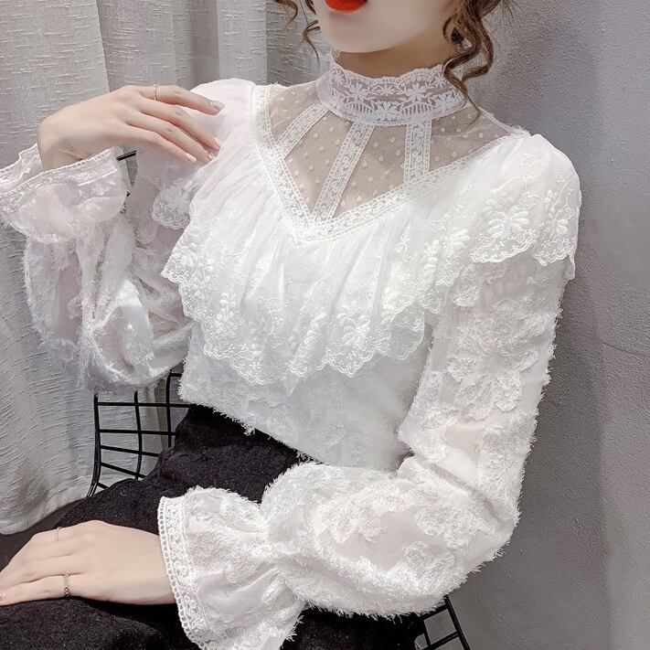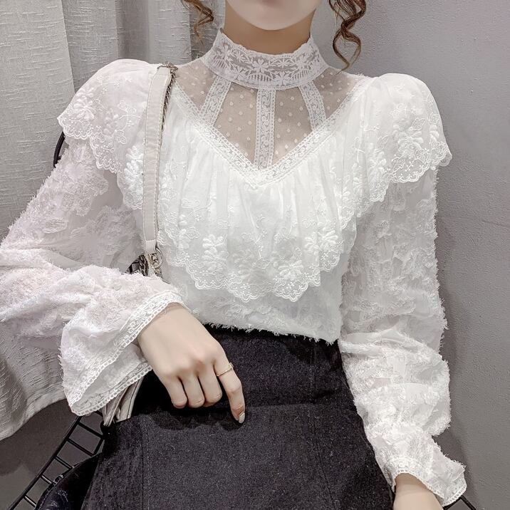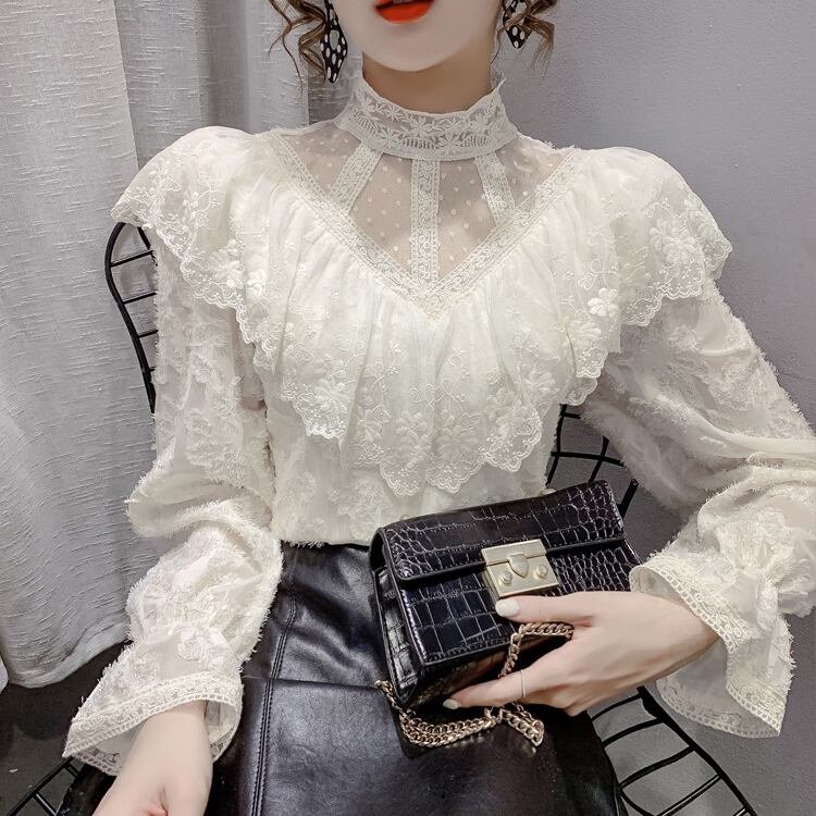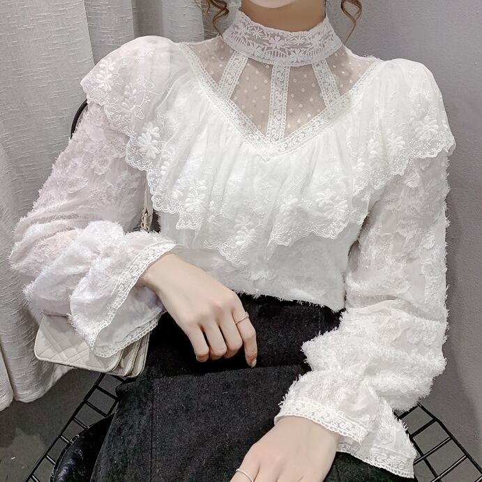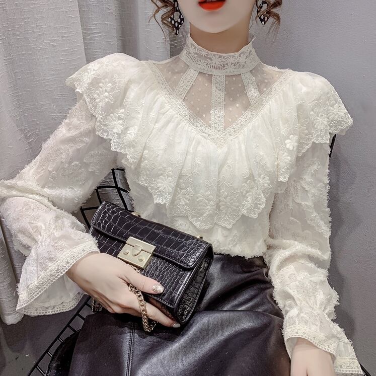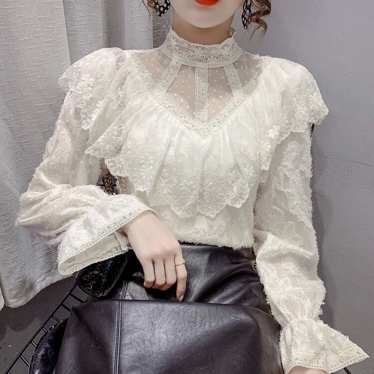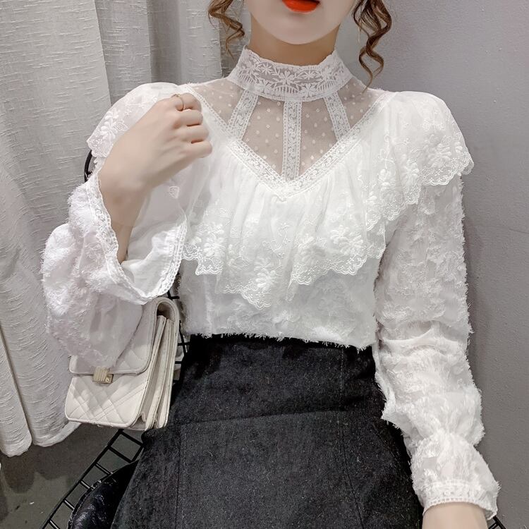花柄総レースの透け感を活かしたタイトなハイネックブラウスです。