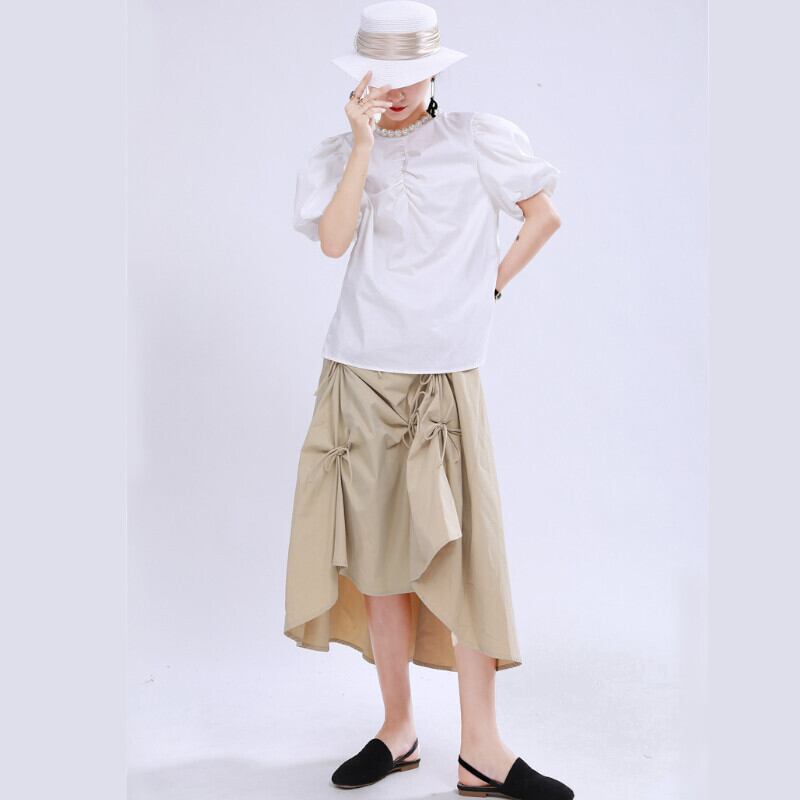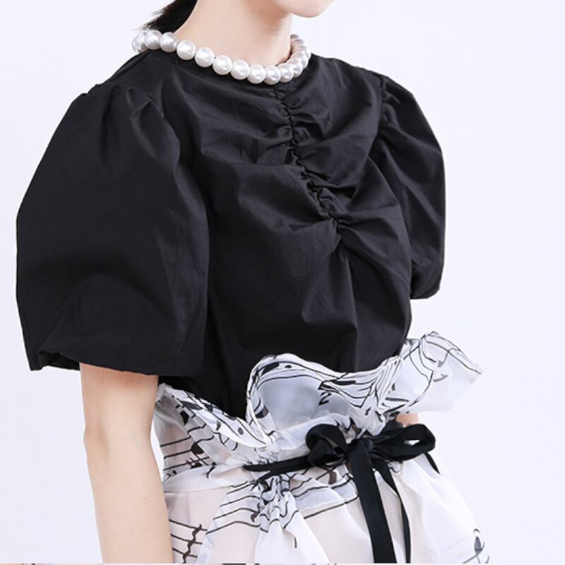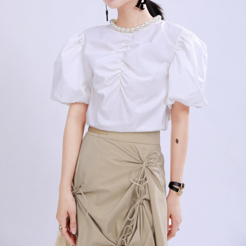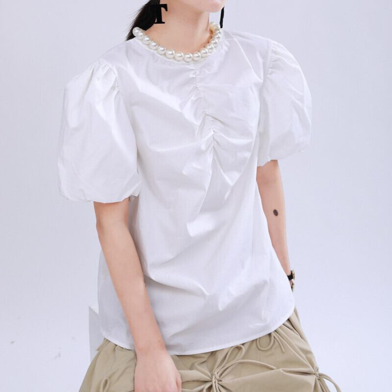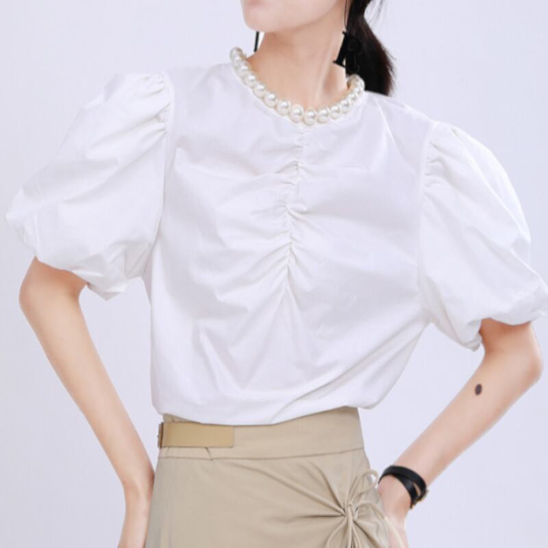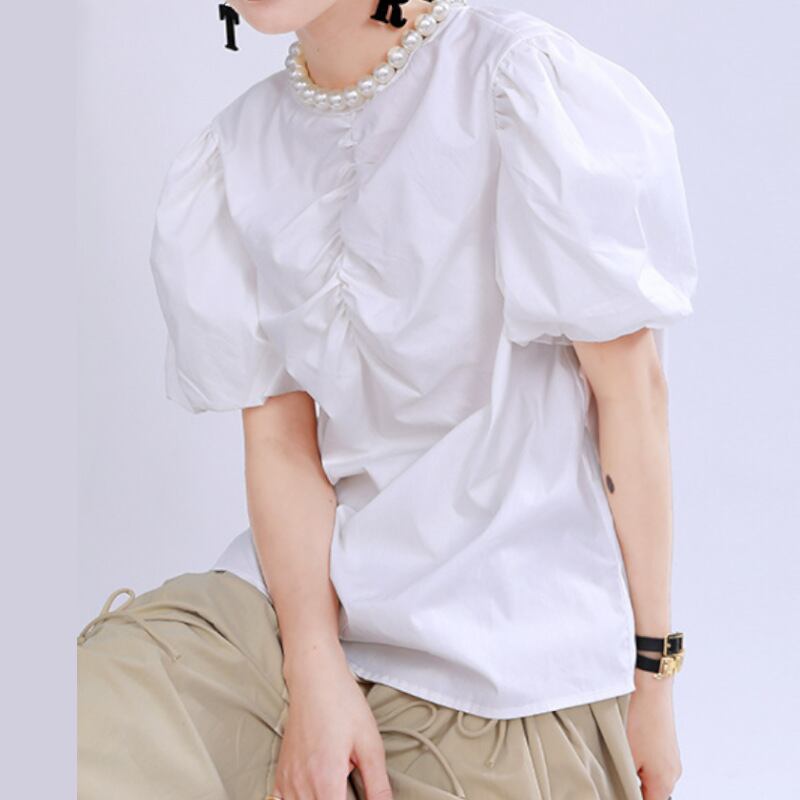 トップス ブラウス 袖あり 半袖 パフスリーブ ランタンスリーブ ?パール装飾? かわいい 大人可愛い きれいめ シンプル カジュアル 上品 おしゃれ レトロ 大人女子 こなれ感 ラブリー キュート エレガント 無地 春 夏 10代 20代 30代 40代 レディース オフィス OL 通勤 学生 通学 デート お出かけ 女子会 着回し 普段使い 韓国系 オルチャン ファッション コーデ スタイル モテ 体型カバー S M 白 ホワイト 黒 ブラック