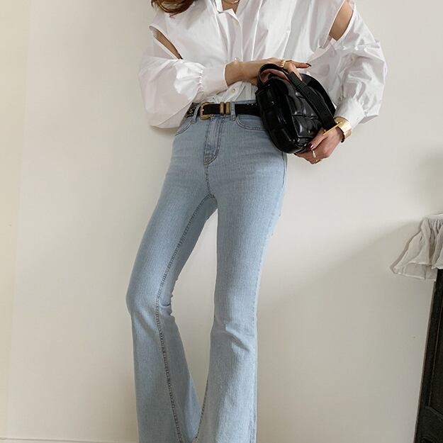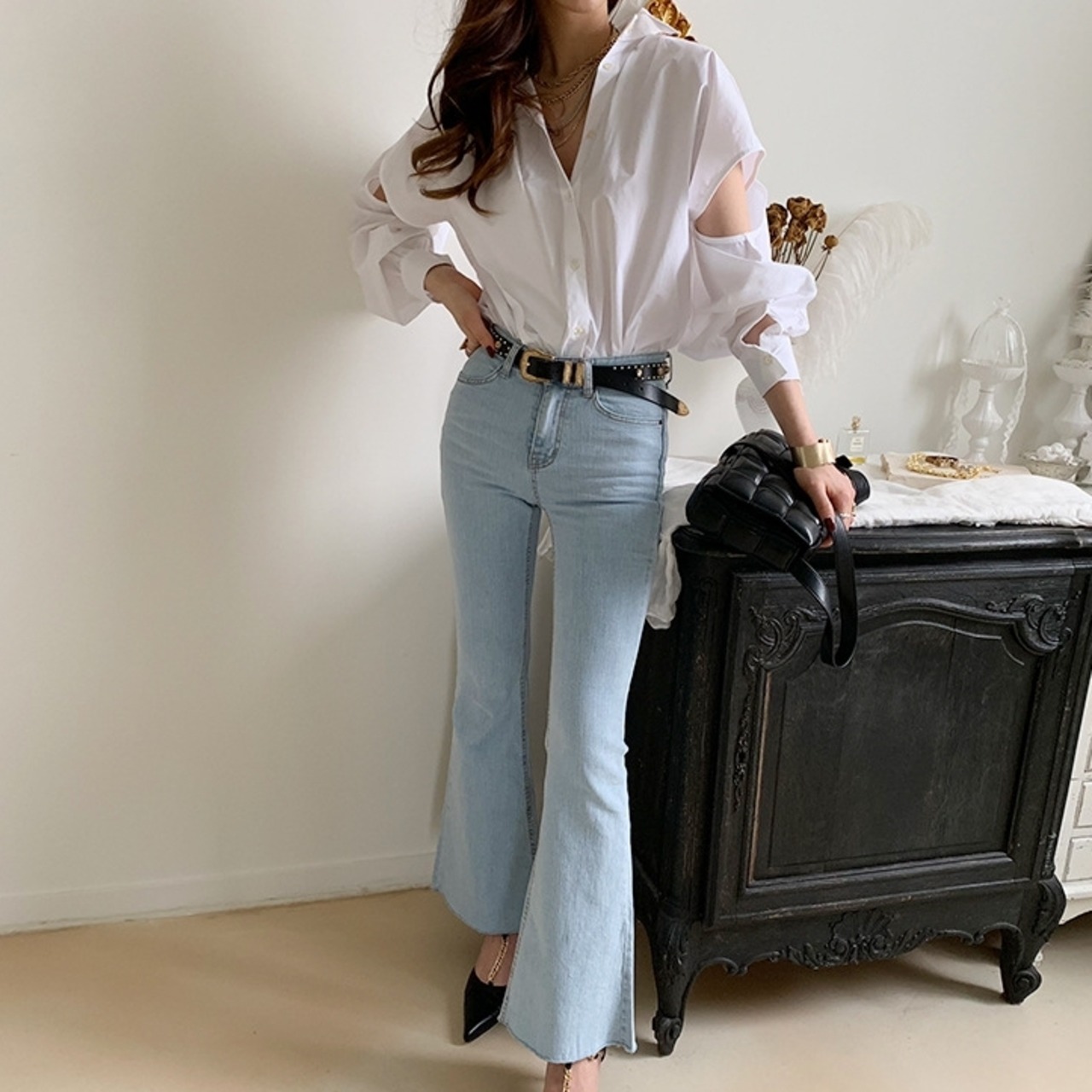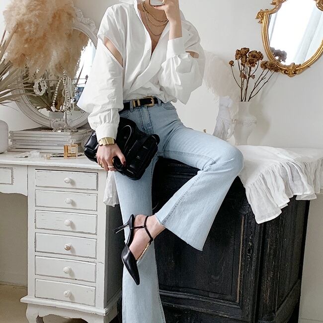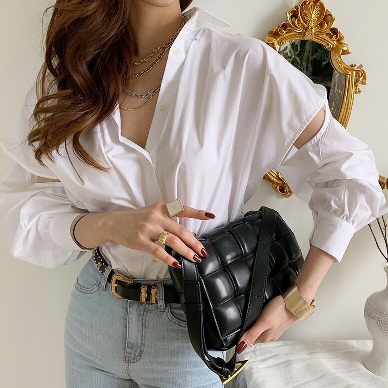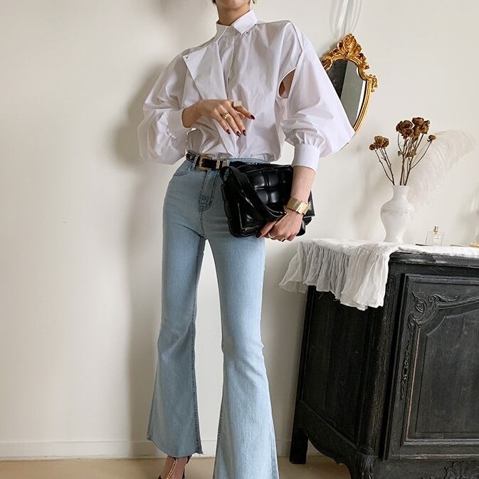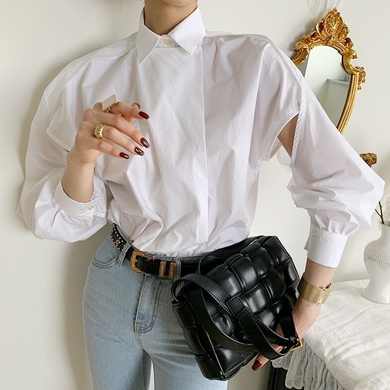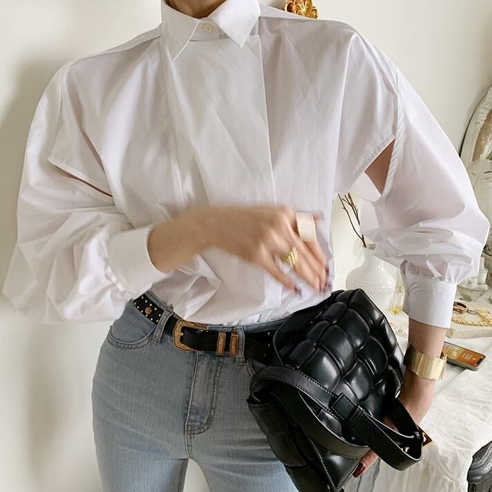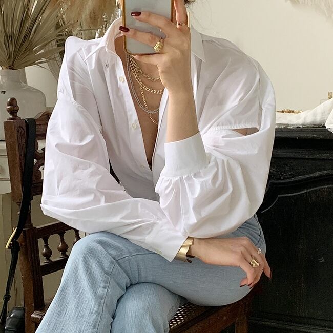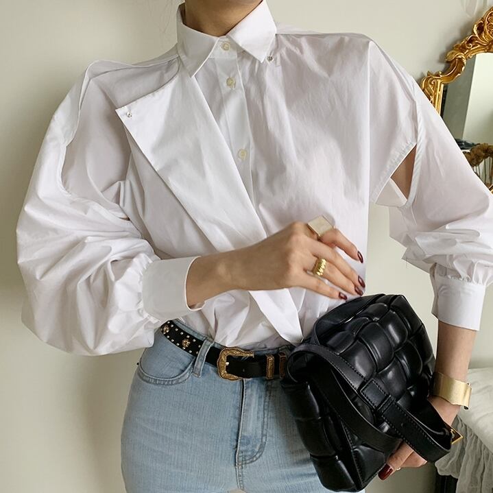 アシンメトリーな切り替えとカットアウトが個性的なシャツブラウスです。