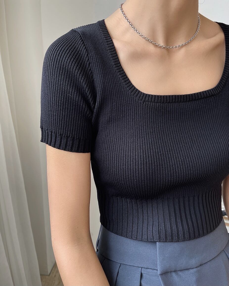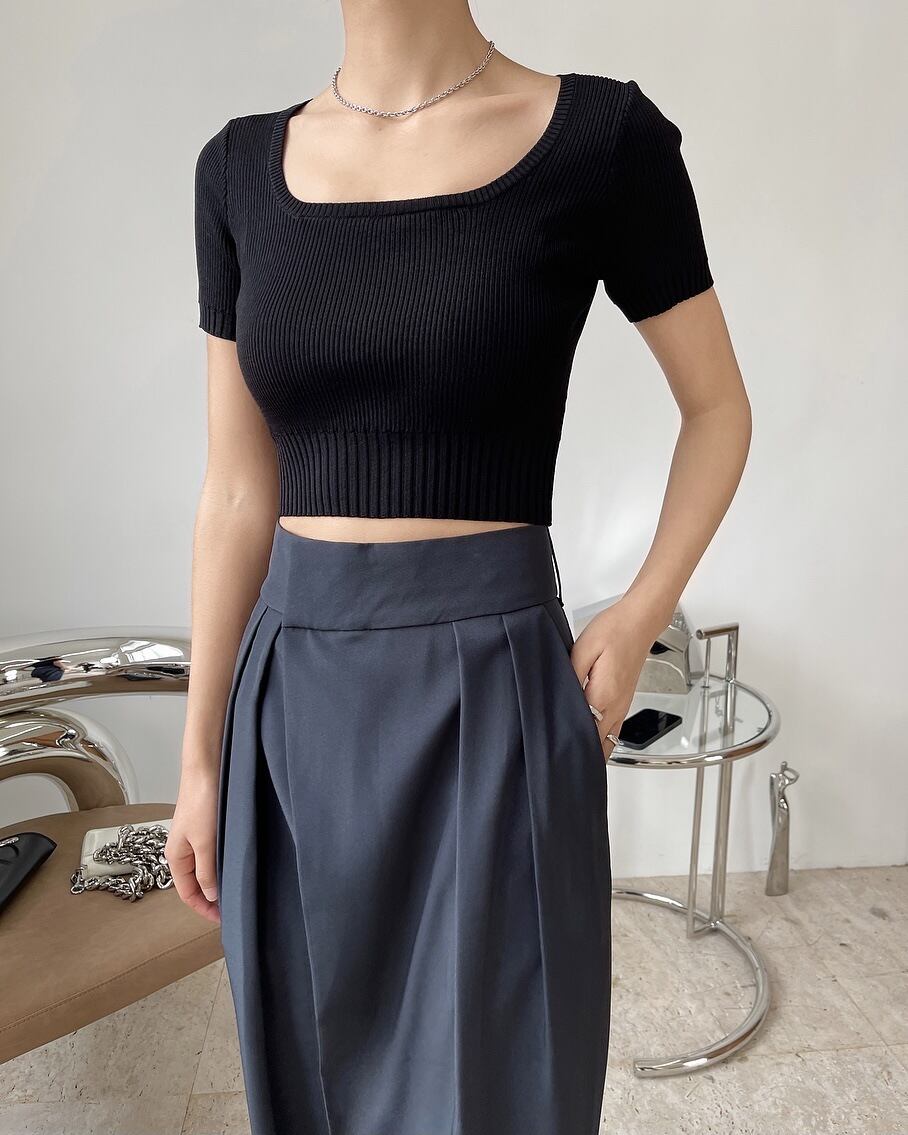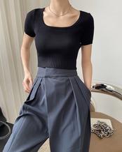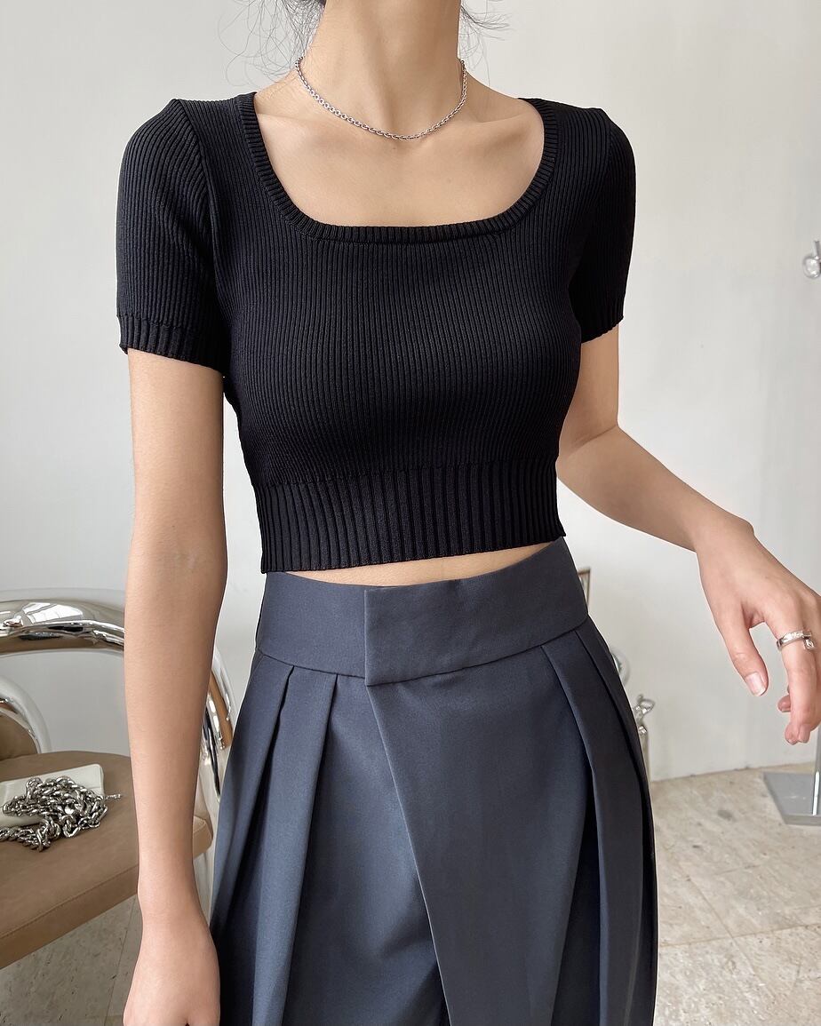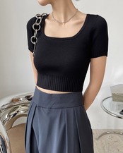 ワイドなUネックがデコルテを綺麗に見せてくれるクロップ丈ニットソー。