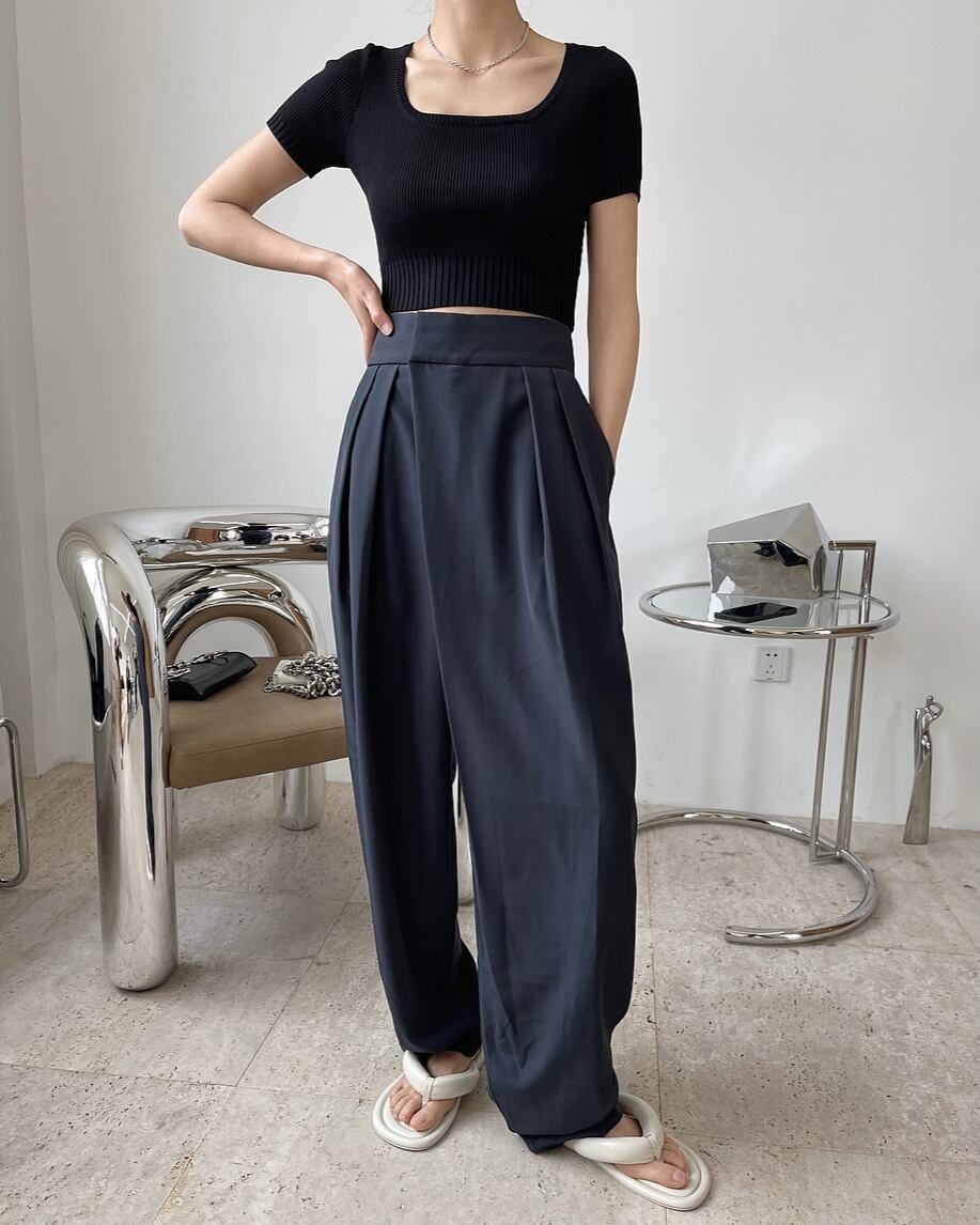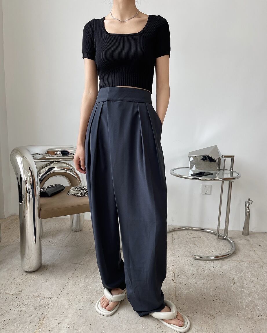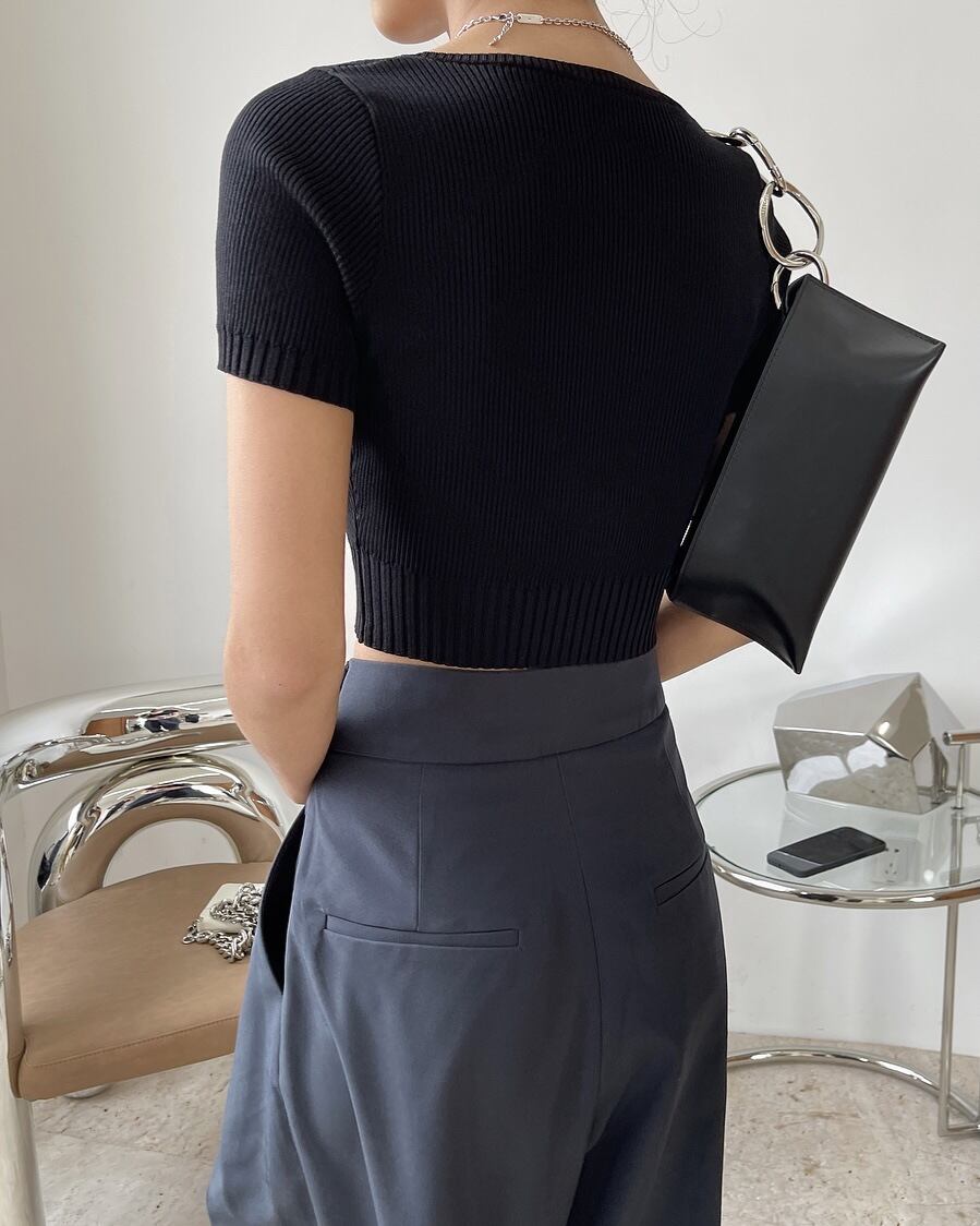 ワイドなUネックがデコルテを綺麗に見せてくれるクロップ丈ニットソー。