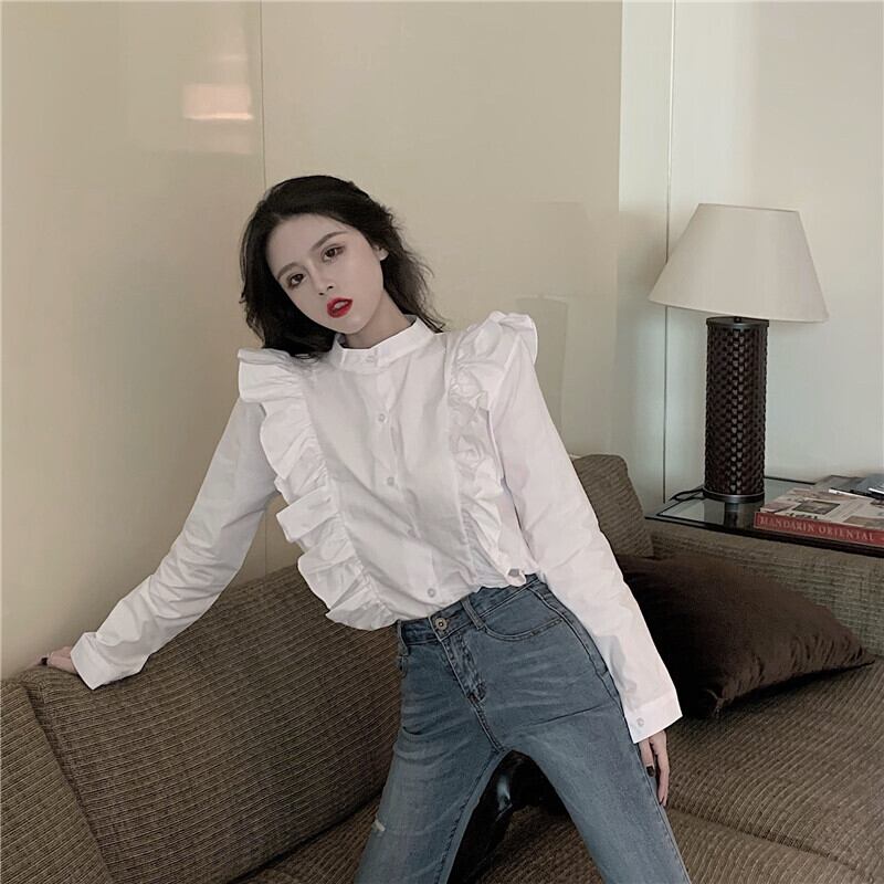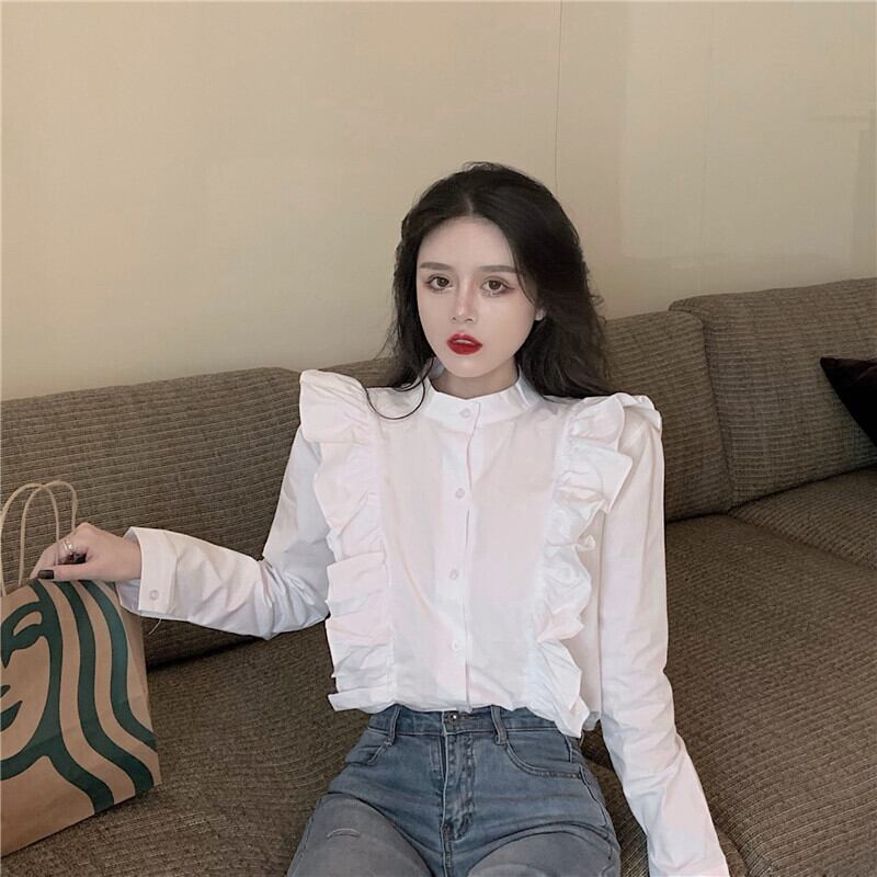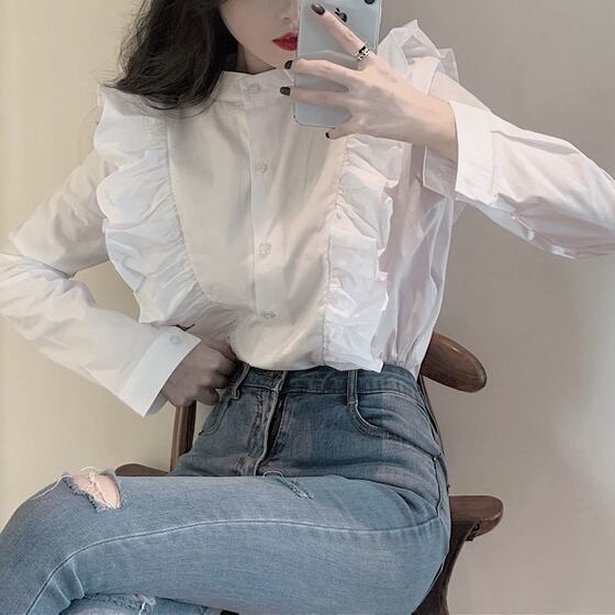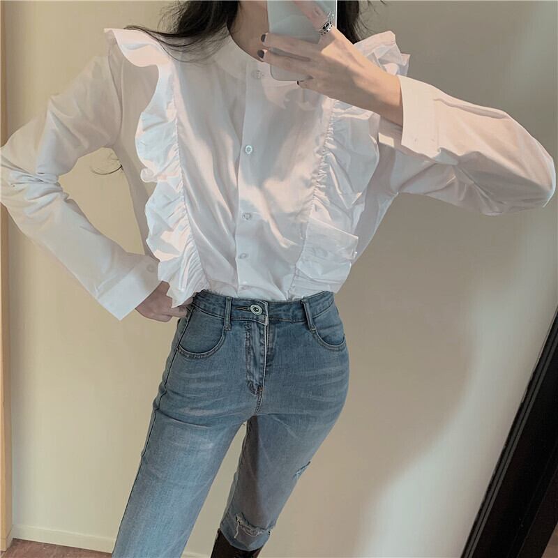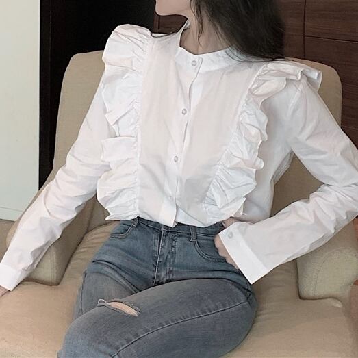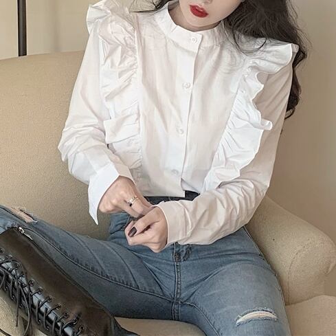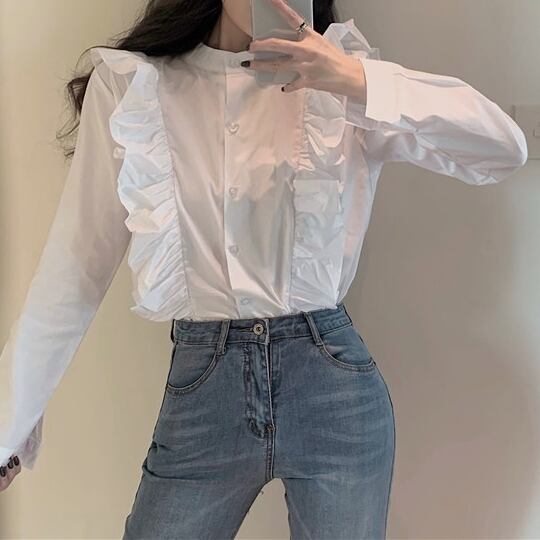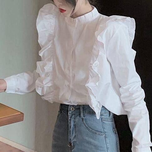 トップス シャツ ブラウス 袖あり 長袖 ボリューム袖 バンドカラー フリル ガーリー かわいい 大人可愛い ピンタック きれいめ カジュアル 大人 おしゃれ お洒落 レトロ 大人可愛い 大人女子 こなれ感 ラフ マニッシュ ラブリー キュート ガーリー 個性的 モード系 エレガント 主役級 存在感 抜け感 花柄 フラワー 春 秋 10代 20代 30代 40代 レディース 女性用 オフィス OL 通勤 学生 通学 デート お出かけ 公園デビュー 女子会 休日 ホワイト