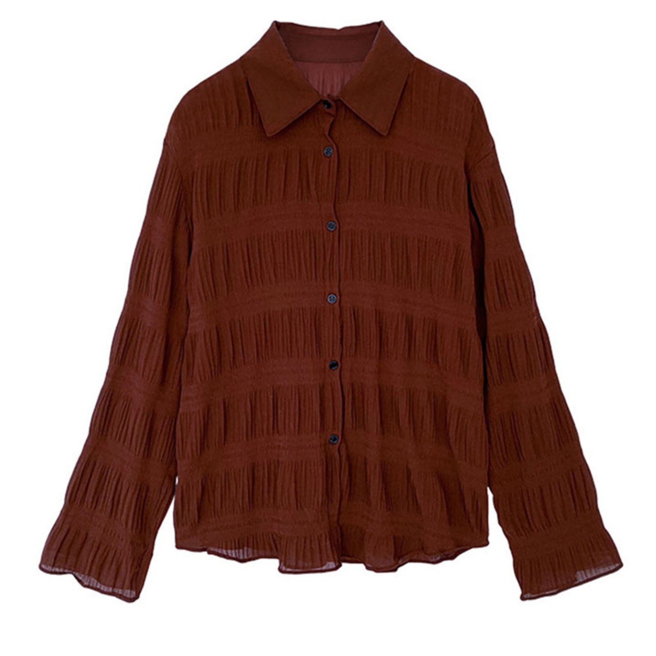 全体のシャーリング風しわ加工が可憐で上品なふんわりブラウスです。