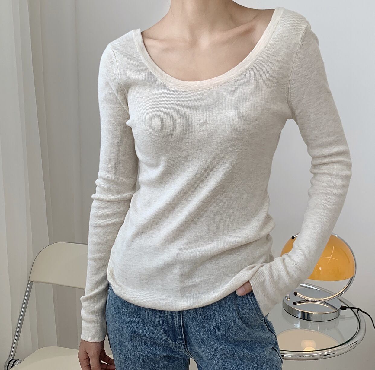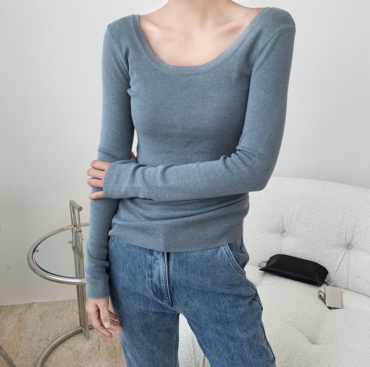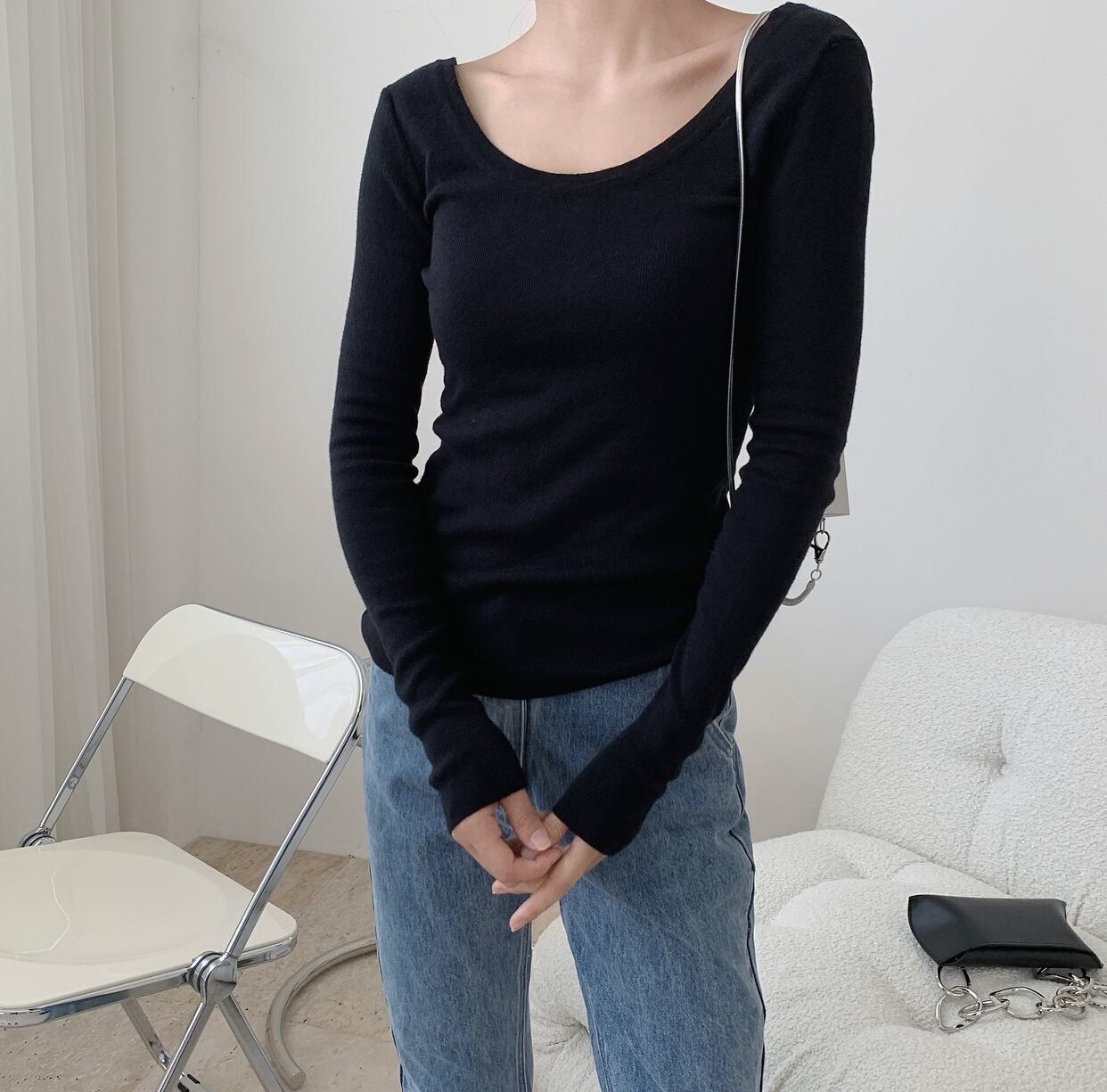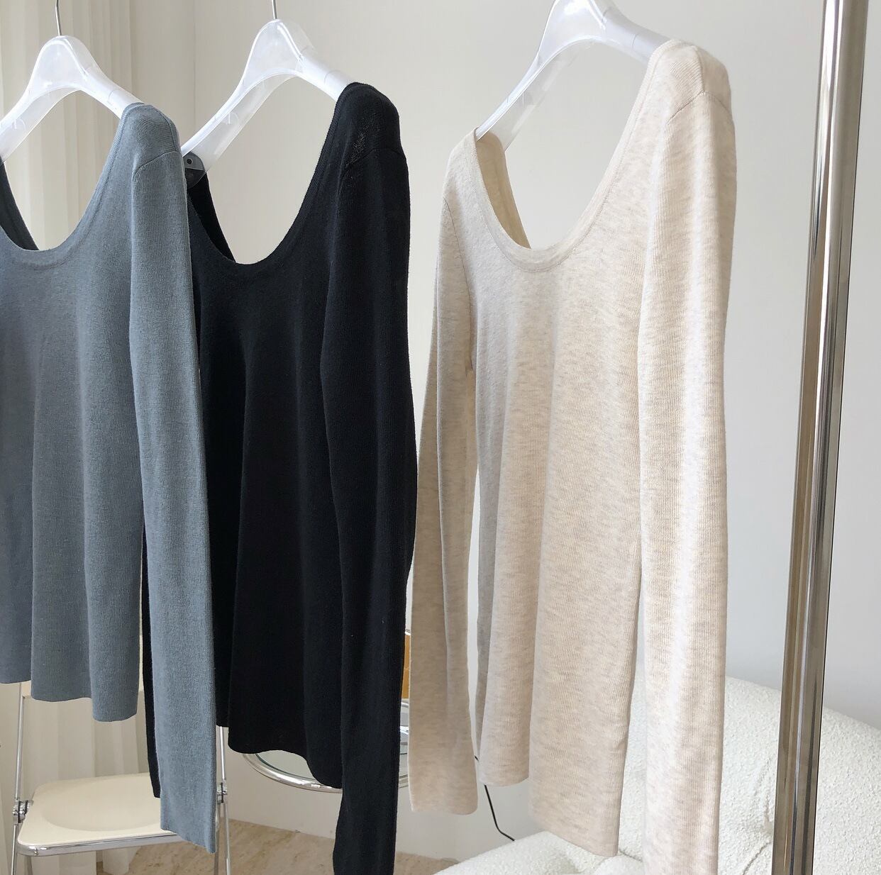 トップス ニットソー 袖あり 長袖 萌袖 Uネック 襟なし タイト 細身 ニット かわいい 大人可愛い きれいめ シンプル 大人 上品 おしゃれ 大人可愛い 大人女子 無地 秋 冬 10代 20代 30代 オフィス ビジネス OL 通勤 デート お出かけ 女子会 韓国系 オルチャン ファッション サイズ フリーサイズ 黒 ブラック ブルー グレー ベージュ くすみカラー 大人カラー