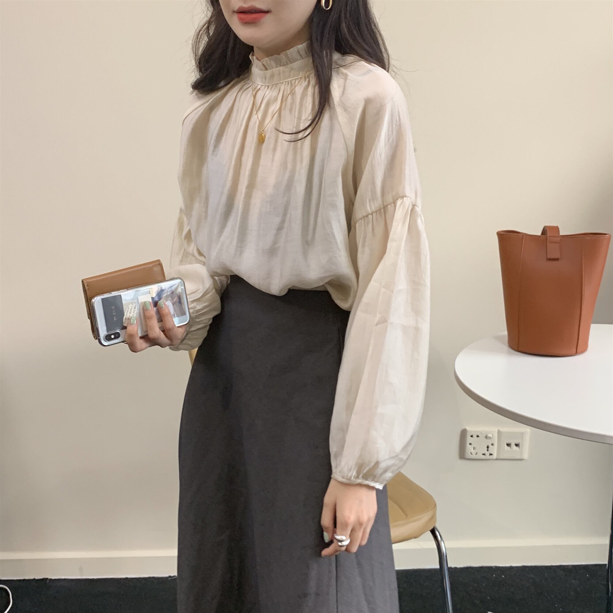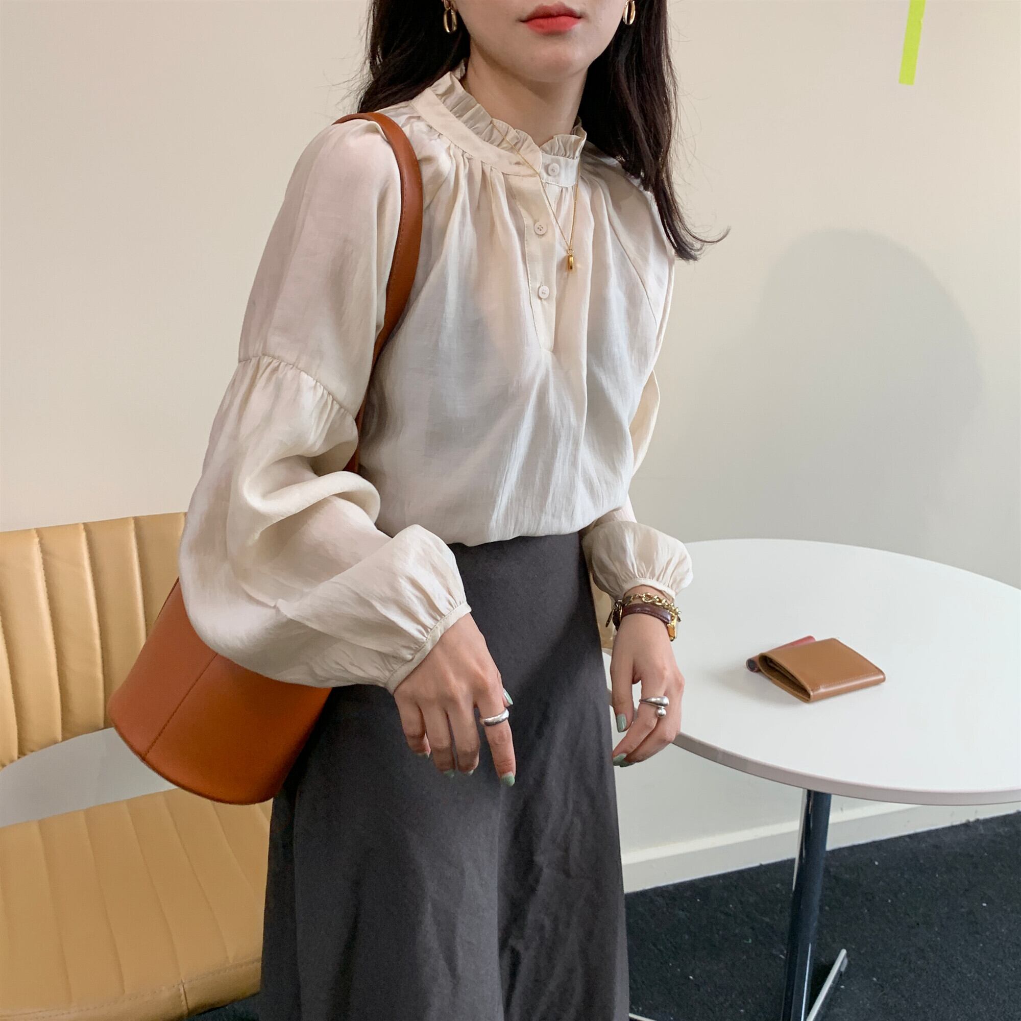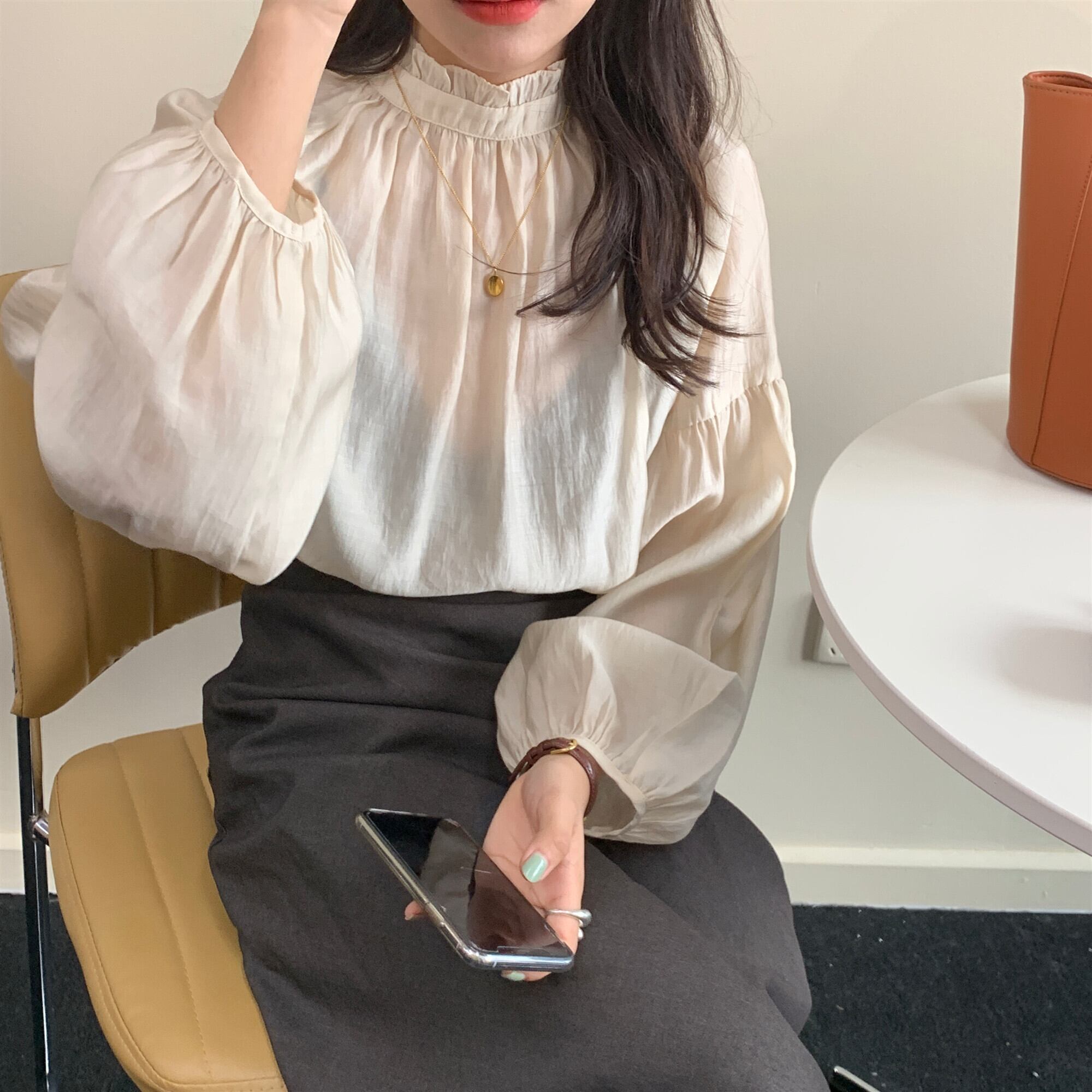 トップス ボリュームスリーブ シアー ブラウス バックボタン フリル ドロップショルダー スタンドカラー 長袖 コンシャス シフォン おすすめ おしゃれ お洒落 激安 安い 送料無料 プチプラ 可愛い かわいい 韓国 かっこいい カジュアル 大人 上品 きれいめ おしゃれ 大人可愛い 大人女子 モード系 オフィス ビジネス OL 通勤 デート お出かけ 女子会 レディース 女性用 20代 30代 ママ 着回し 普段使い 重ね着 オルチャン ファッション モテ アプリコット