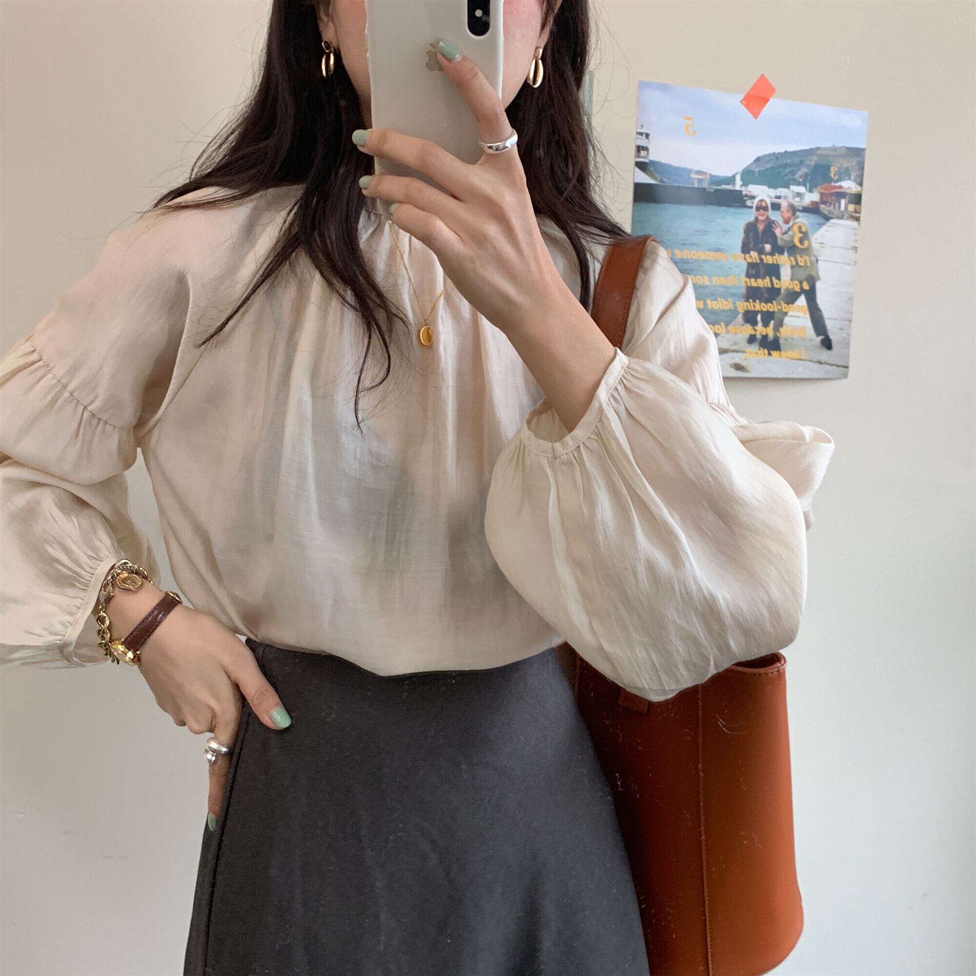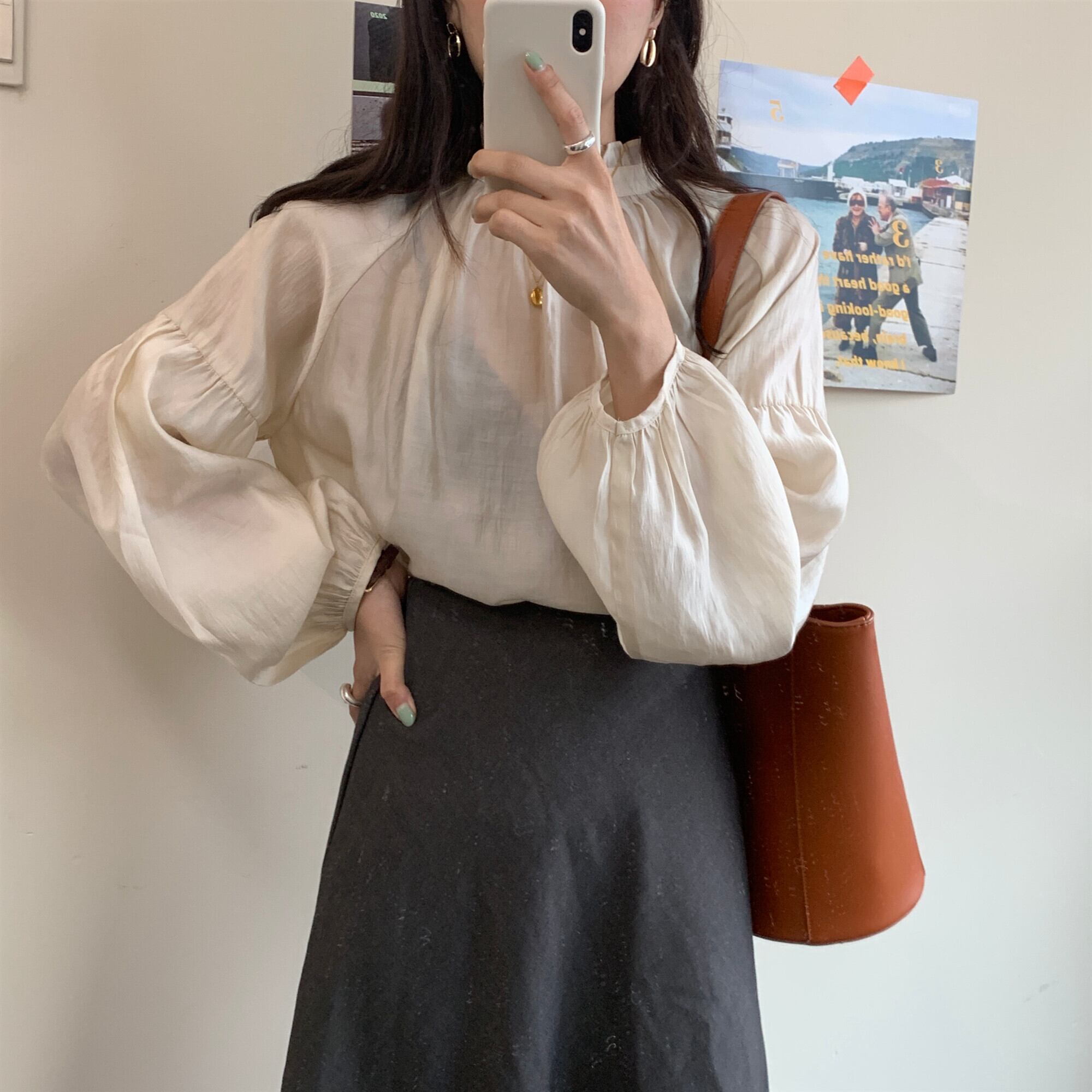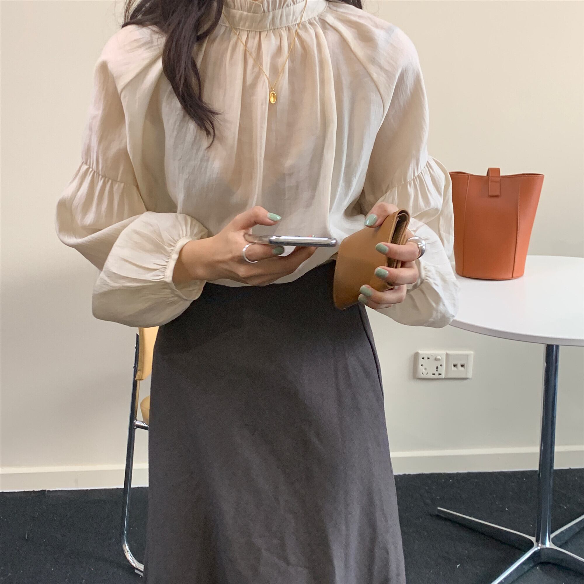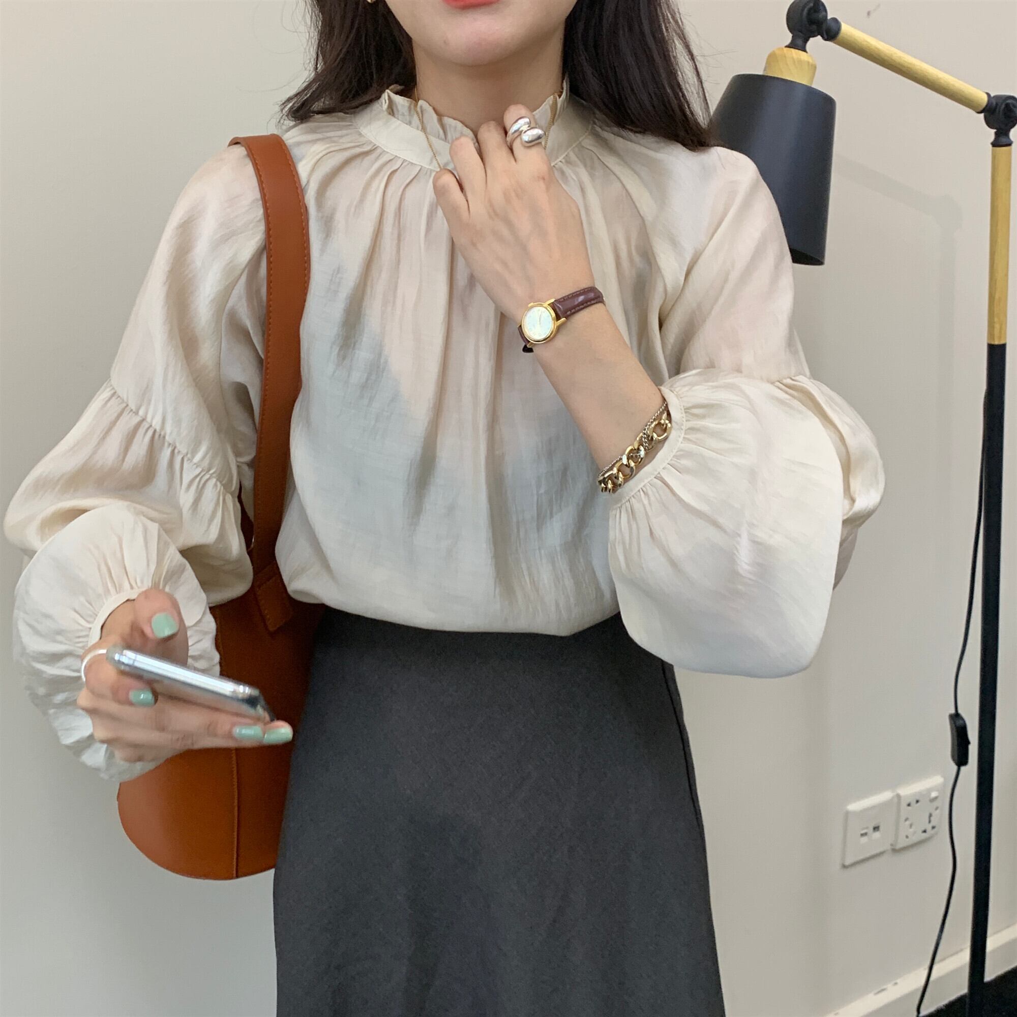 トップス ボリュームスリーブ シアー ブラウス バックボタン フリル ドロップショルダー スタンドカラー 長袖 コンシャス シフォン おすすめ おしゃれ お洒落 激安 安い 送料無料 プチプラ 可愛い かわいい 韓国 かっこいい カジュアル 大人 上品 きれいめ おしゃれ 大人可愛い 大人女子 モード系 オフィス ビジネス OL 通勤 デート お出かけ 女子会 レディース 女性用 20代 30代 ママ 着回し 普段使い 重ね着 オルチャン ファッション モテ アプリコット