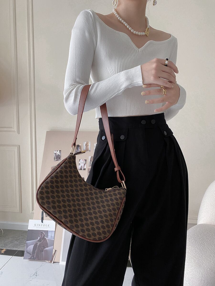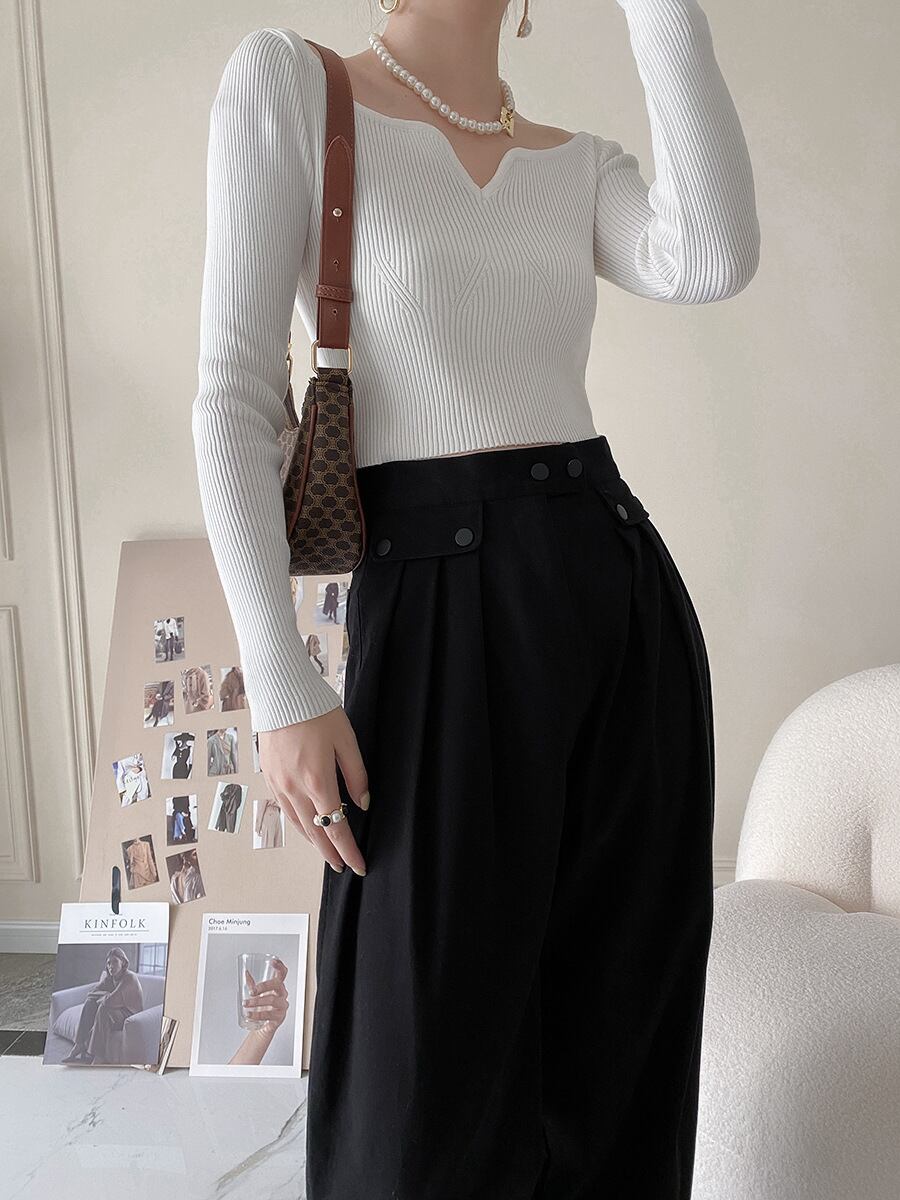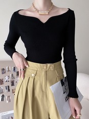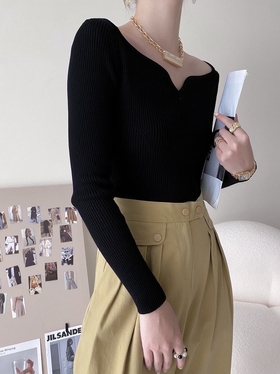 大きめに開いた首元とVカットが入った胸元がポイントのリブニットです。