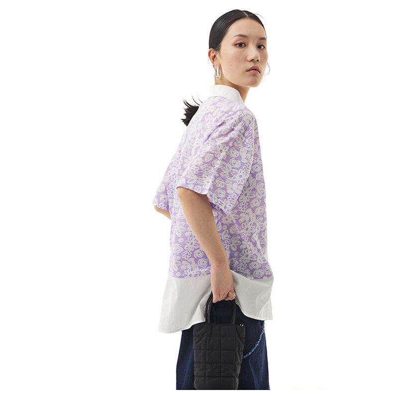 お花の細かいプリントとシンプルな無地カラーのおしゃれシャツ