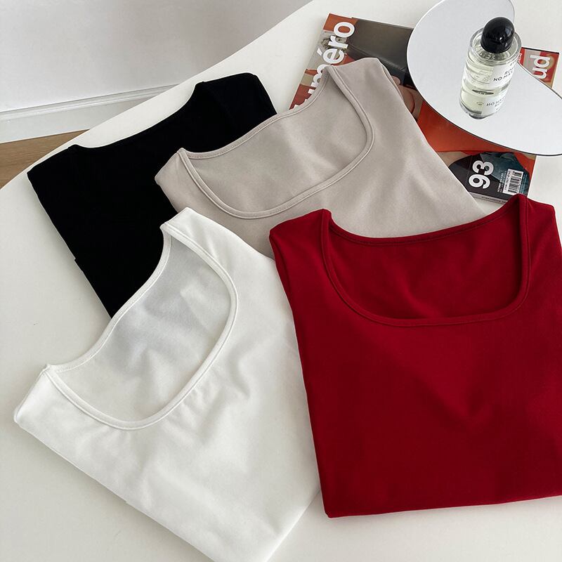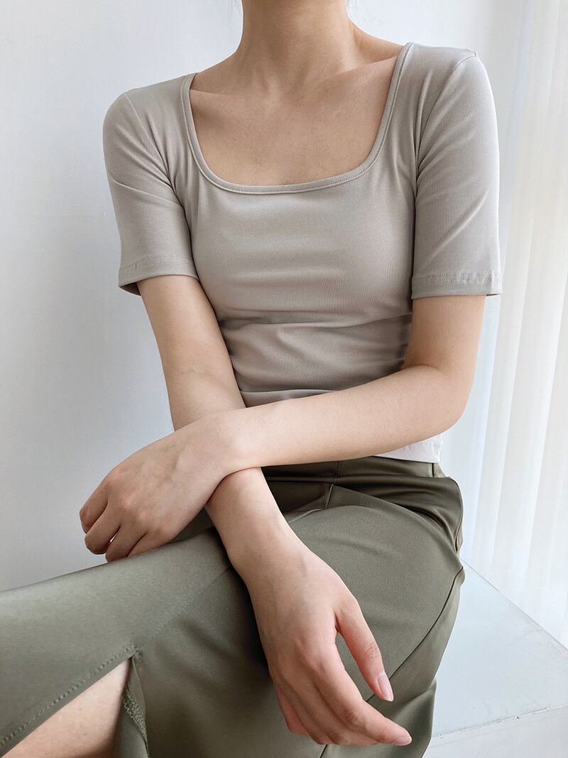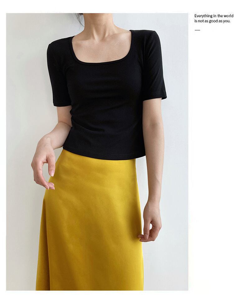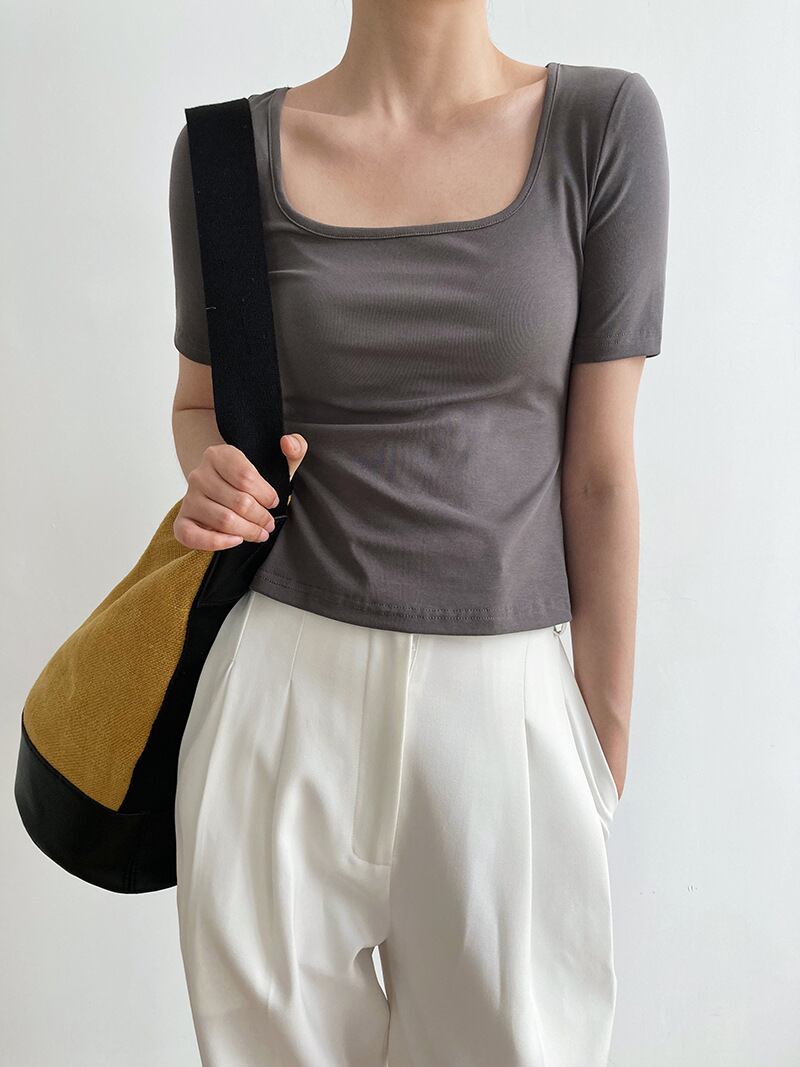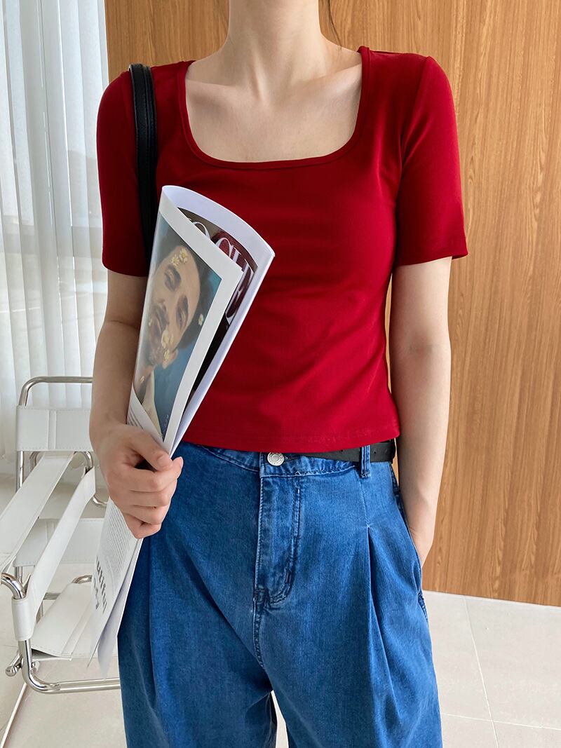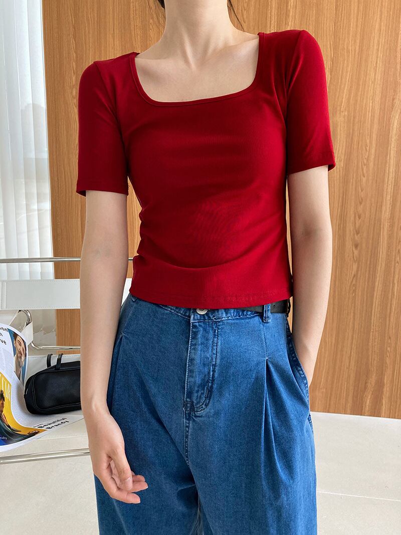 トップス Tシャツ ショート丈 袖あり 半袖 Uネック タイト 綿 かわいい シンプル カジュアル ラフ スポーティー ラブリー モード系 無地 夏 10代 20代 レディース 着回し 普段使い 重ね着 コーデ 楽ちん M L 白 ホワイト 黒 ブラック 赤 レッド 灰色 グレー カラバリ