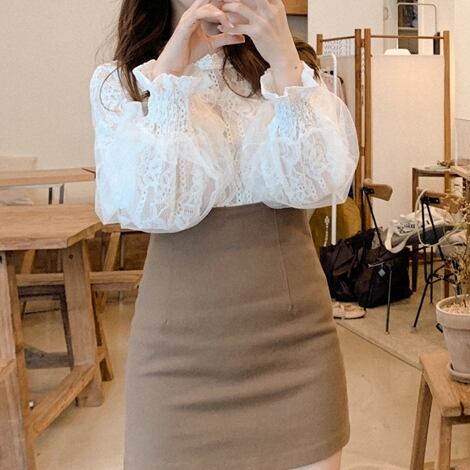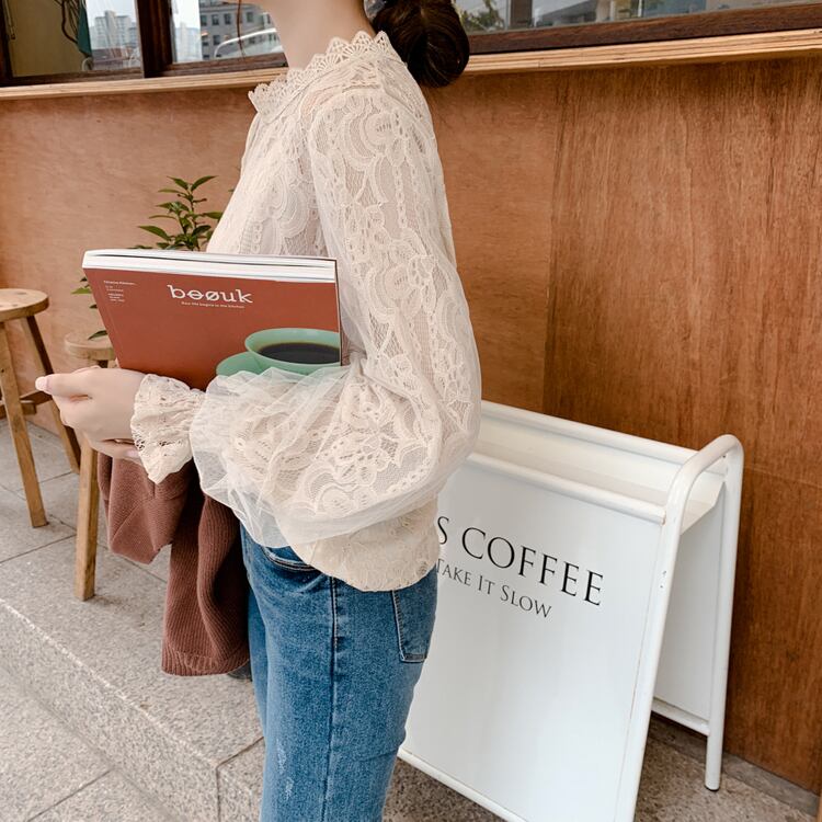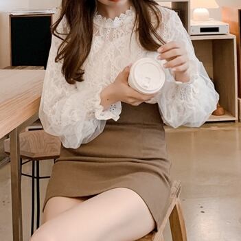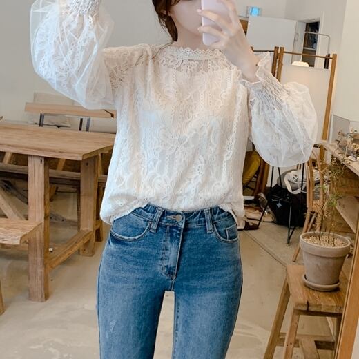 花柄総レースの透け感を活かしたハイネックブラウスです。