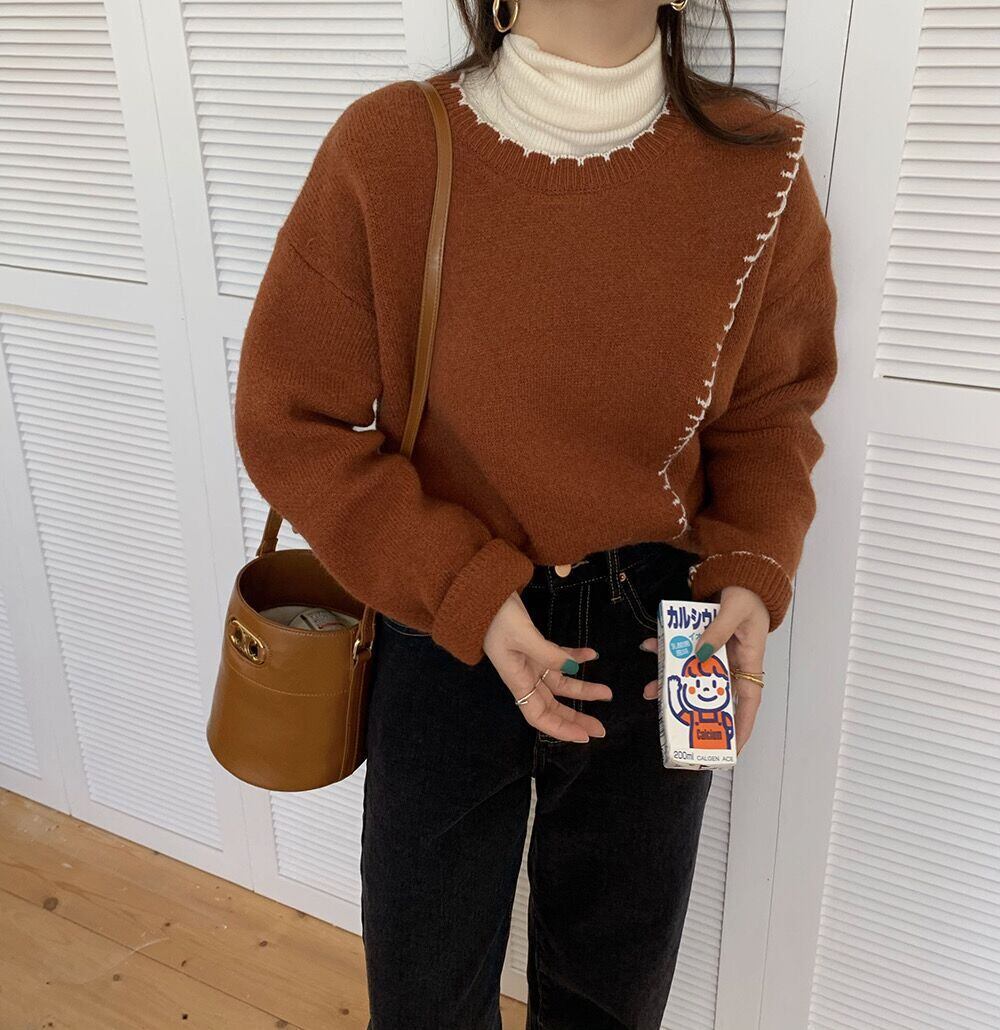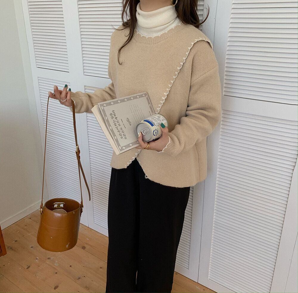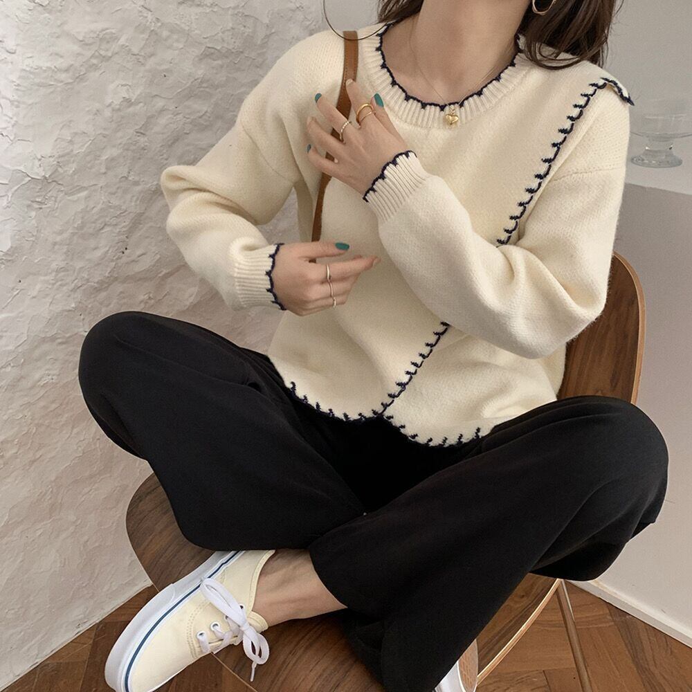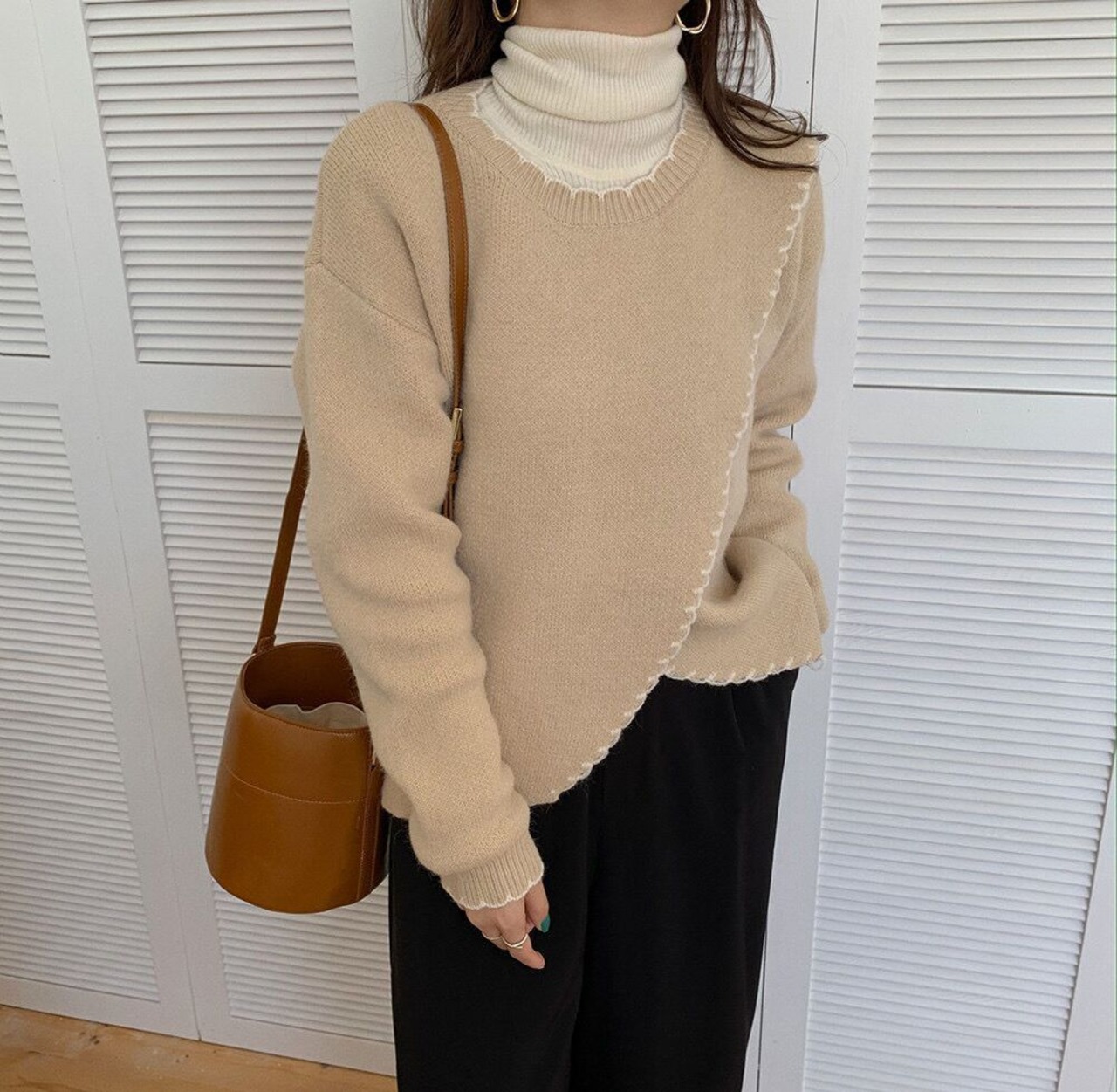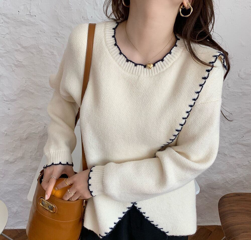 首周りと袖周り、フロント部分のパイピングステッチがポイントのニットトップス。