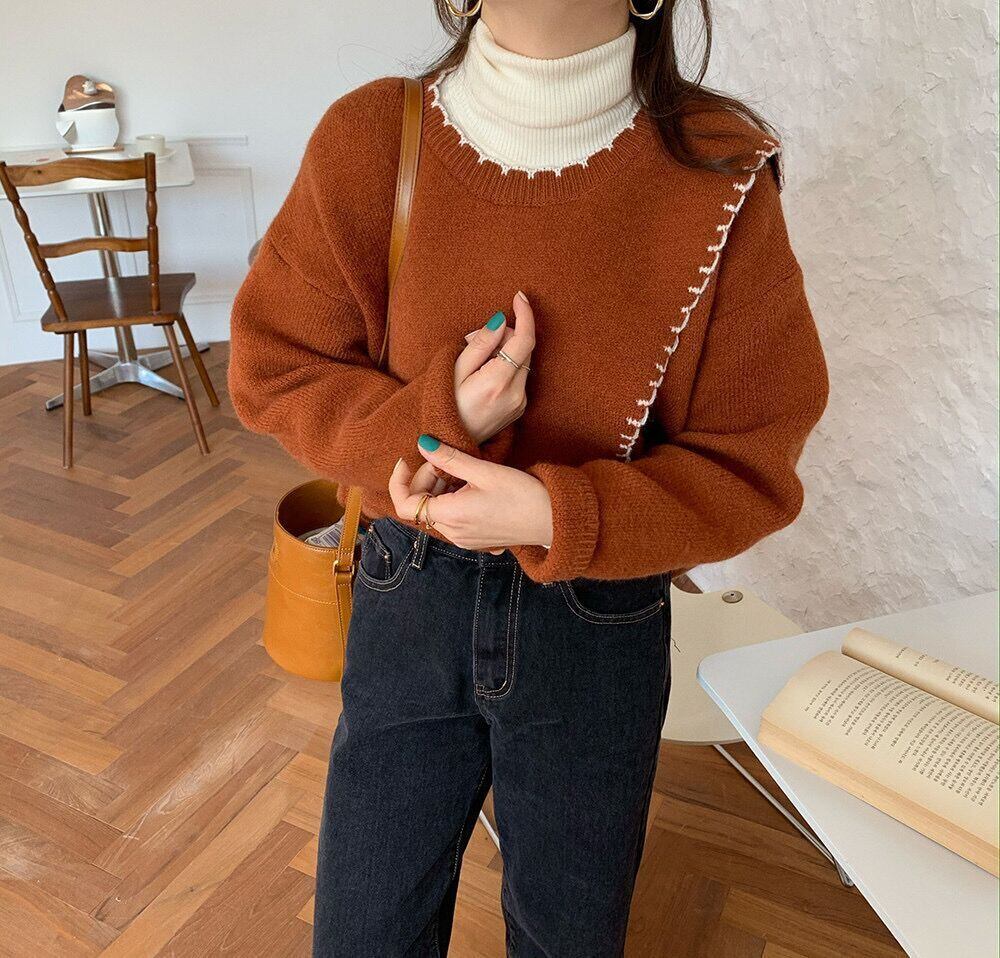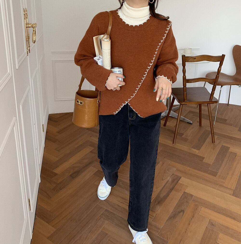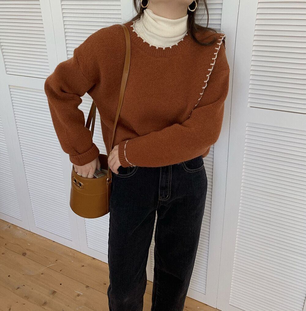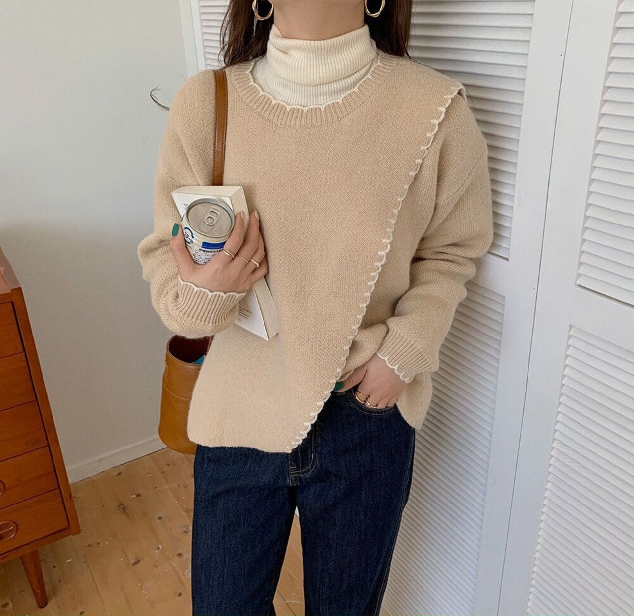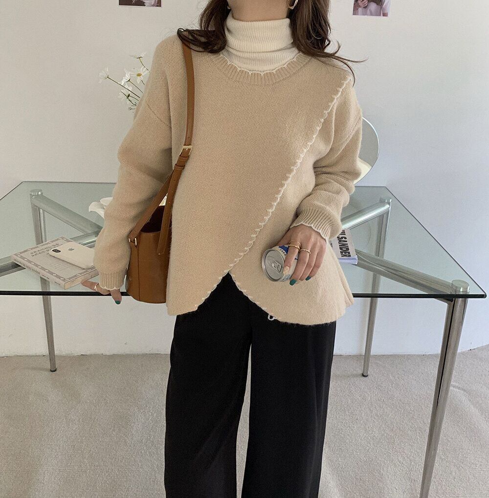 首周りと袖周り、フロント部分のパイピングステッチがポイントのニットトップス。
