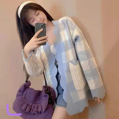 チェック柄×ケーブルニットの左右でデザインが違うカーディガン♪