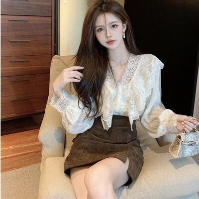 首回りをスッキリとみせてくれるVネックが目を惹くポイントのブラウス。