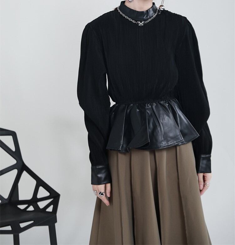 トップス ブラウス 長袖 秋 冬 オータム ウィンター 個性的 無地 ブラック 黒 フリル ウエストマーク ウエスト切り替え 異素材ミックス ハイウエスト 脚長効果 スタイルアップ 大人 上品 女子 レディース ワンサイズ 普段使い 休日 ホリデー 着回し ヘビロテ デート 女子会 ランチ 買い物 旅行 高校生 10代 20代 30代 袖あり 可愛い かわいい きれいめ 綺麗系 クール べプラム ハイネック ショート丈