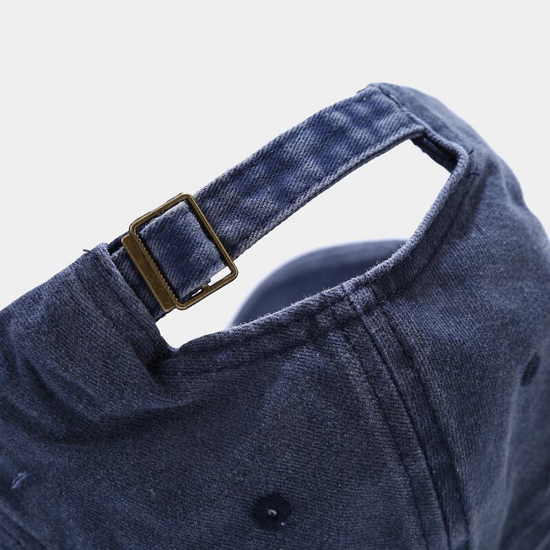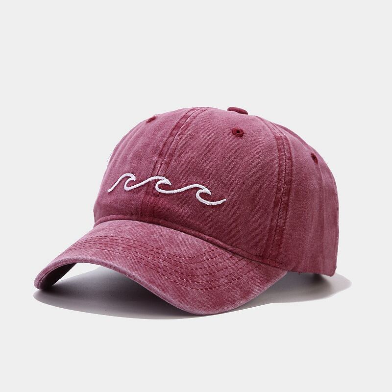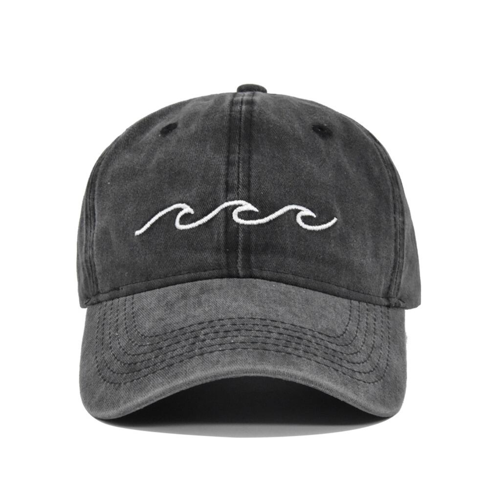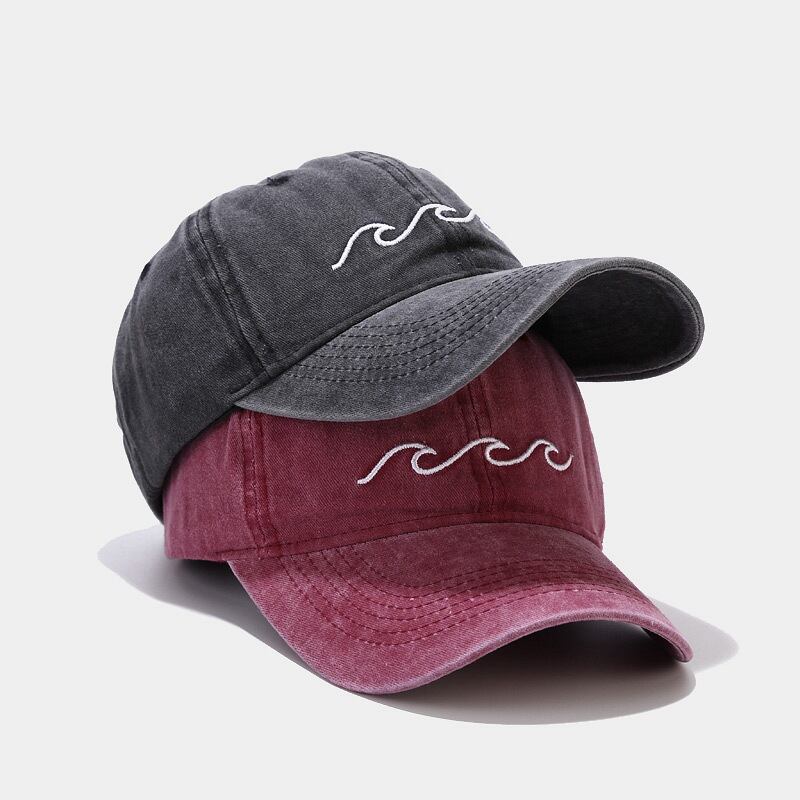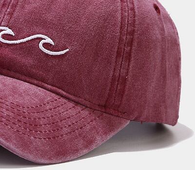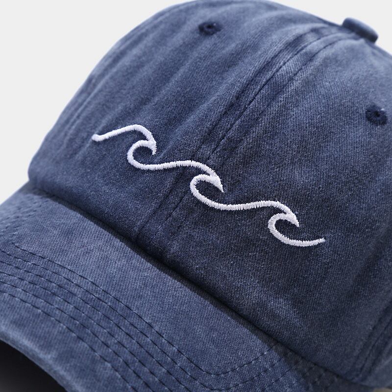 何度か洗ったようなユーズド感のある生地に波模様の刺繍が入ったシンプルでお洒落なキャップです。