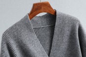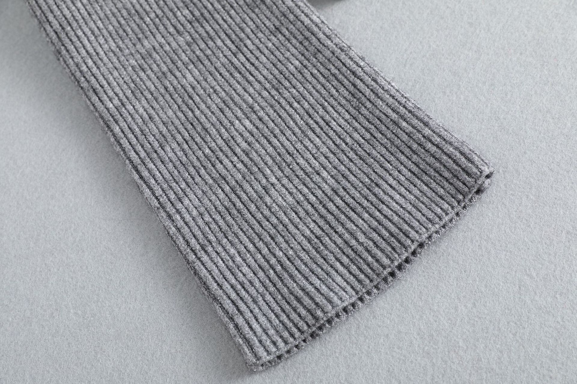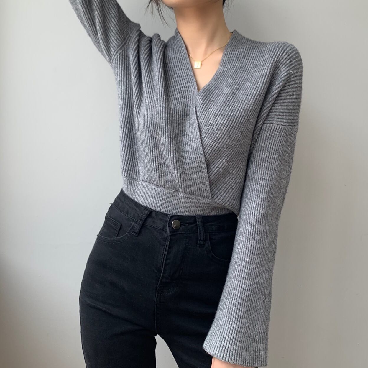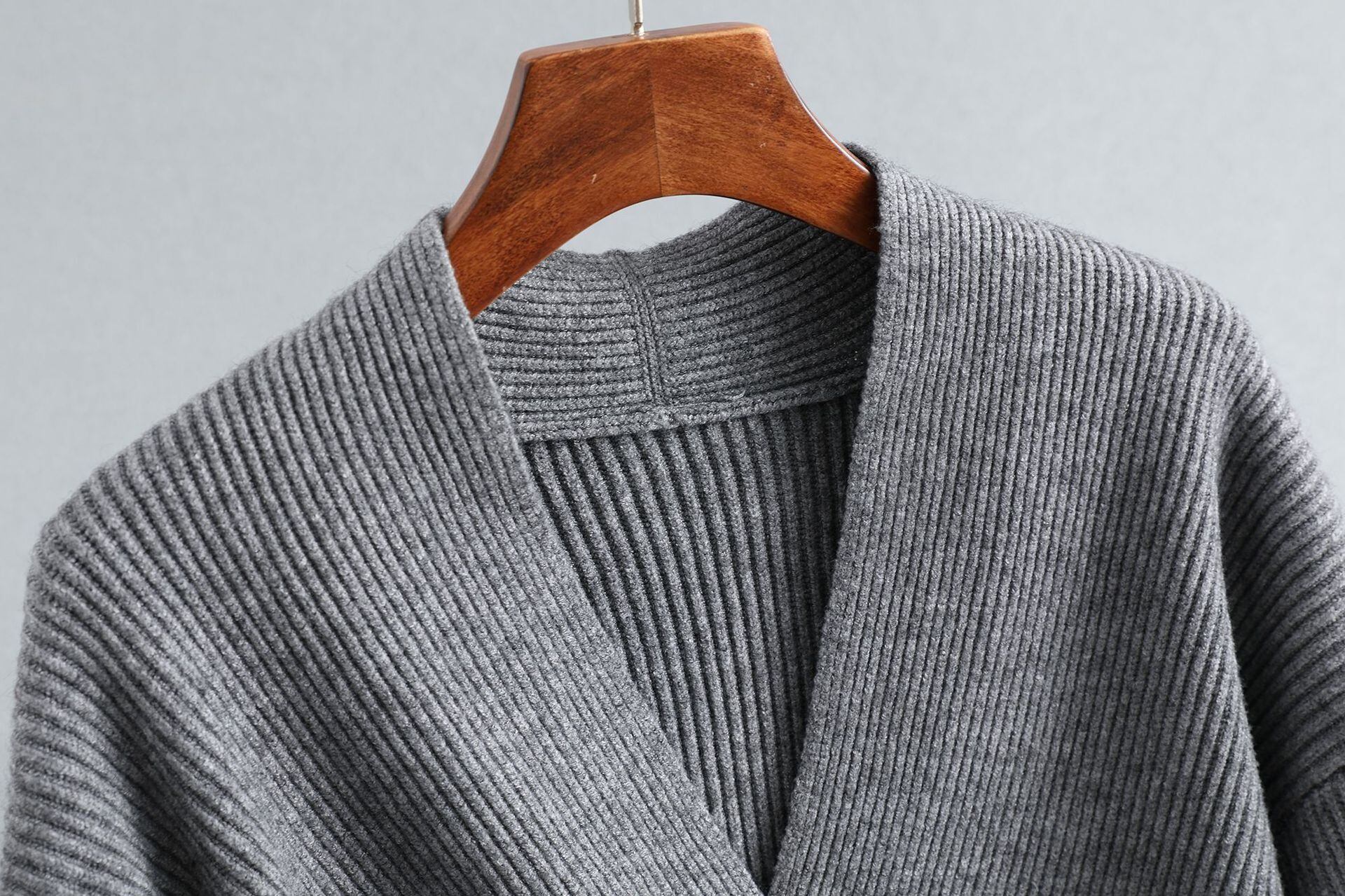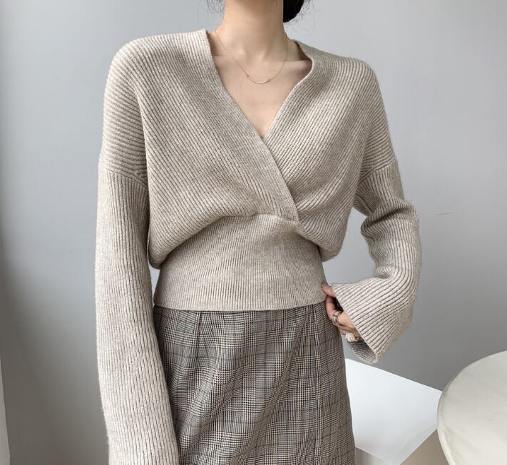 胸元を美しく魅せるVネックとウエストの切り返しがメリハリをつけ細めのリブ編みが縦のラインを主張したトップス。