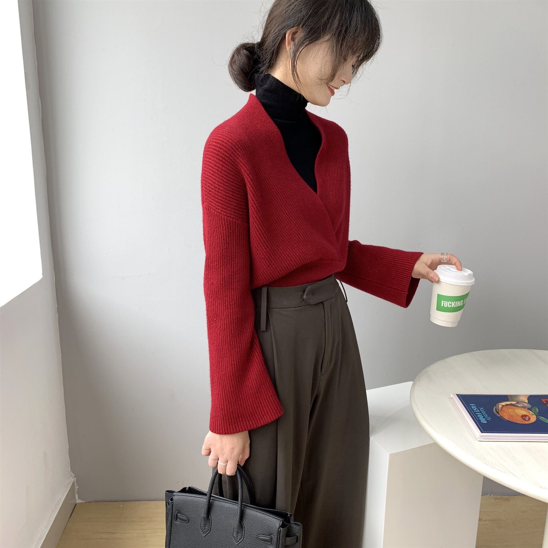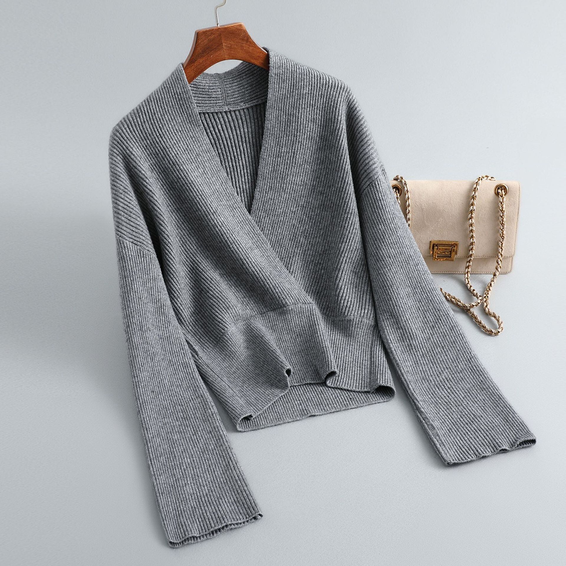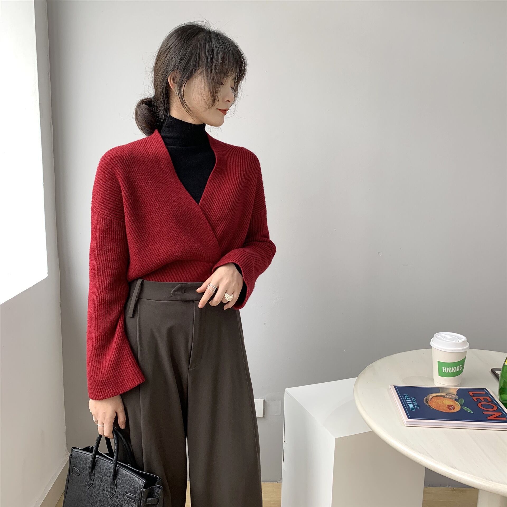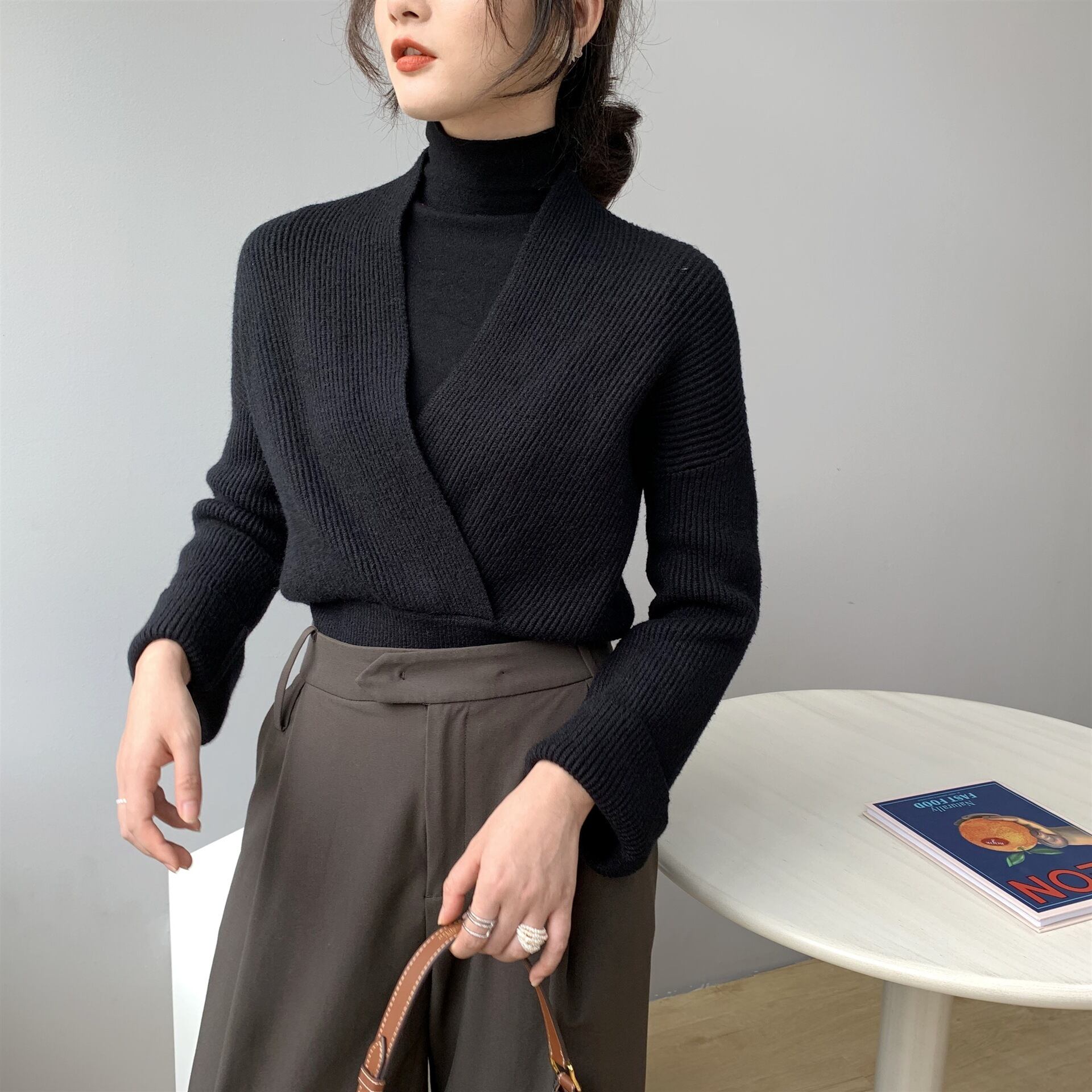 胸元を美しく魅せるVネックとウエストの切り返しがメリハリをつけ細めのリブ編みが縦のラインを主張したトップス。