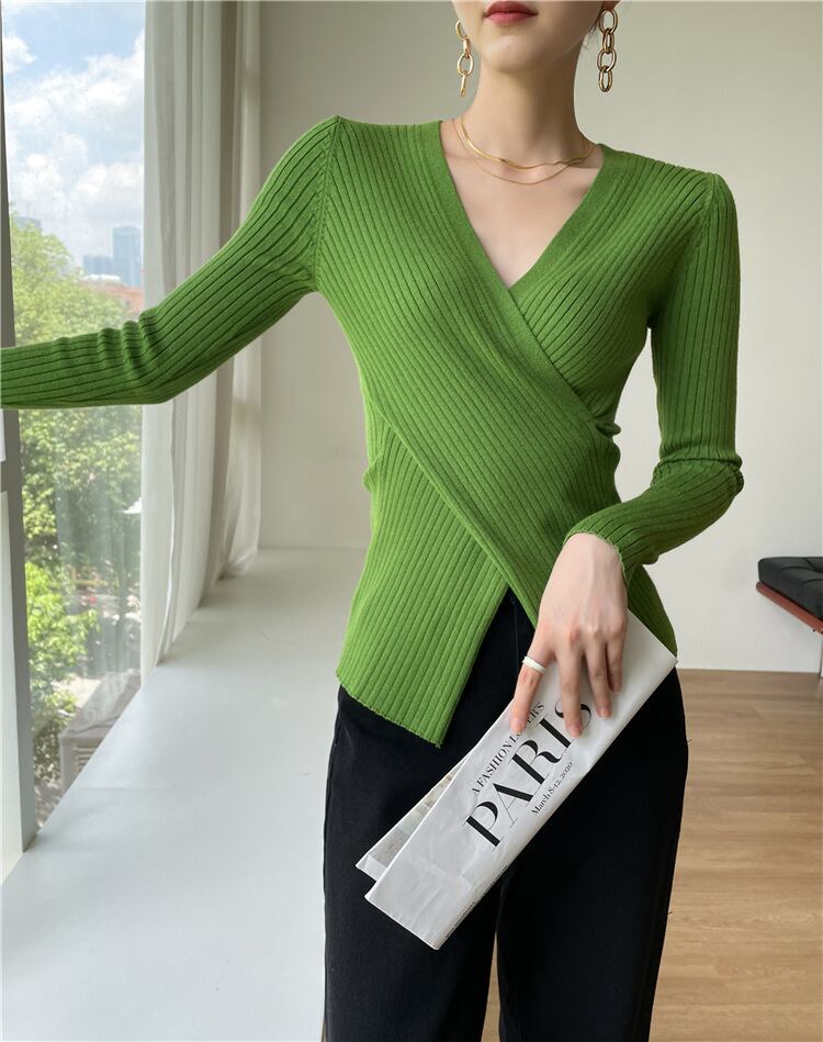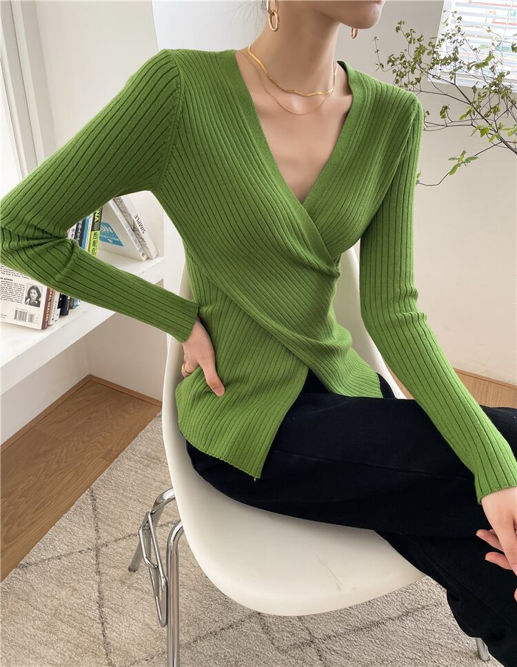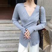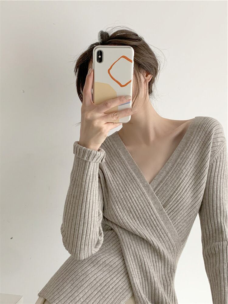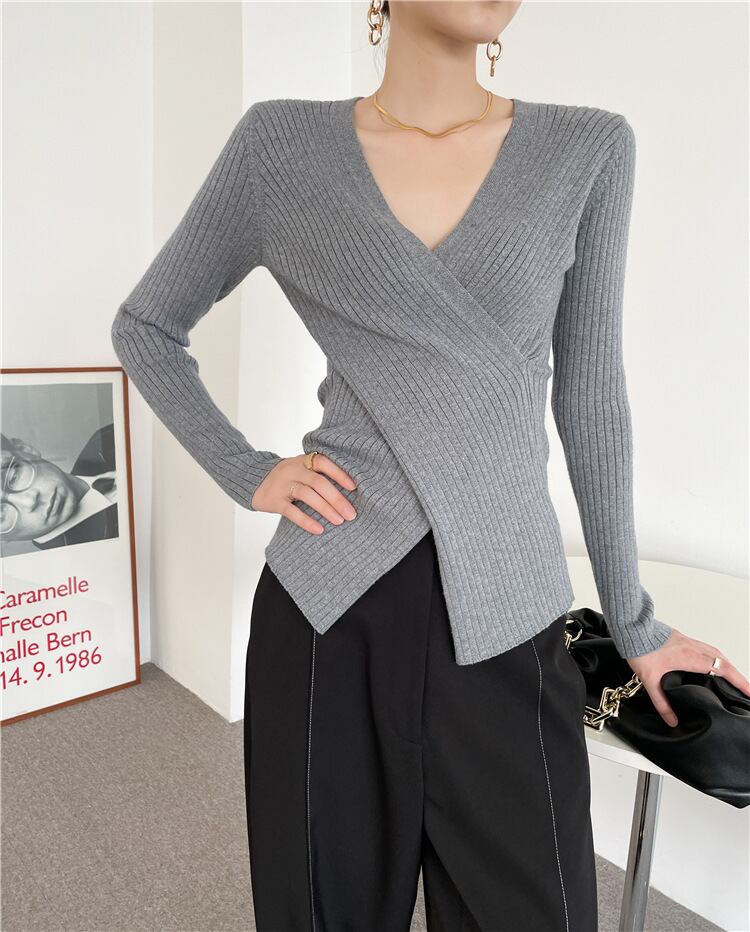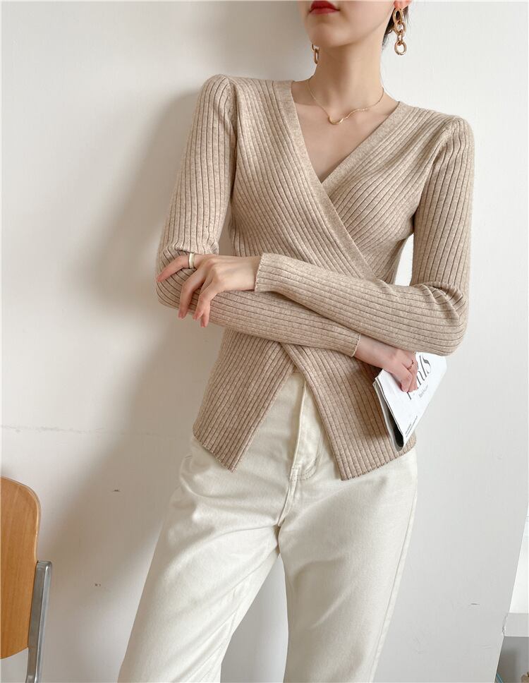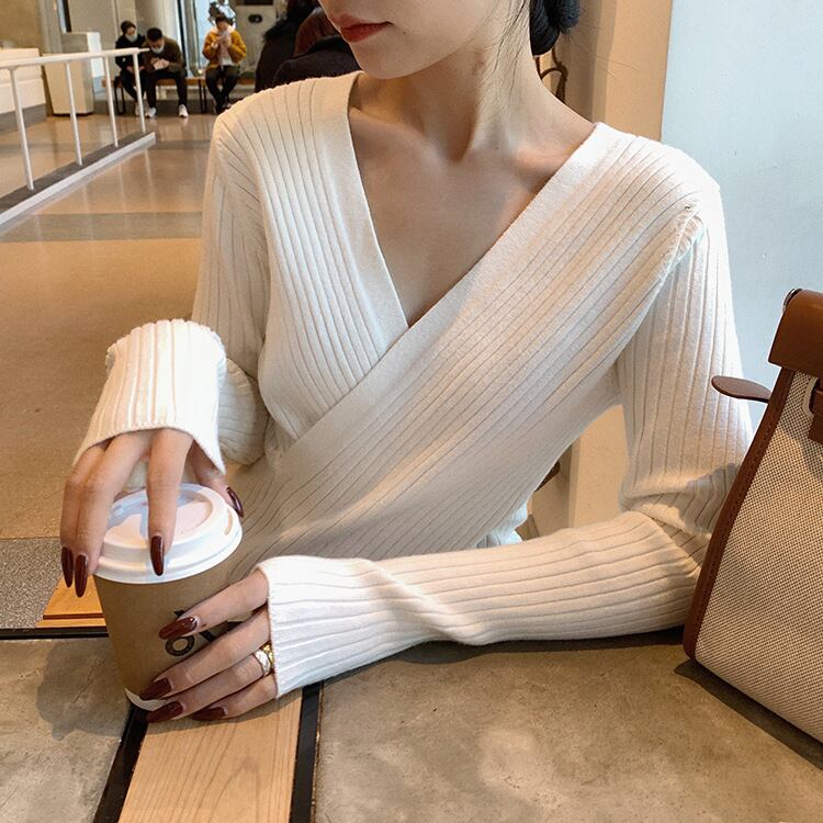 深めのVネックとタイトめのシルエットで女性らしさを演出してくれる。