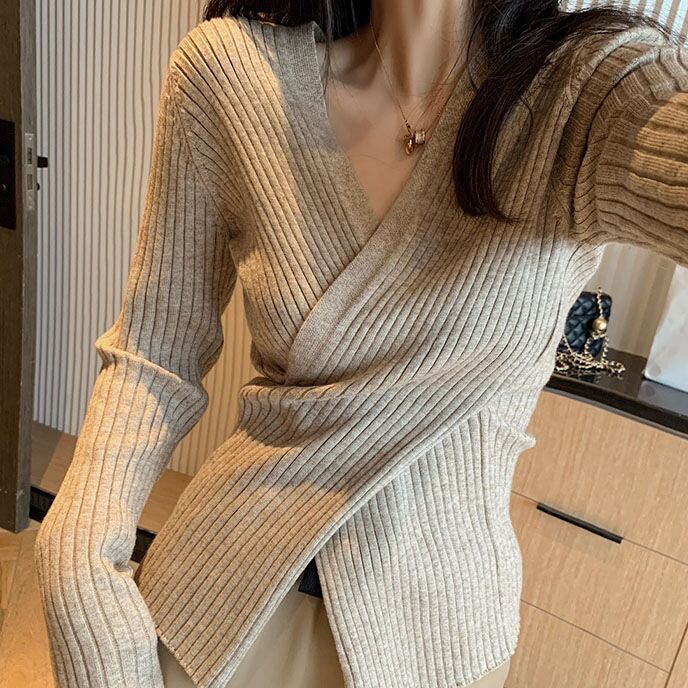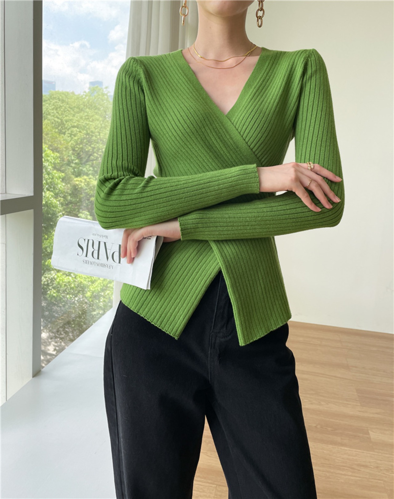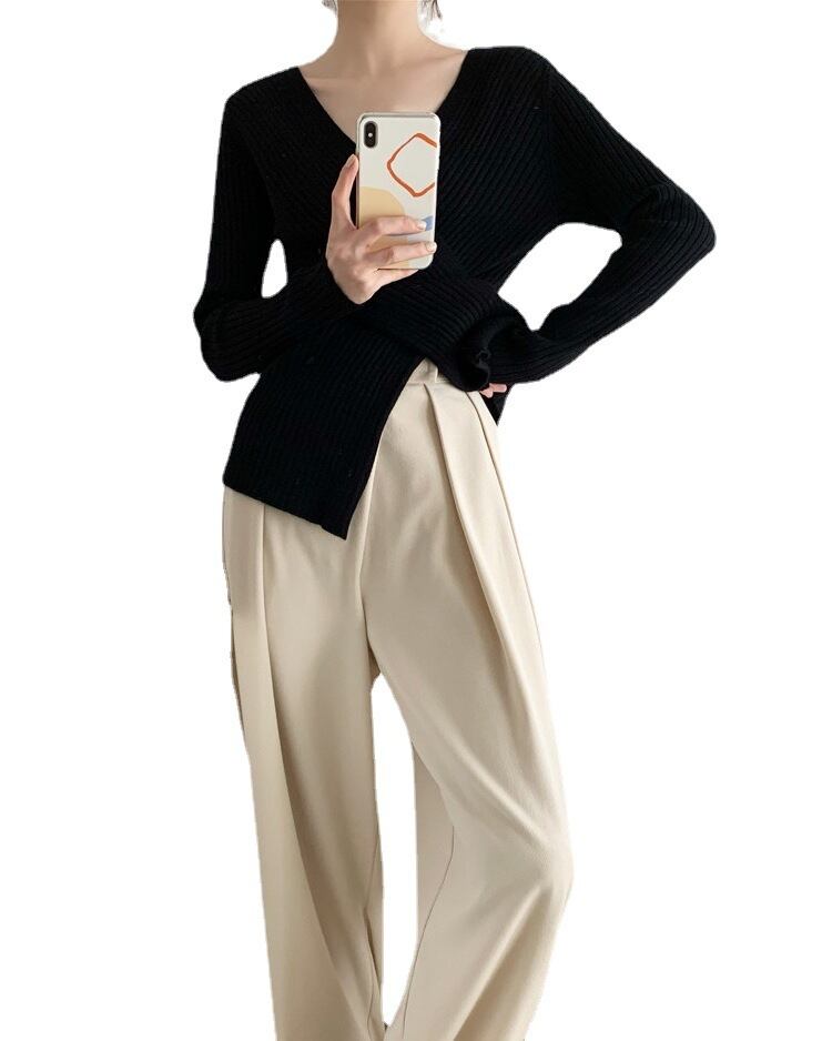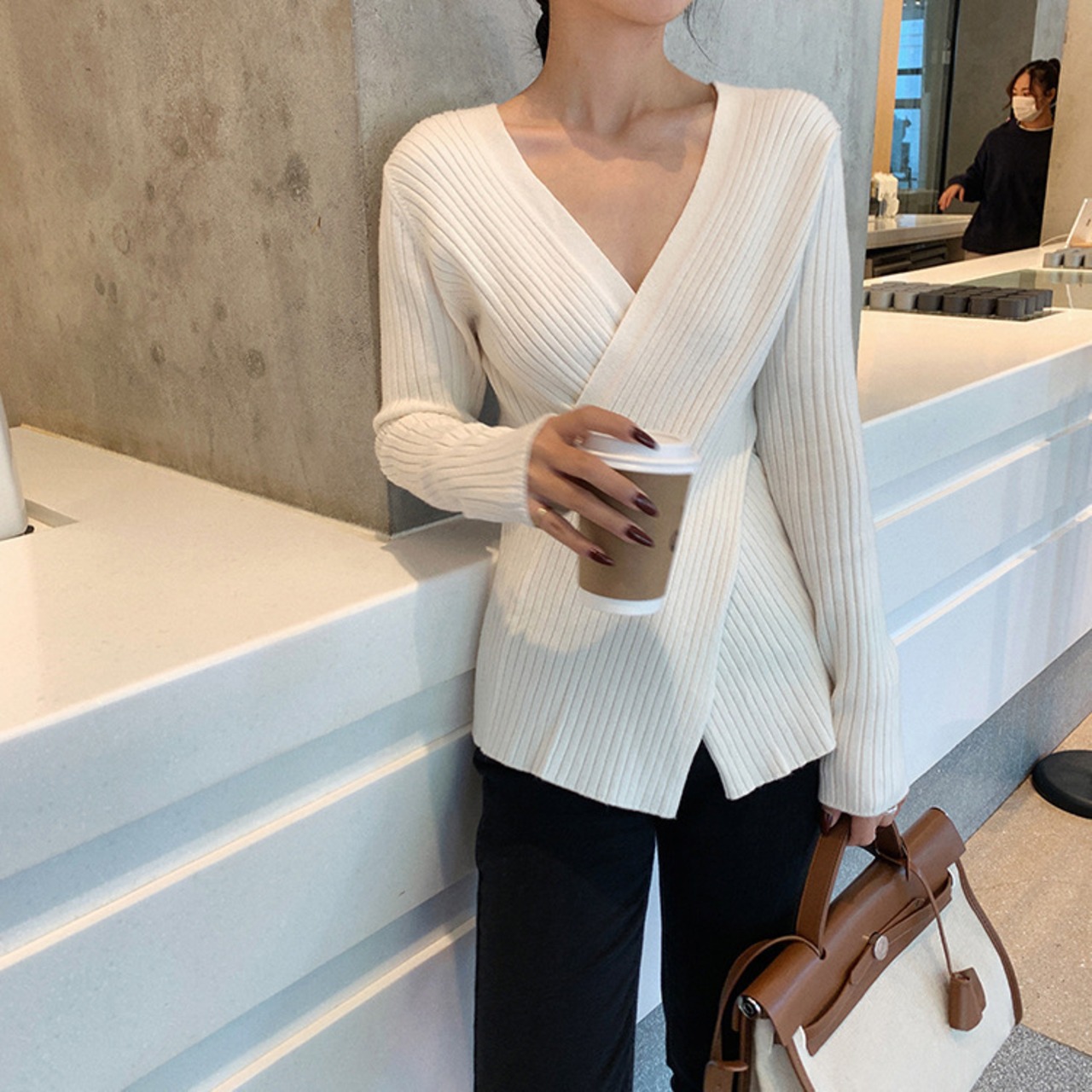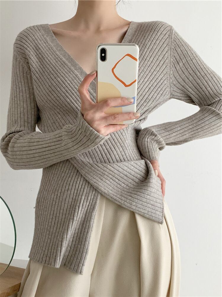 深めのVネックとタイトめのシルエットで女性らしさを演出してくれる。