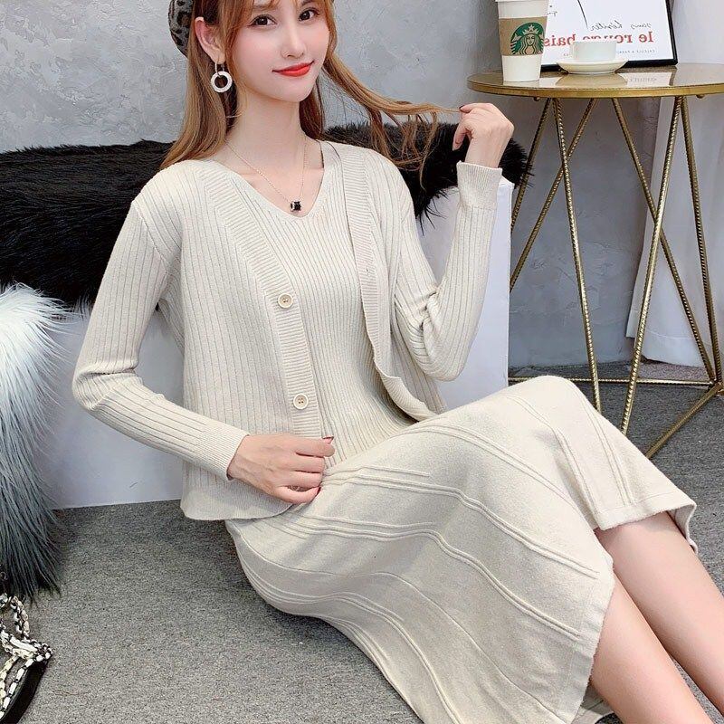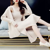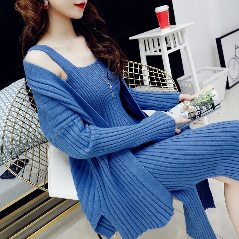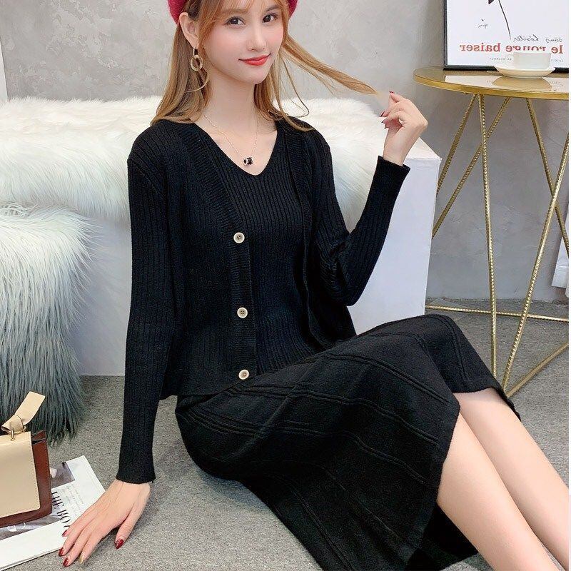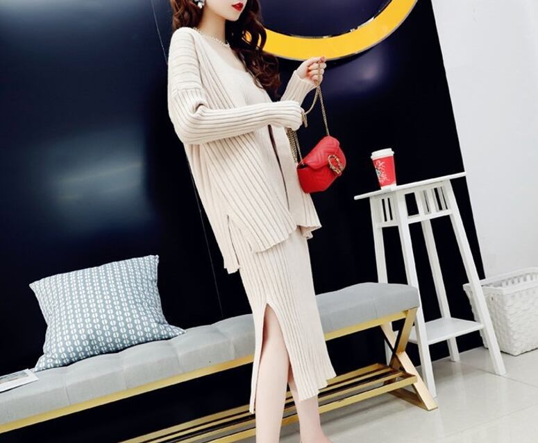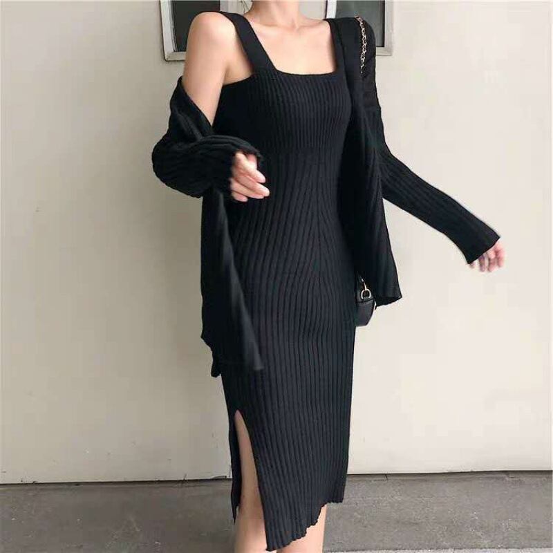 ニット長袖タイトワンピースの上からノースリーブのトップスを着ます。